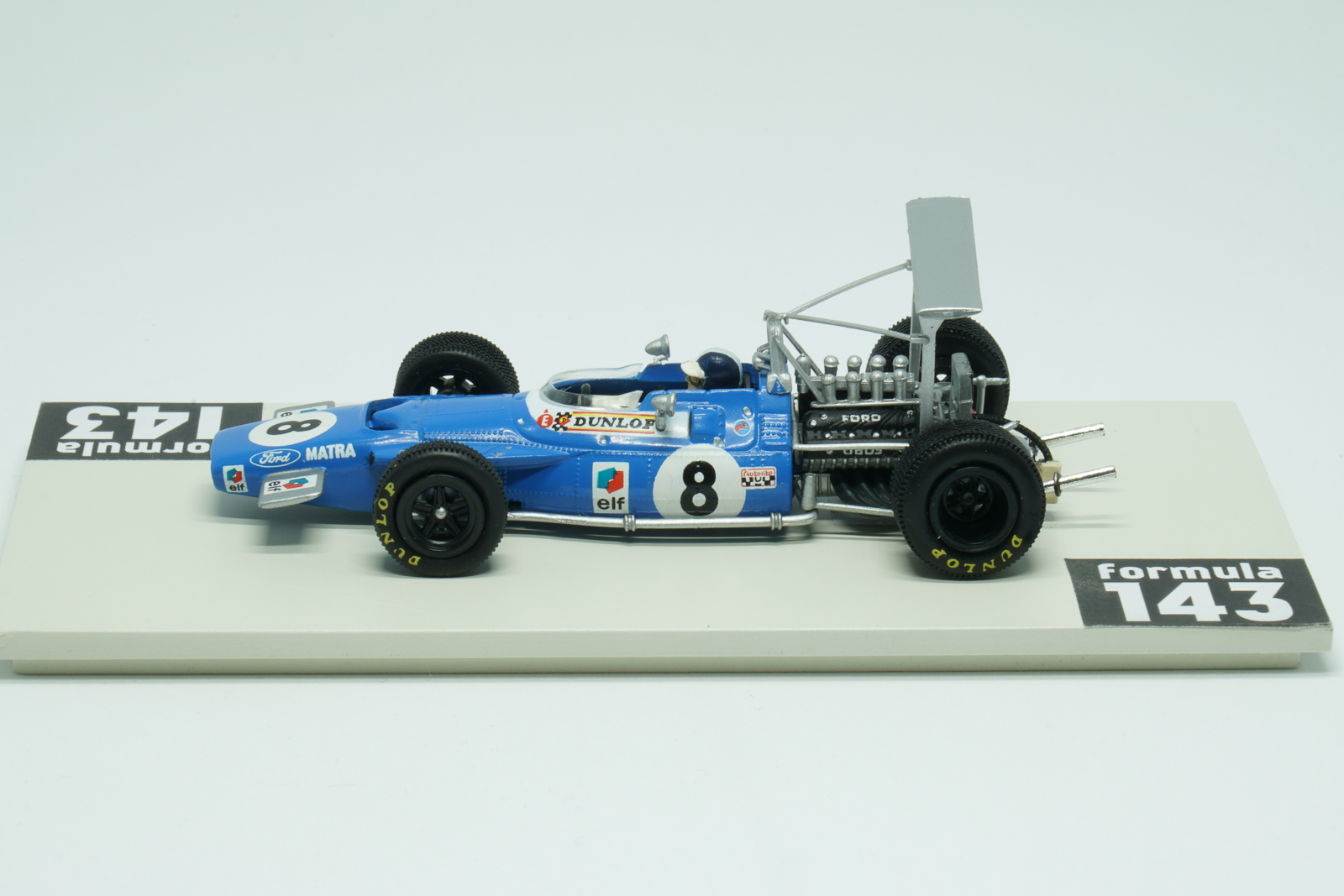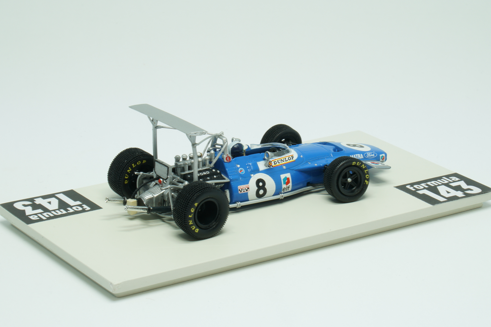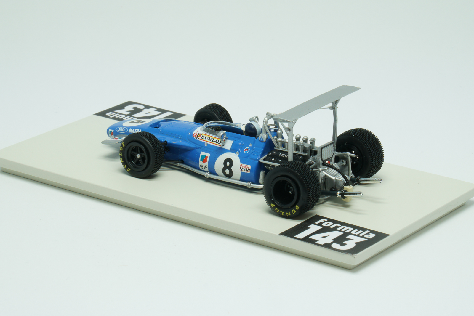 MS80 was produced be Matra for the 1969 Formula 1 season. The Ford-Cosworth DFV 3000 cc 240 bhp powered car was raced by Jackie Stewart and Jean-Pierre Beltoise. The “Flying Scotsman” took the Driver’s Championship winning 5 out of 11 Championship races of the season. His French teammate Beltoise was 5th in the Championship with two podium finishes: 3rd positions in Spain and Italy. Matra, as the other teams, experimented a lot with the high wings during first races of the season, and the version of Beltoise’ car from the Spanish GP has the high wing on the rear. After several dramatic crashes caused by the unstable high wings in Spain, this kind of aerodynamic solutions was banned by the FIA’s International Sporting Commission.