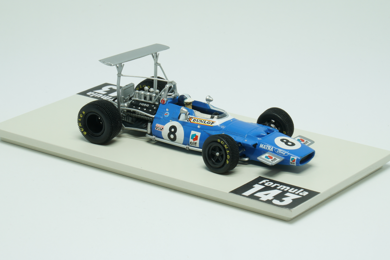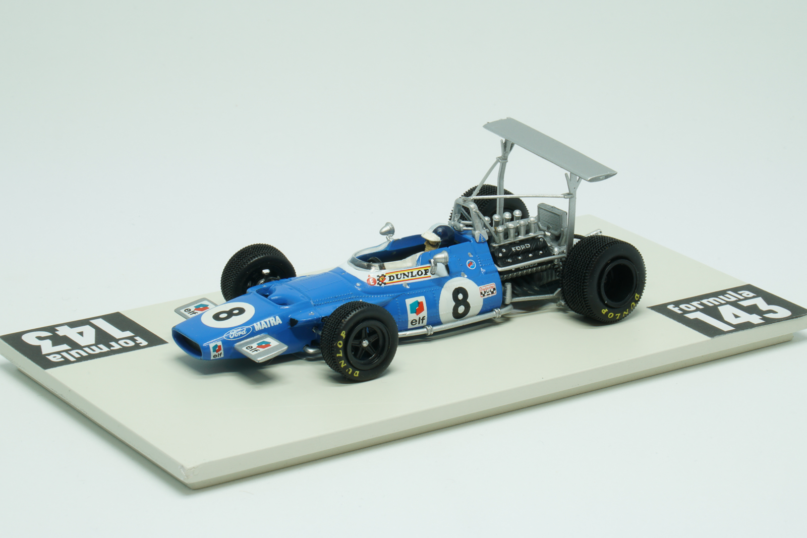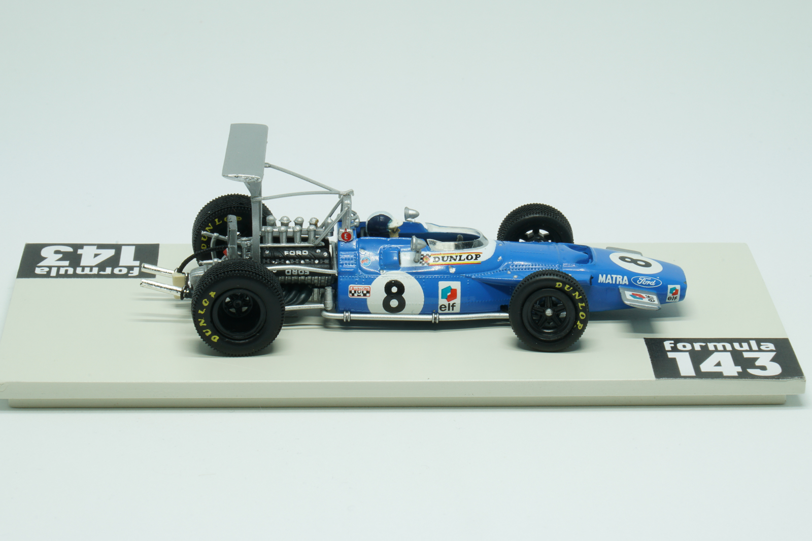 MS80 was produced be Matra for the 1969 Formula 1 season. The Ford-Cosworth DFV 3000 cc 240 bhp powered car was raced by Jackie Stewart and Jean-Pierre Beltoise. The “Flying Scotsman” took the Driver’s Championship winning 5 out of 11 Championship races of the season. His French teammate Beltoise was 5th in the Championship with two podium finishes: 3rd positions in Spain and Italy. Matra, as the other teams, experimented a lot with the high wings during first races of the season, and the version of Beltoise’ car from the Spanish GP has the high wing on the rear. After several dramatic crashes caused by the unstable high wings in Spain, this kind of aerodynamic solutions was banned by the FIA’s International Sporting Commission.
