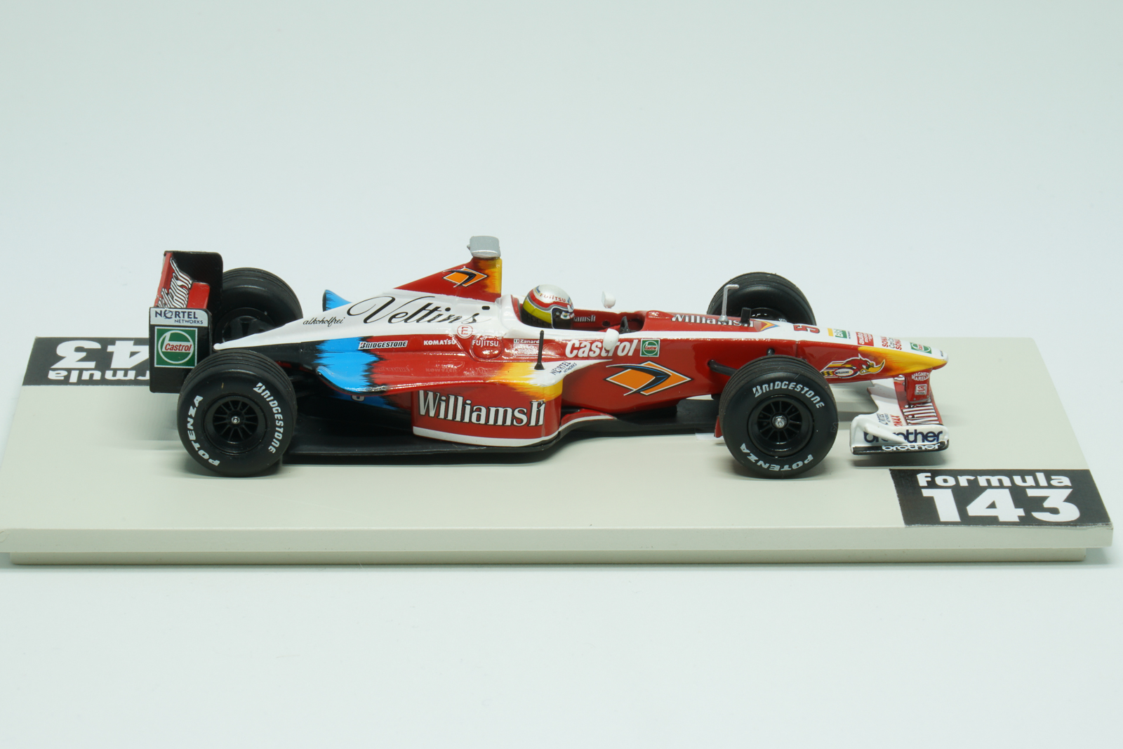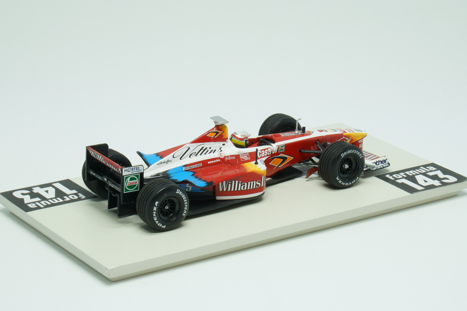 Williams car for the 1999 Formula One season, FW21, was driven by Ralph Schumacher and Alex Zanardi, two times CART champion of 1997 and 1998. The FW21 was powered by Renault FB01 V10 engine badged as Supertec. The season turned to be quite controversial for the team. Schumacher finished the season on the 6th position in the Driver’s Championship achieving 2 podiums, whereas Zanardi failed to score a point. You can compare this Minichamps scale model with the model of the same car and driver by Hot Wheels. Both are almost equal in general quality. Hot Wheels has a little bit better detailing of the car and driver figure, but driver’s helmet is out of scale. The Minichamps is slightly more accurate in the livery reproduction having Veltins beer advertising on board while Winfield tobacco is replaced by “WilliamsF1” on both models.