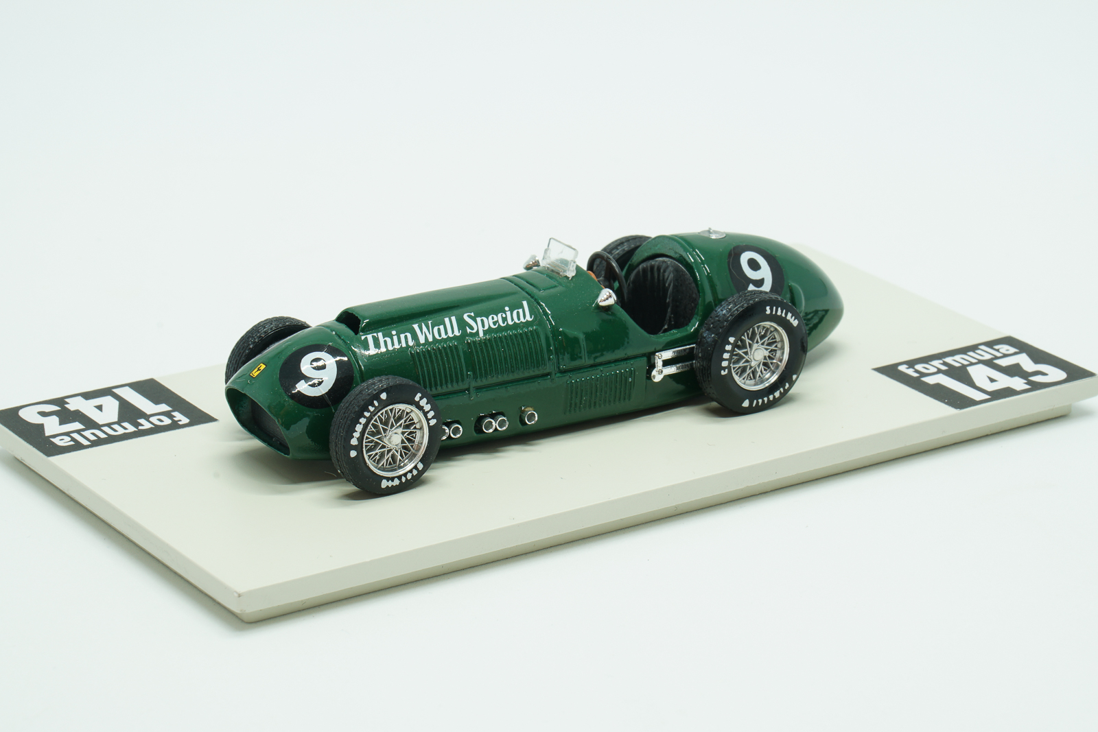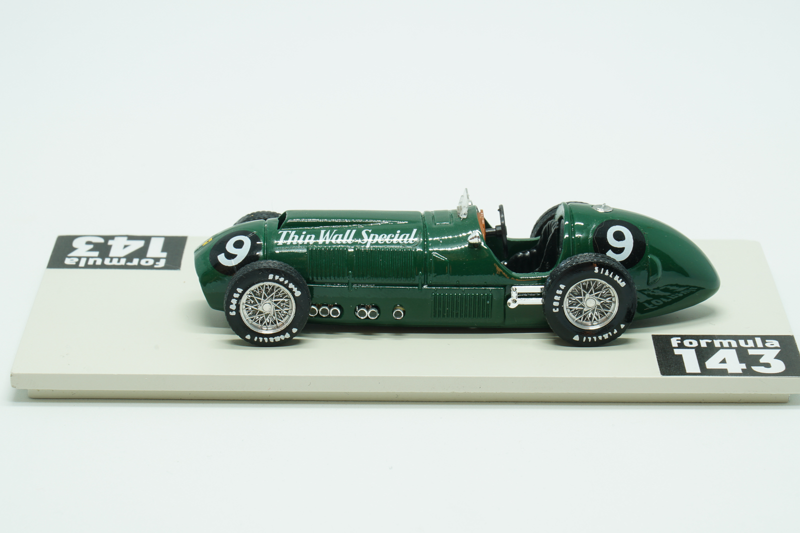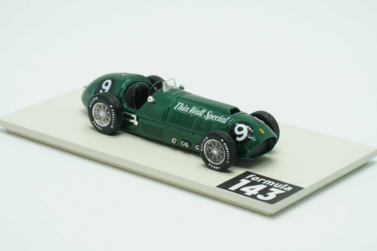In 1954 season Peter Collins competing in Tony Vandervell’s team combined starts in F1 races behind the wheel of new Vanwall with Formule Libre British events driving older Ferrari 375 Thinwall Special. At Daily Telegraph 200 in Aintree on “Thinwall” No. 9 he finished 2nd behind Reg Parnell’s Ferrrai 625/500 in the preliminary heat but retired in the final.