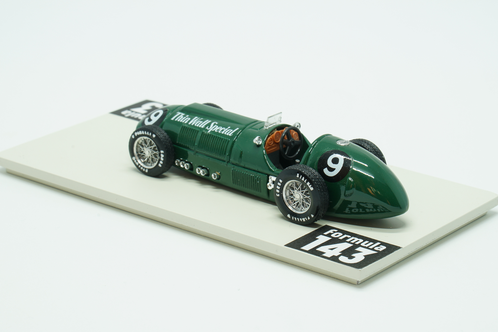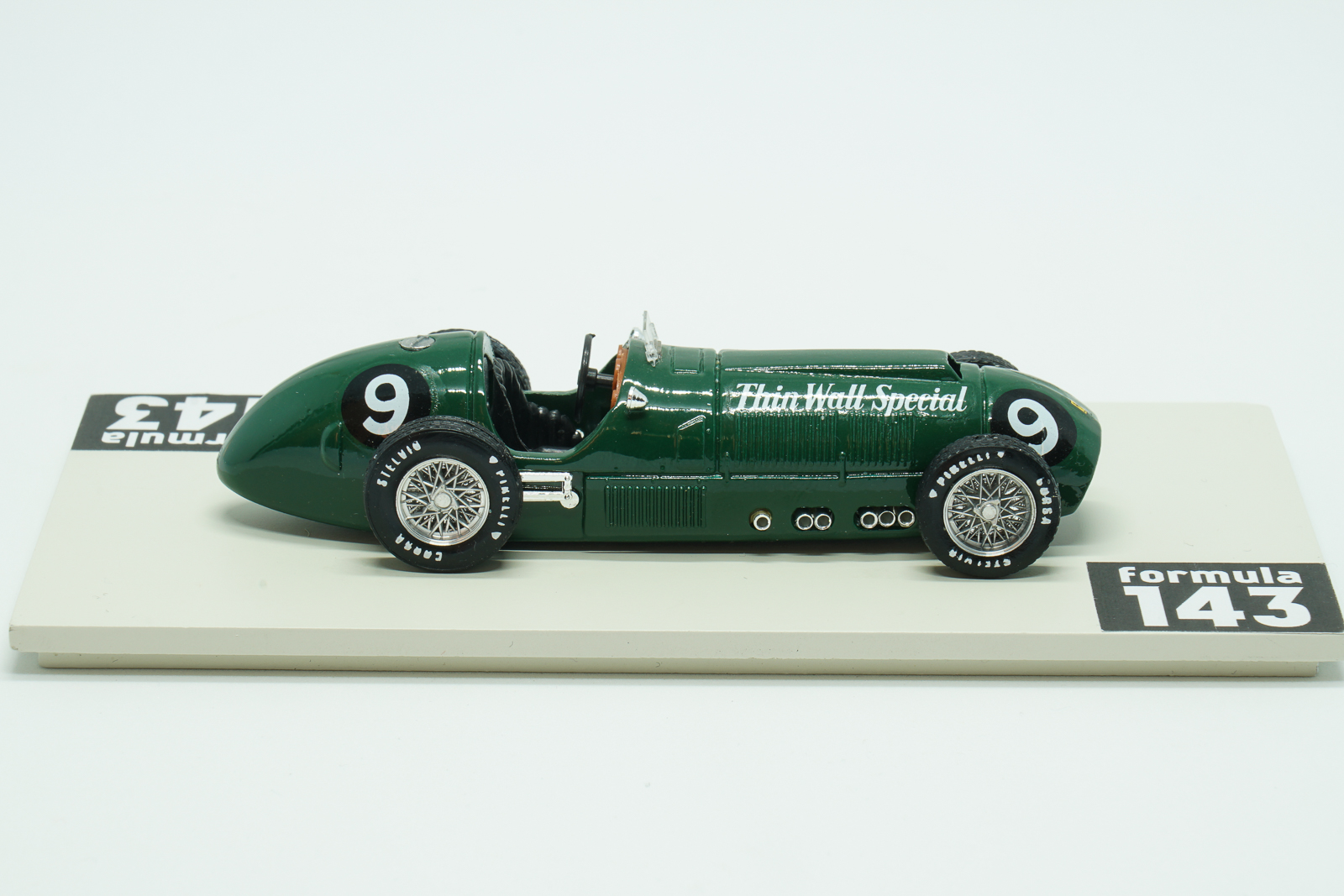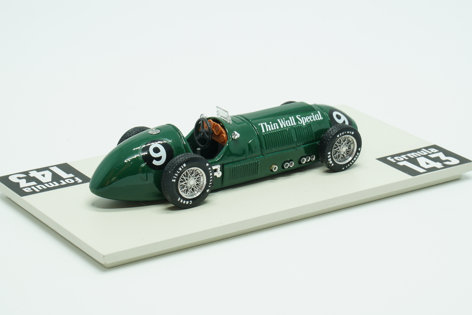 In 1954 season Peter Collins competing in Tony Vandervell’s team combined starts in F1 races behind the wheel of new Vanwall with Formule Libre British events driving older Ferrari 375 Thinwall Special. At Daily Telegraph 200 in Aintree on “Thinwall” No. 9 he finished 2nd behind Reg Parnell’s Ferrrai 625/500 in the preliminary heat but retired in the final.