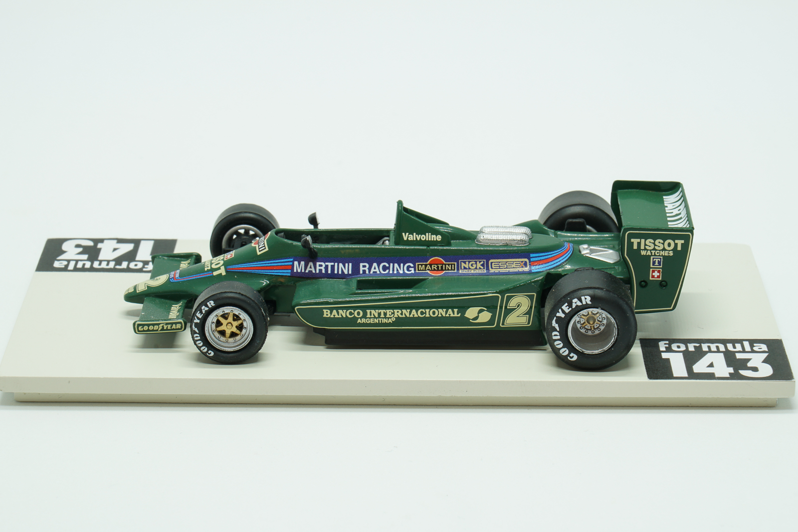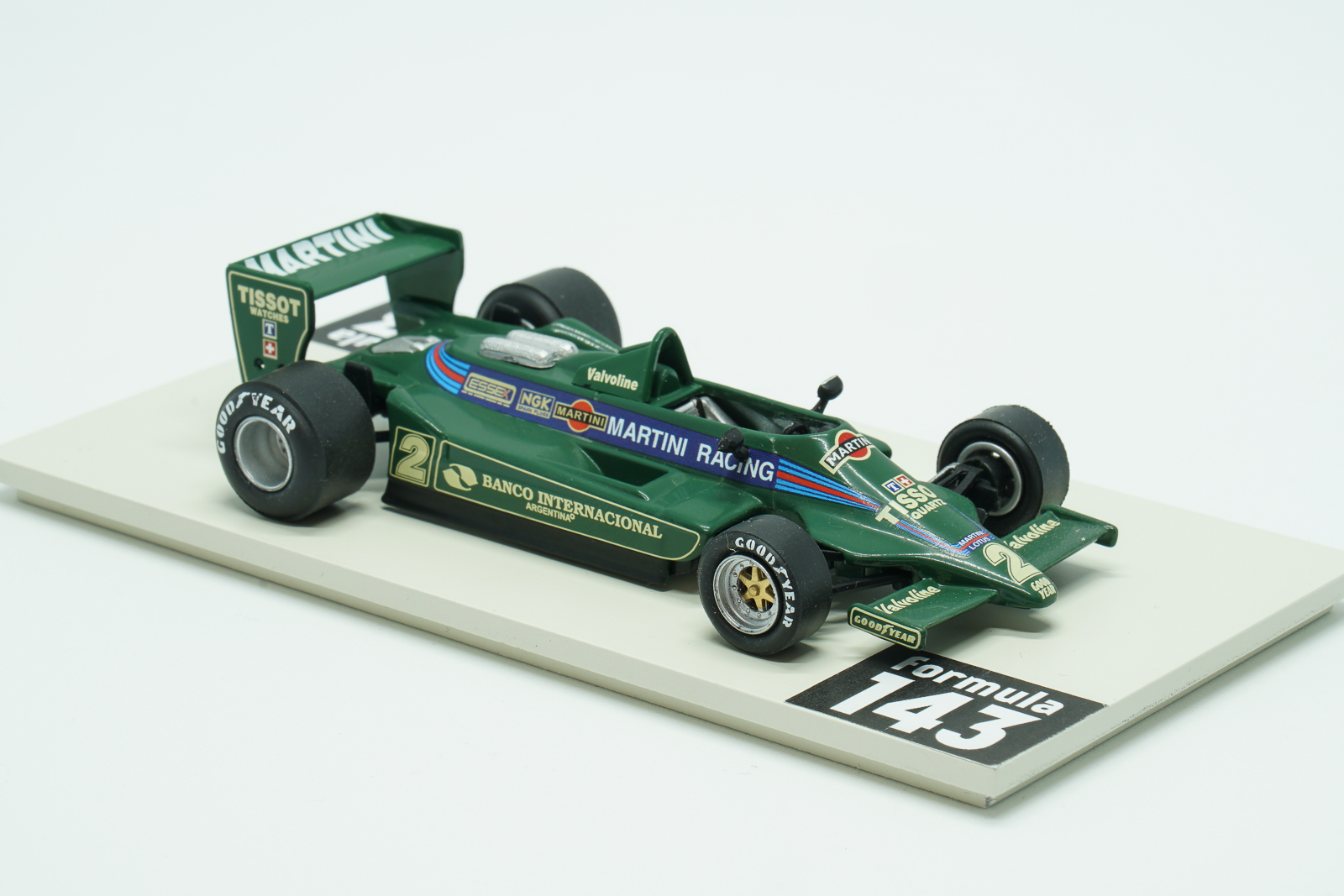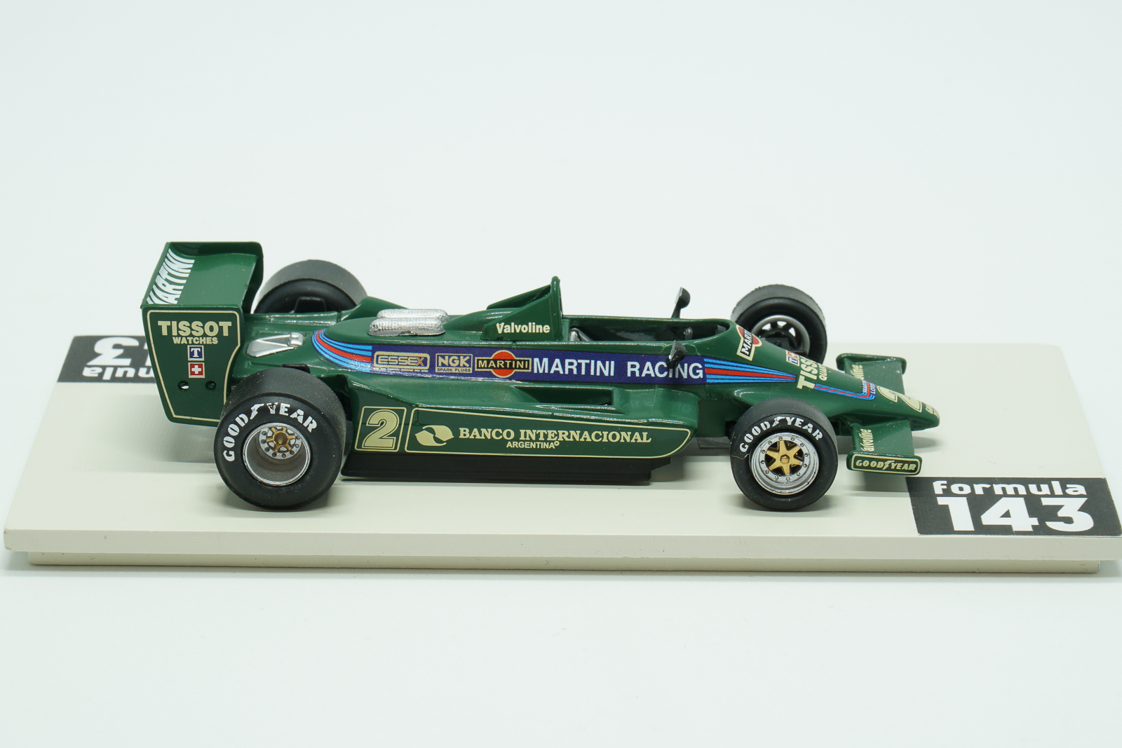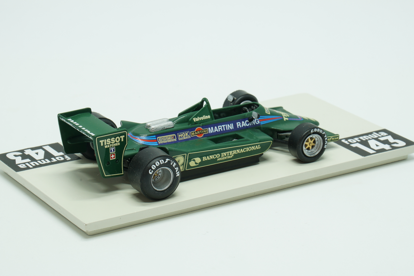 Lotus 79 was almost unbeatable in the 1978 victorious season, and Colin Chapman’s team continued to use it in 1980 waiting the replacement by Lotus 80 during the season. For 1979 Martini replaced JPS as a main sponsor and car was painted in British racing green. Lotus 80 has appeared at Spanish Grand Prix, 5th race of the season, but proved to be a failure. The 80 has a tendency to loose downforce at low speed especially in braking and cornering. So after relatively promising 3rd place in Spain and retirements in Monaco and France in hands of Mario Andretti, 80 was abandoned and 79 continued to race the rest of the season. Andretti’s teammate Carlos Reutemann in 79 in the early season scored several podiums, but in the second half of the year more effective next generation ground effect cars – Ferrari 312T4, Ligier JS11 and Williams FW07 -outclassed the Lotus 79.