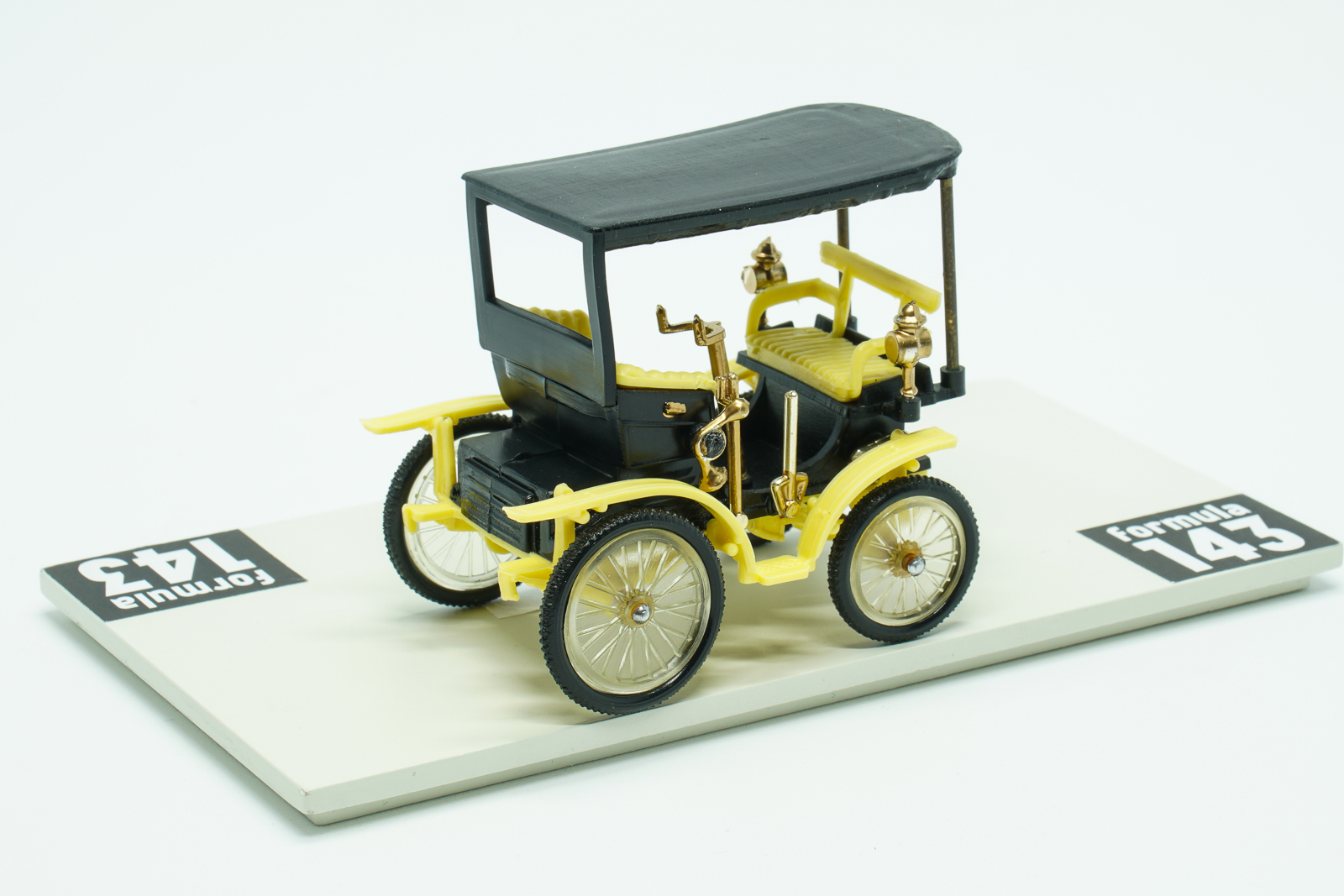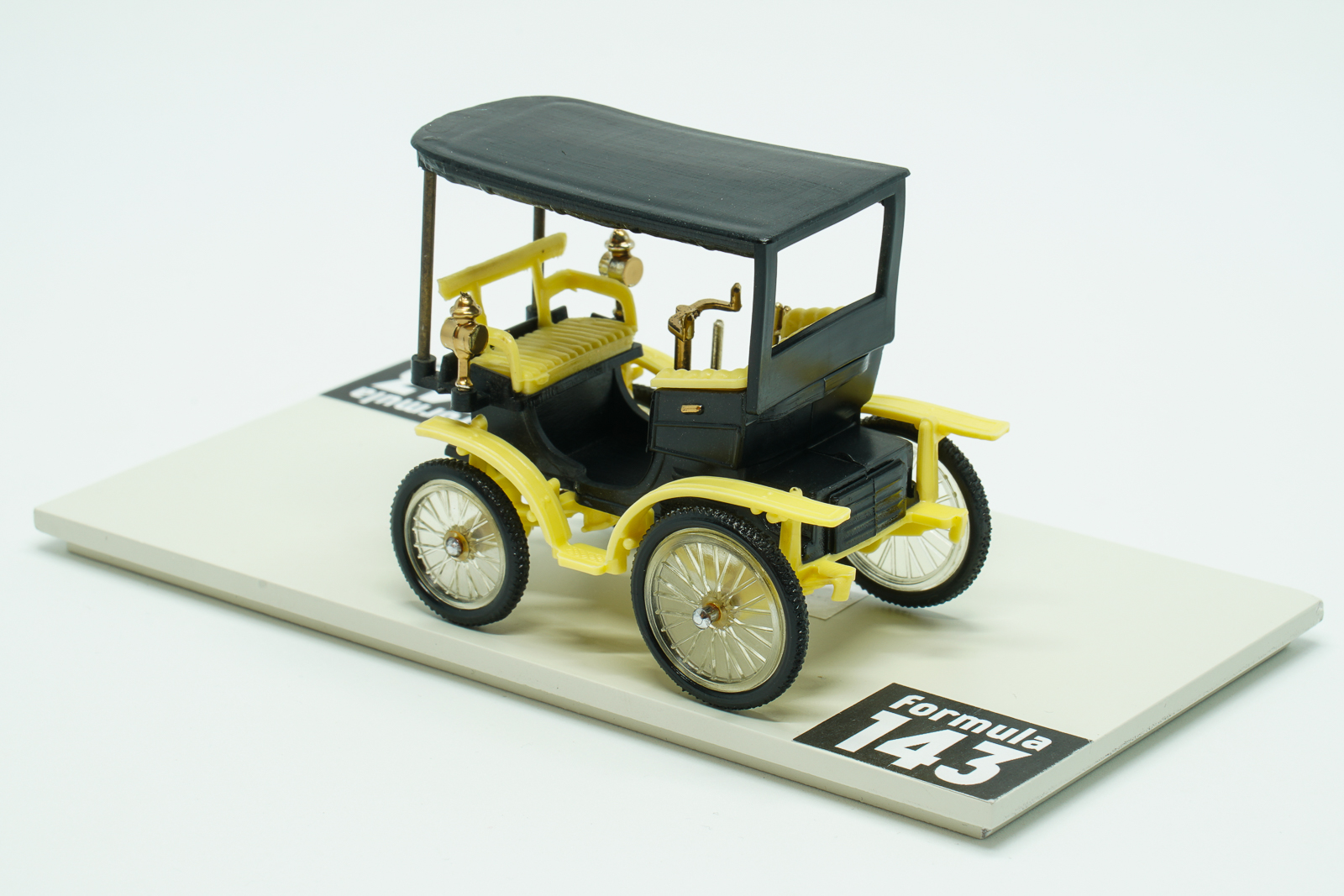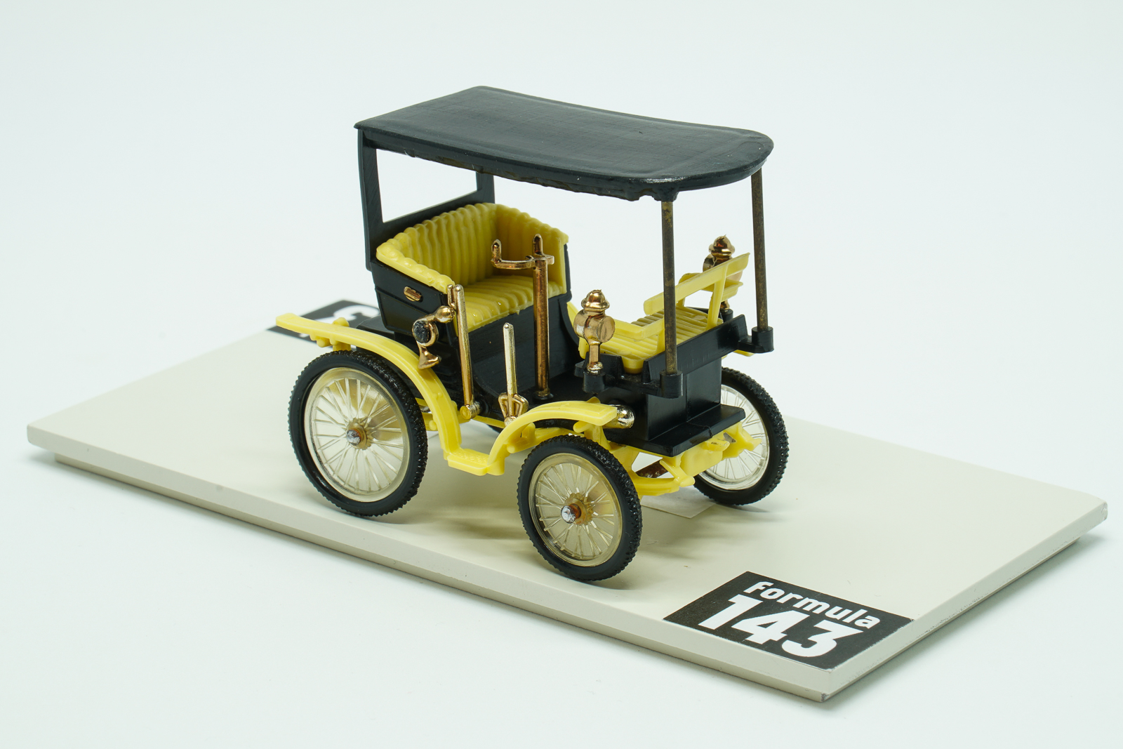In 1984 a trial for horeseless carriages from Paris to Rouen was held, which is considered as the beginning of organized motor racing. Despite not being a true race, but rather a trial, run from Paris to Rouen was the crucial point for the further growth and development of motor sport. The trial was unofficially won by Count Albert de Dion who was the fastest in his steam-powered car, but not eligible for the first prize as not accompanied by mechanic. The first prize was to be awarded by the judges consisted of the staff of “Le Petit Journal” and consulting engineers to the car which best fulfilled the requirements of being “without danger, easily handled and of low running cost”. The major contenders were Peugeot and Panhard et Levassor companies to whom the first prize was awarded equally. Among 21 cars qualified for the start there were 5 works Peugeots driven by firm’s engineers Rigoulot, Doriot and Michaux along with Lemaitre and Kraeutler. This plastic Minialuxe model produced in the 1960s reproduces 1891 Peugeot Vis-à-vis Type 5 petrol-powered car driven by Auguste Doriot to the 3rd place in the Paris-Rouen trial.