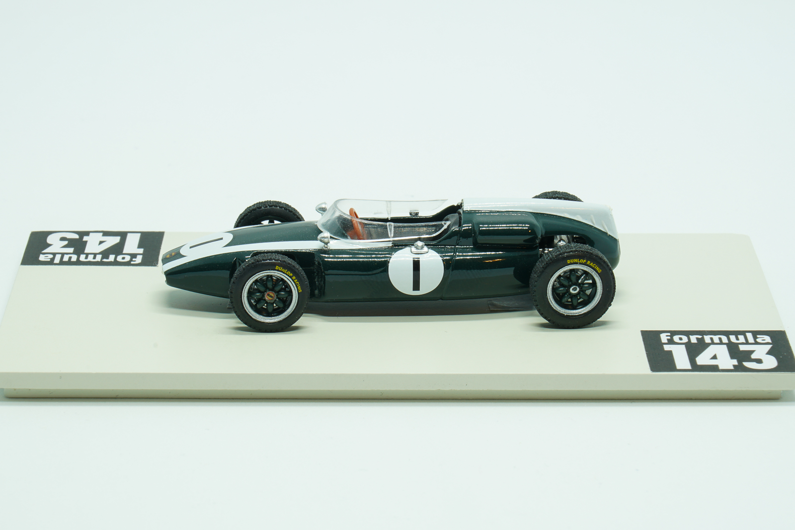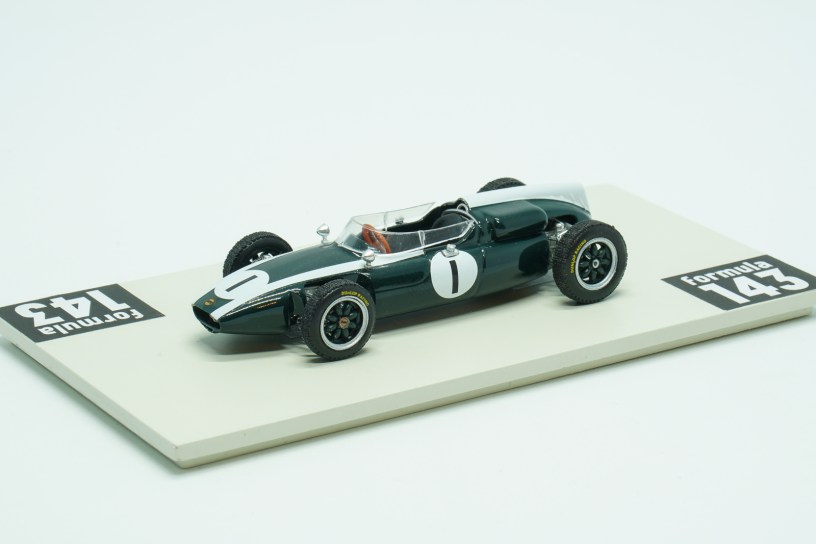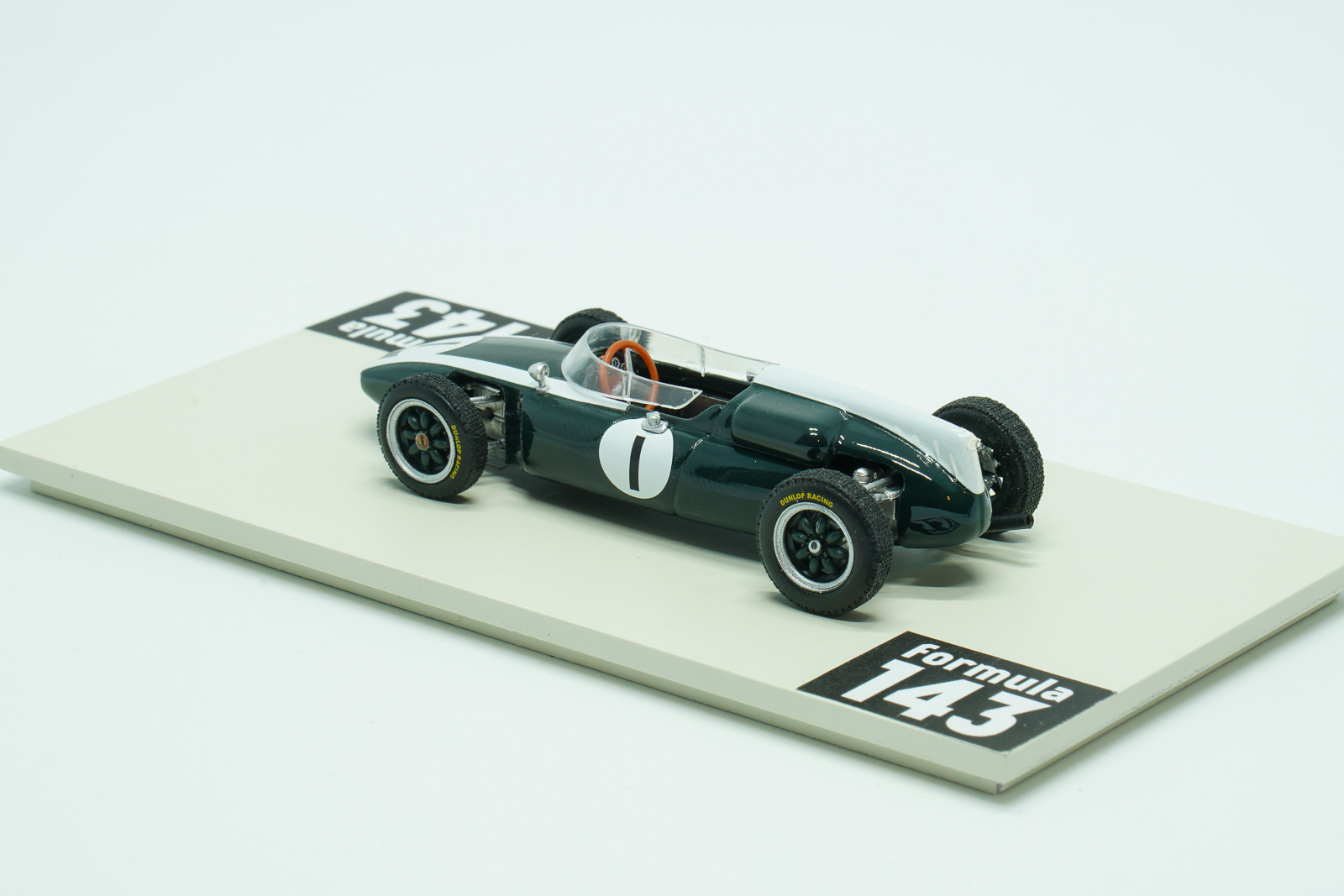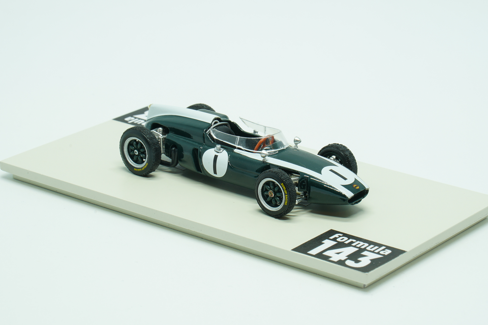 Cooper Car Company started the 1960 season with T51, its successful model of the previous year. But after extraordinary performance of new Lotus 18 at races in Argentina in the beginning of the season, team principal John Cooper and designer Owen Maddock have no option rather than to try redevelop T51 into new chassis copying best Lotus technical solutions in in addition to winning Cooper combination of simplicity and reliability. New T53 was born very quickly and was available for Monaco Grand Prix in May. It was more lighter, lower and aerodynamically effective than T51. Jack Brabham, despite disqualification in Monaco for outside assistance, won four next Championship races and took his second consecutive Drivers’ Championship title. This scale model by Brumm is Jack’s T53 from victorious British GP at Silverstone.