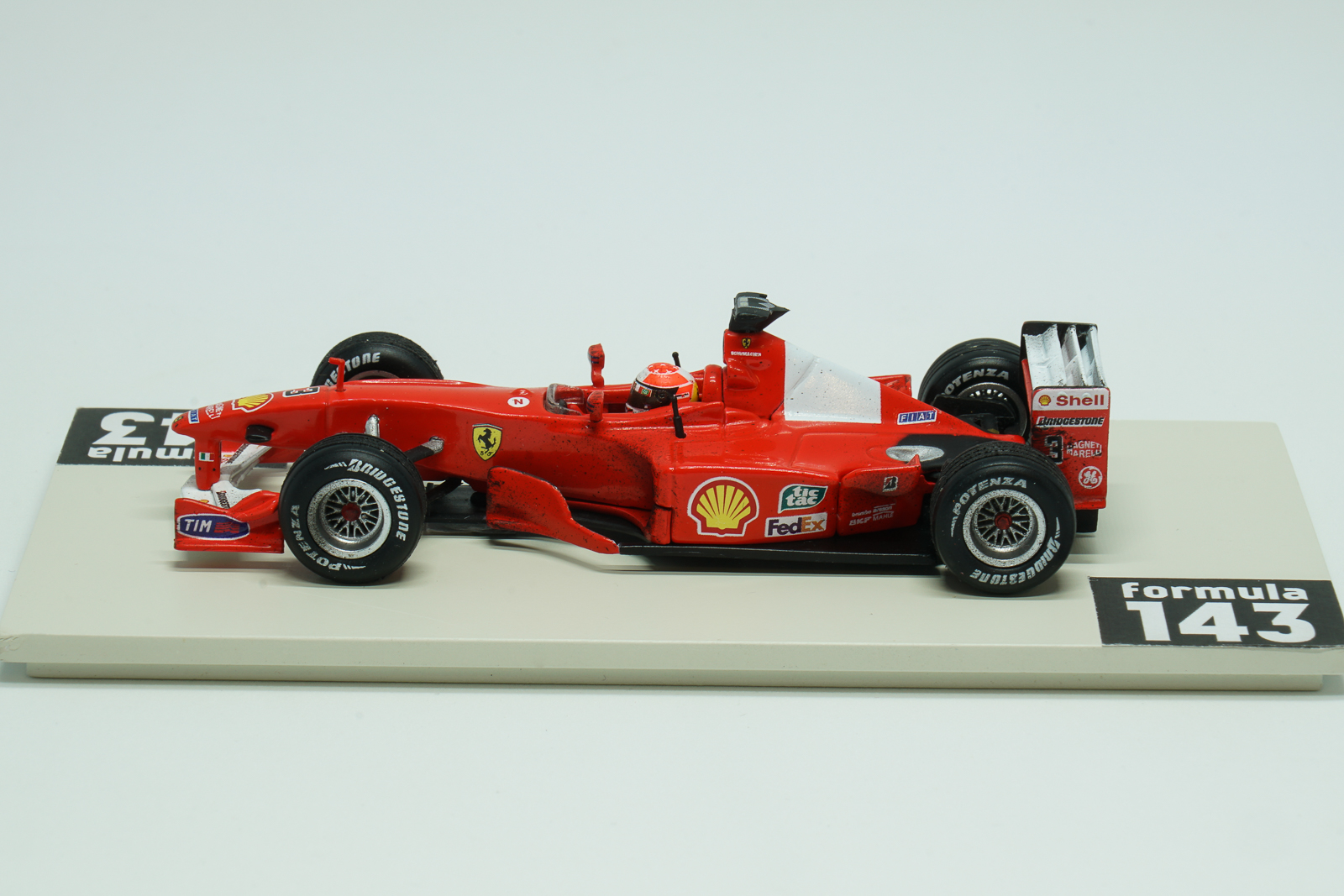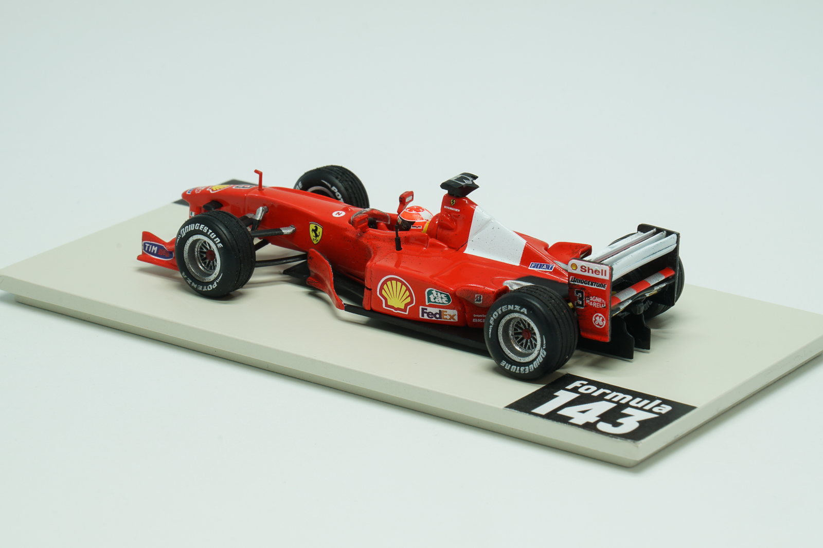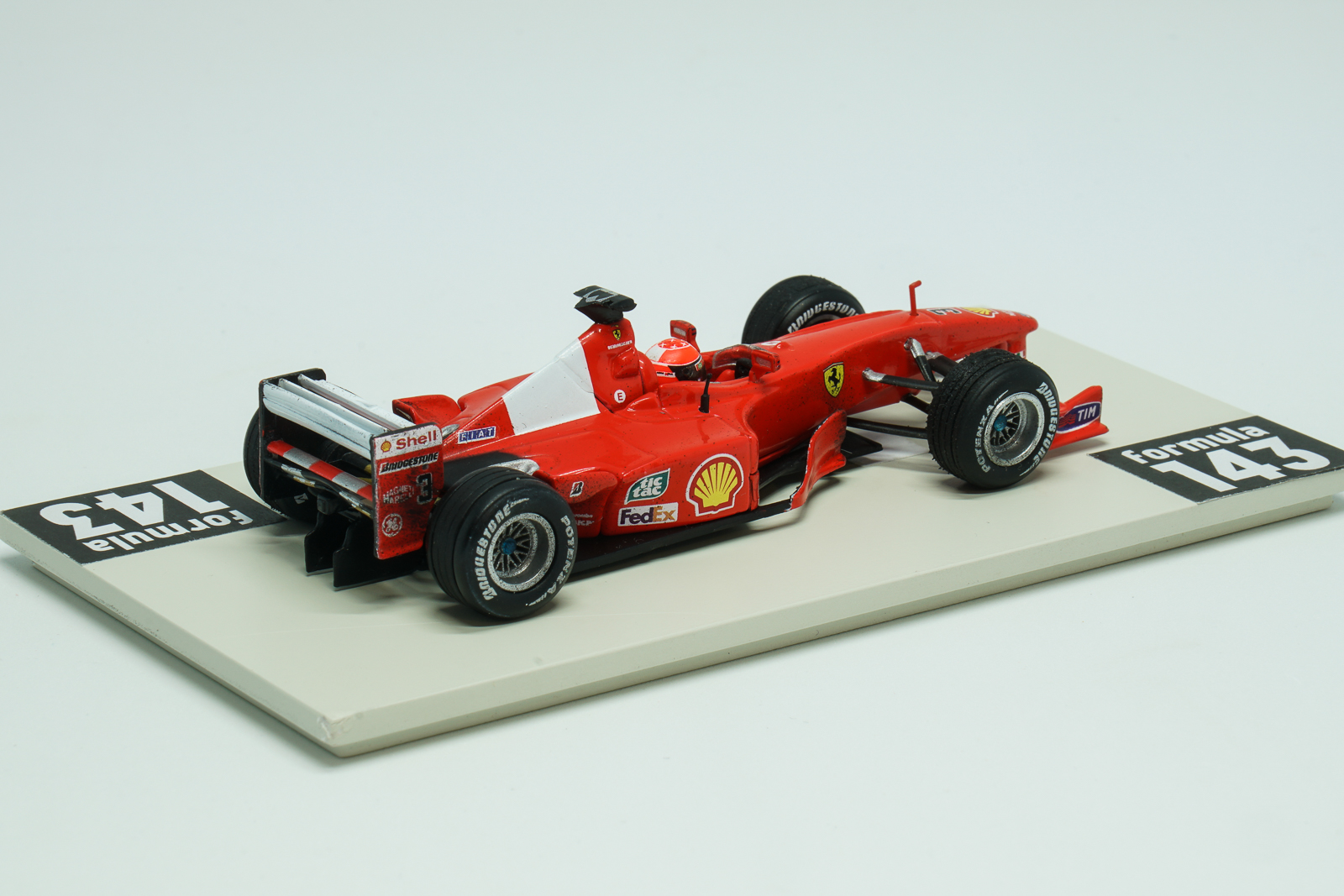 F1-2000 was the car which started the era of Ferrari dominance through the first half of the decade. The car designed by Rory Byrne was the further development of the F300 and F399 from the previous two seasons. The major improvement was the new engine with a wider V-angle (90 degrees vs. 75 degrees in the 048 engine). Michael Schumacher who was in his fifth season with Ferrari won his third World Championship title after a year-long battle with Hakkinen on McLaren. Schumacher won 9 Grand Prix against 4 wins by Mika. It was Ferrari’s first crown for 21 years. It also defended Ferrari’s constructors’ title. This Hot Wheels scale model is from “Michael Schumacher Ferrari Hat Trick” special edition which represents three cars in “race dirty version” from GP races where Schumacher secured his three consecutive titles in 2000-2002. See also models of F1-2000 from RBA Collection and from Ferrari F1 Collection.