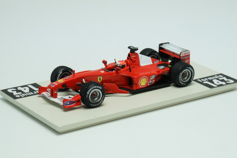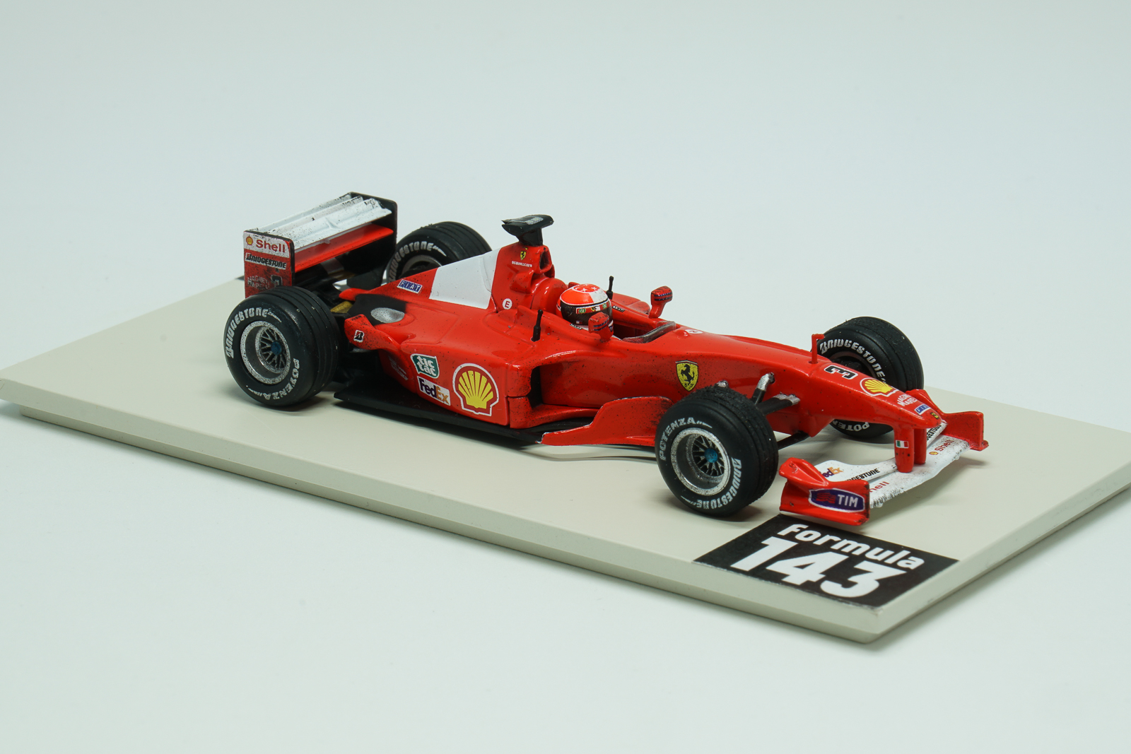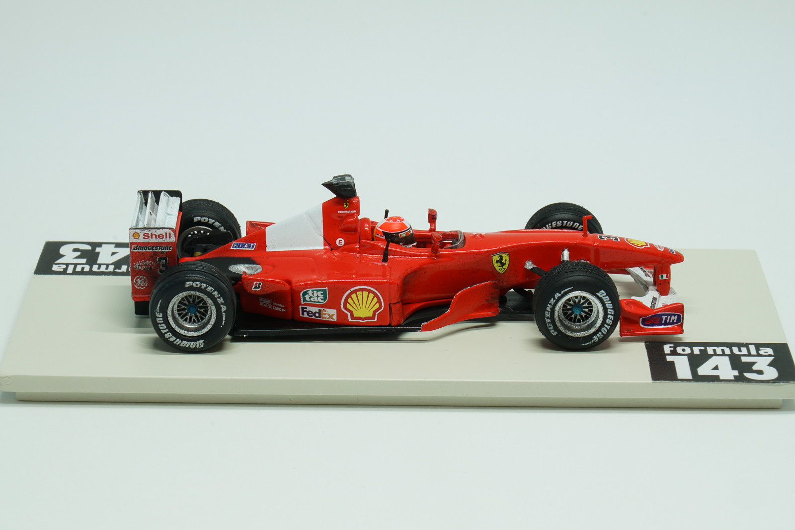 F1-2000 was the car which started the era of Ferrari dominance through the first half of the decade. The car designed by Rory Byrne was the further development of the F300 and F399 from the previous two seasons. The major improvement was the new engine with a wider V-angle (90 degrees vs. 75 degrees in the 048 engine). Michael Schumacher who was in his fifth season with Ferrari won his third World Championship title after a year-long battle with Hakkinen on McLaren. Schumacher won 9 Grand Prix against 4 wins by Mika. It was Ferrari’s first crown for 21 years. It also defended Ferrari’s constructors’ title. This Hot Wheels scale model is from “Michael Schumacher Ferrari Hat Trick” special edition which represents three cars in “race dirty version” from GP races where Schumacher secured his three consecutive titles in 2000-2002. See also models of F1-2000 from RBA Collection and from Ferrari F1 Collection.