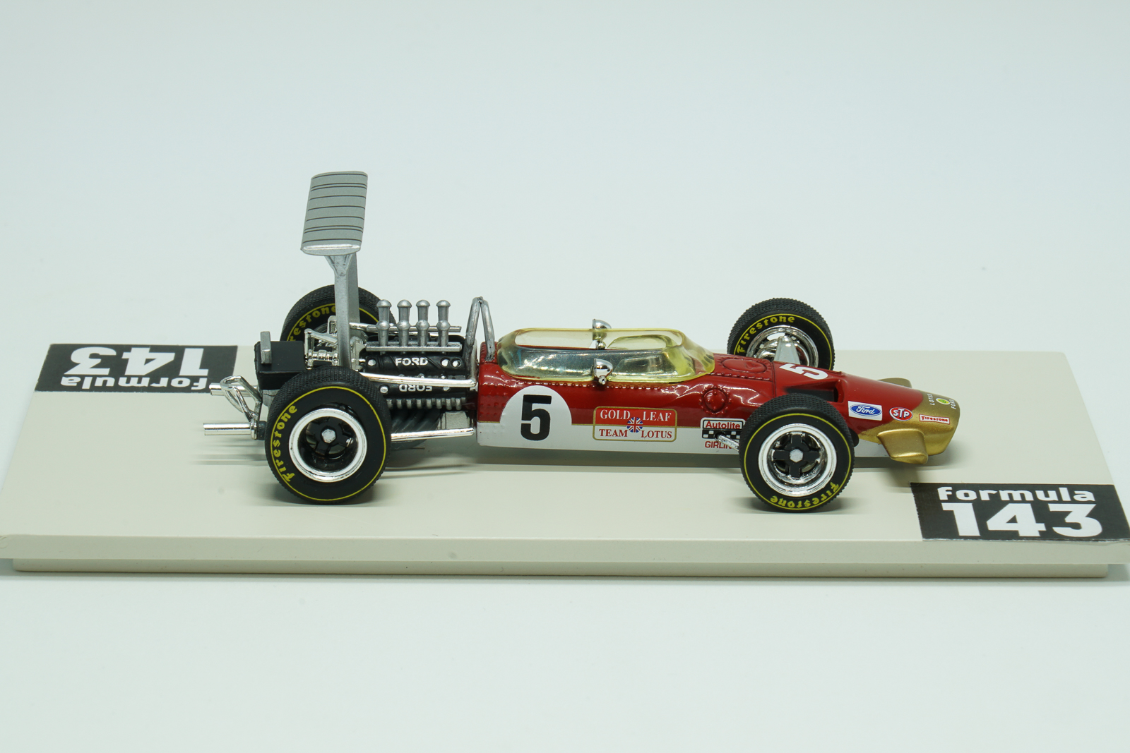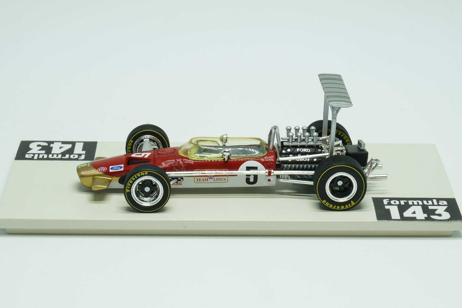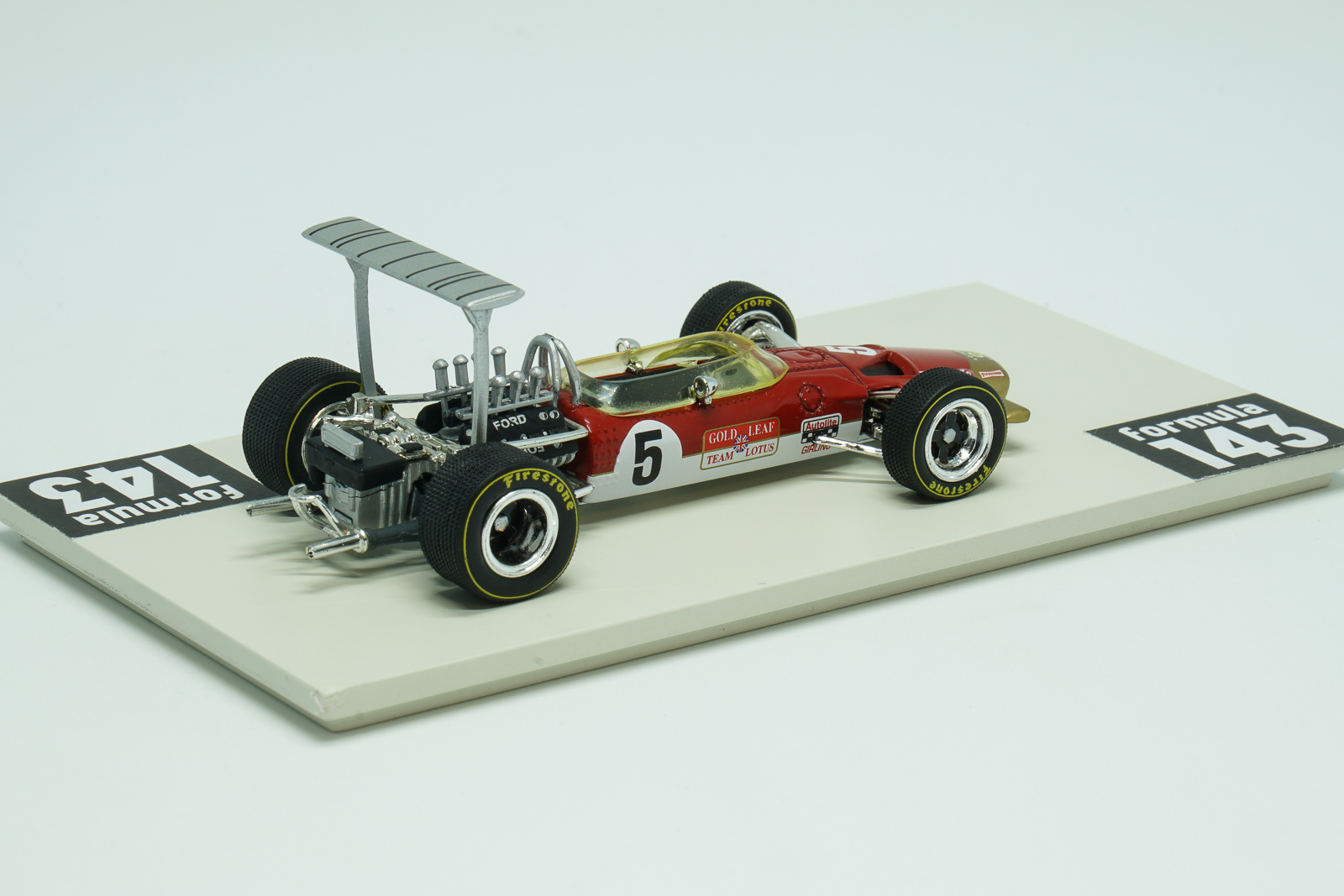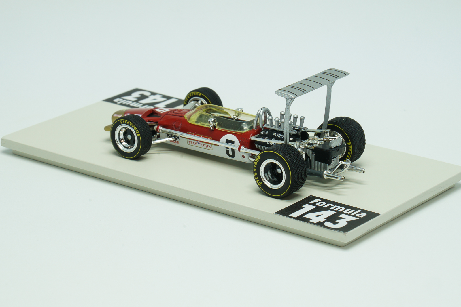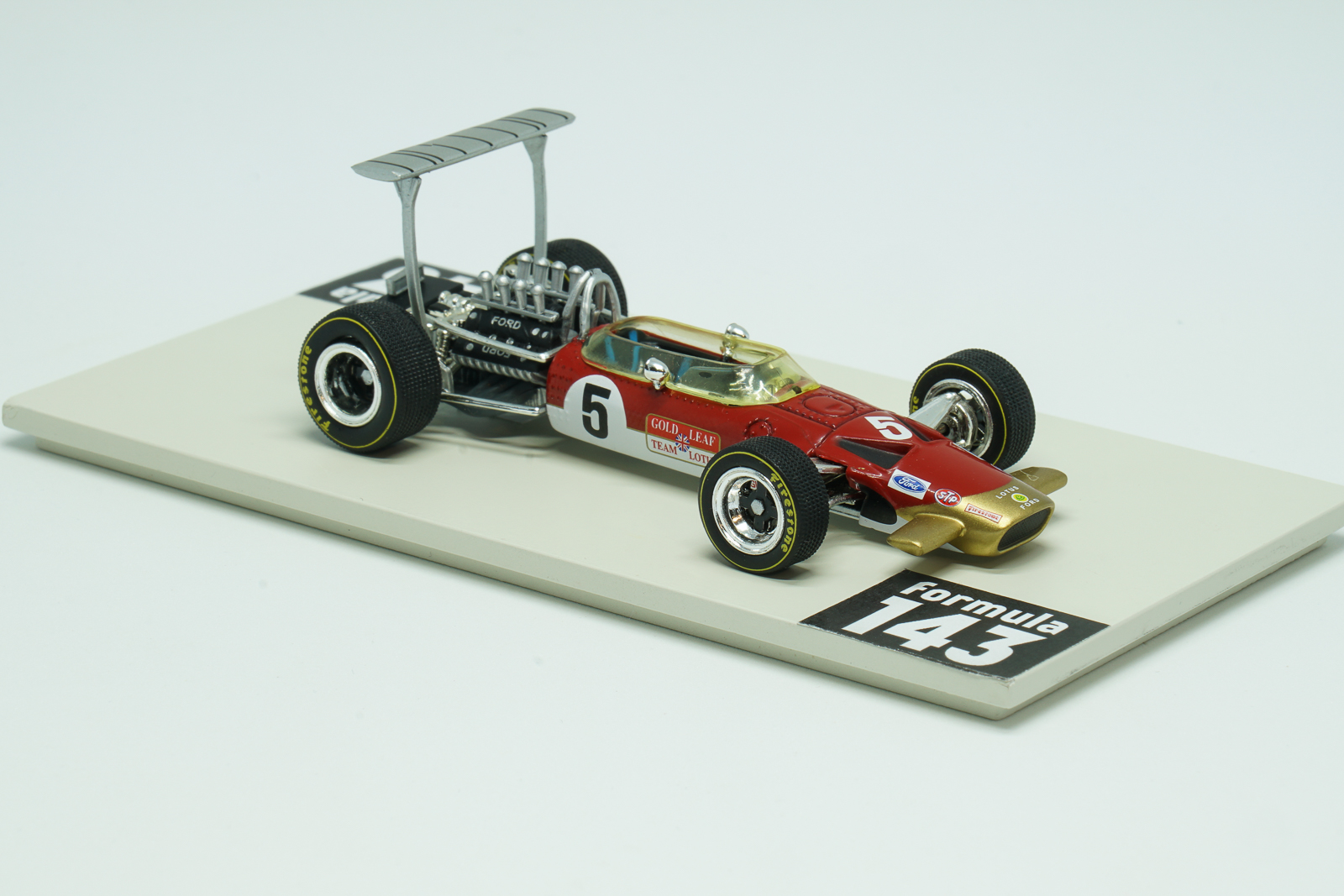 Lotus 49 was introduced by Colin Chapman for the first 3-litre Formula season in 1967. New FIA regulations left many of the independent teams like Lotus and Cooper without an engine. Solving this problem Chapman organized very productive Ford – Cosworth partnership by joining abilities of his old friends Mike Costin and Keith Duckworth, the founders of the Cosworth engine tuning company, with financial backing from Ford. Using a Ford four cylinder as a base, the Cosworth team first developed a 16-valve 1600 cc FVA engine for Formula 2. It would form the basis for the three litre V8 readied for the 1967 season. The 49 was an advanced design in Formula 1 because of its chassis configuration. The specially-designed engine became a stress-bearing structural member bolted to the monocoque at one end and the suspension and gearbox at the other. Since then, virtually all Formula 1 cars have been built this way. 49B was the specification of Lotus 49 for the 1968 season. Lotus team started the season with Jim Clark and Graham Hill, but after Clark was killed at Hockenheim in a non-championship Formula Two event at the beginning of the season, Hill became the favorite of the season. With three Grand Prix victories he won his second drivers’ Championship title. 1968 was the first year when FIA permitted the full sponsorship of Formula One teams, and Team Lotus became the first works team to follow this with Graham Hill’s Lotus 49B entered in the Red, Gold and White colors of Imperial Tobacco’s Gold Leaf brand. Other innovation of the season was the introduction of wings. Lotus was the first team to use aerofoil wings, which were introduced at the 1968 Monaco Grand Prix. Originally these wings were bolted directly to the suspension and were supported by slender struts. The wings were mounted several feet above the chassis of the car for effective use in clean air, however after several breakages which led to dangerous accidents, the high wings were banned and Lotus was forced to mount the wings directly to the bodywork.
