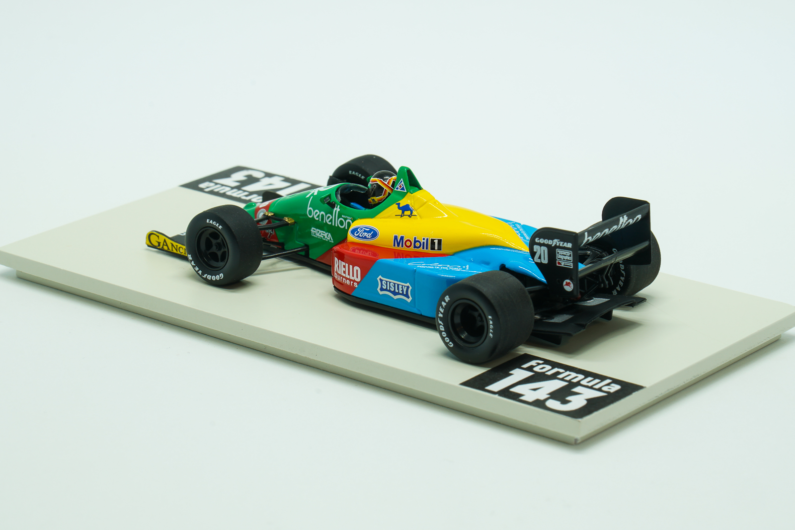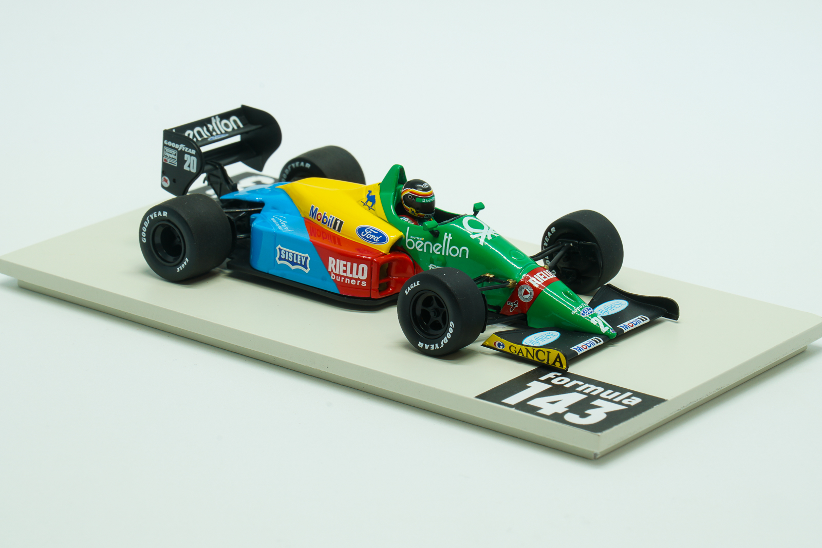 B188 designed by Rory Byrne was the first non-turbo powered team’s car since its debut as Toleman in 1981. In fact, Benetton was the works Ford team in 1988, which exclusively used new 3.5.L Ford DFR V8 engine, while other Ford customers in the peloton had to rely on  1987’s DFZ engine. The DFR developed 620 bhp was the most powerful atmospheric engine of the season compared with 590 bhp for the older DFZ V8. But turbocharged Honda and Ferrari engines capable of 650 bhp were far ahead. The B188 was driven by Belgian Thierry Boutsen, 1987 team driver, and newcomer Alessandro Nannini who joined Benetton after two years in Minardi. The 1988 season was completely dominated by McLaren-Honda with Ferrari in a role of a beaten opponent. Benetton was a consistent runner and a third force in the peloton. Thierry Boutsen scored 5 3rd place finishes and took 4th position in the Drivers’ Championship, while Nannini scored 12 with 2 3rd places. In overall Constructor’s Championship standing Benetton finished 3rd with 39 points, 26 points behind Ferrari but 16 points ahead of 4th placed Lotus. Two models of B188 in Formula143 collection represents 2 brands – Onyx and Minichamps. This Boutsen’s B188 is from the “second generation” of Minichamps production characterized by high quality and detailing.