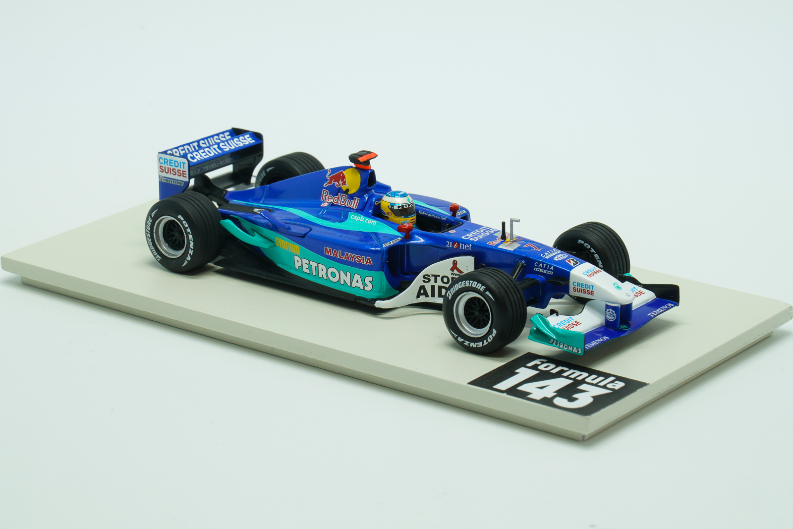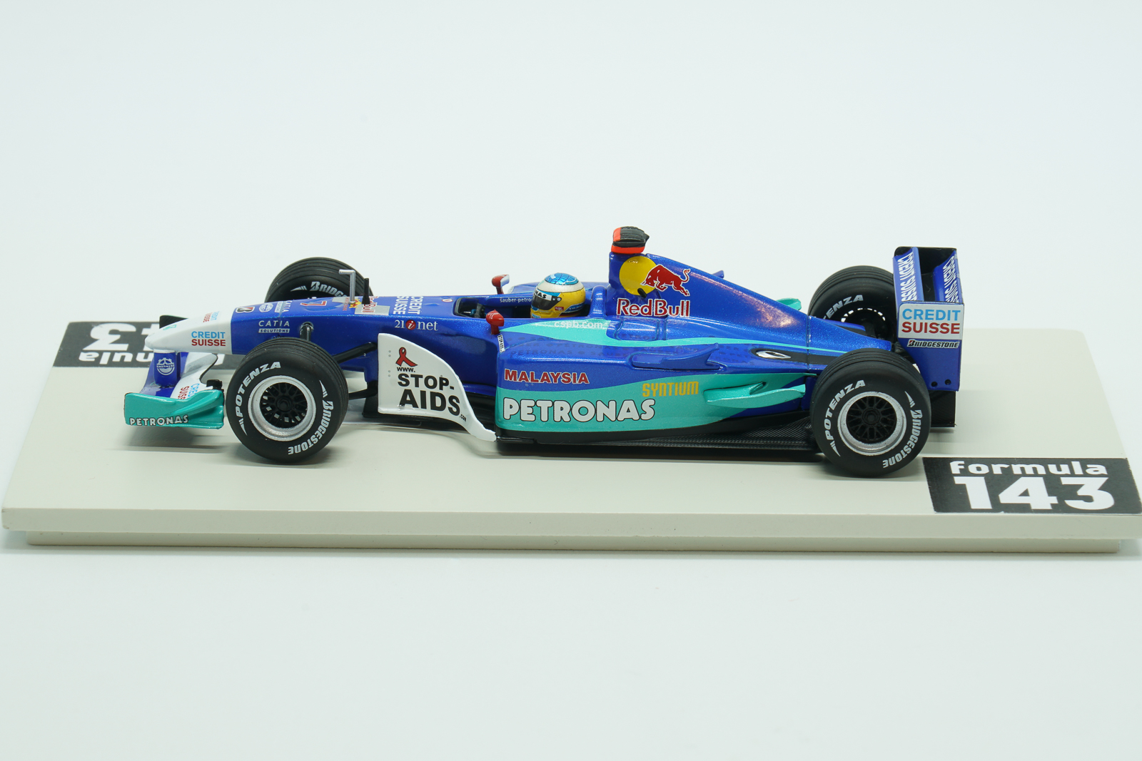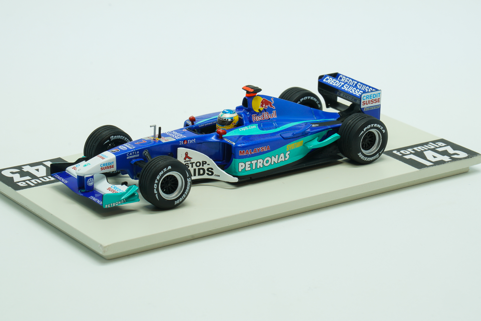 The C21 was designed by German car engineer Willy Rampf. It was very similar to the C20, with modifications to the position of the radiators, suspension setup and rear bodywork. Sauber continued to use Petronas 02A-badged Ferrari V10 engine. The C21 livery also was almost exactly the same as the C20 in 2001: a blue, turquoise and white colour scheme derived from sponsors Petronas and Credit Suisse. Team drivers Nick Heidfeld and Felipe Massa were stable midfield runners and were able to score some small points for 4th, 5th and 6th places. Heidfeld was classified 10th in the final Championship standings with 7 points, while Massa scored 4 and was 13th. Sauber cars carried “Stop-AIDS” slogan on side deflectors on Italian, USA and Japanese Grand Prix as a result of a joint project between Sauber and the United Nations to raise awareness about the disease. The slogan can be seen on this Nick Heidfeld’s Minichamps model from USA GP.