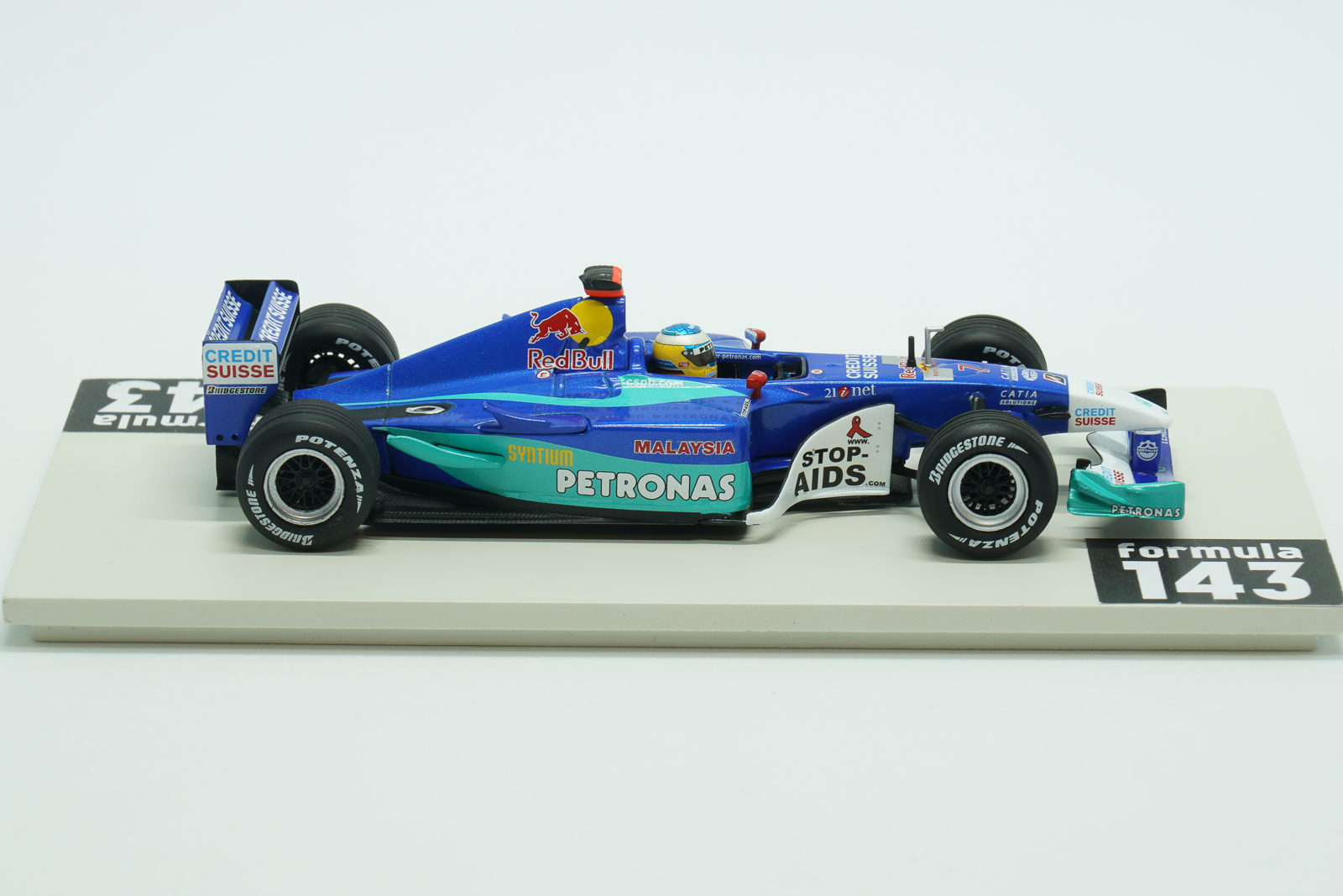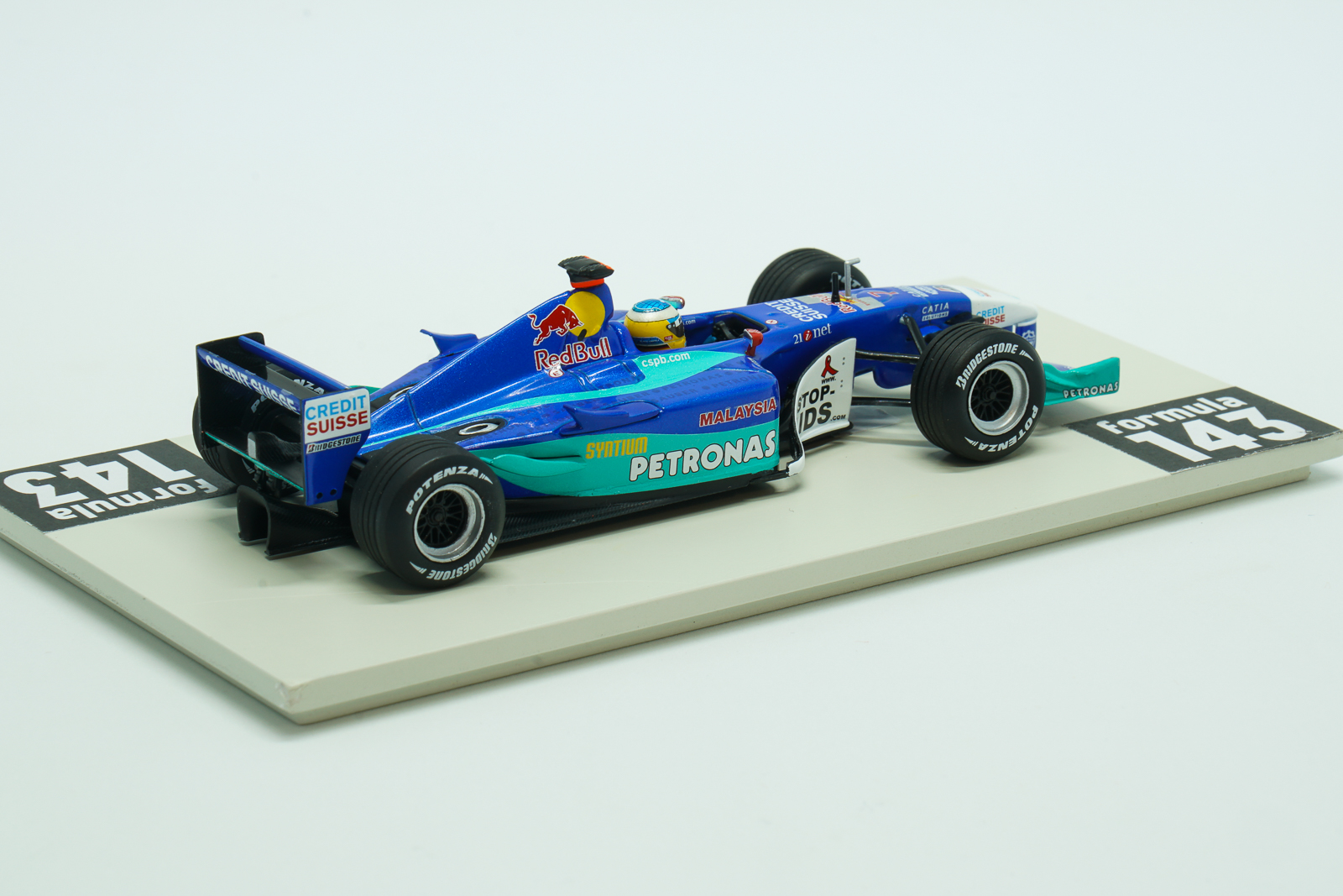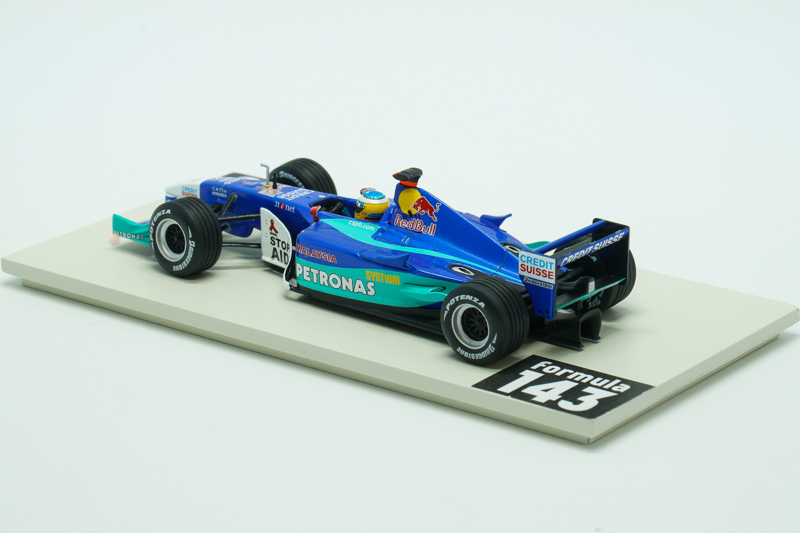The C21 was designed by German car engineer Willy Rampf. It was very similar to the C20, with modifications to the position of the radiators, suspension setup and rear bodywork. Sauber continued to use Petronas 02A-badged Ferrari V10 engine. The C21 livery also was almost exactly the same as the C20 in 2001: a blue, turquoise and white colour scheme derived from sponsors Petronas and Credit Suisse. Team drivers Nick Heidfeld and Felipe Massa were stable midfield runners and were able to score some small points for 4th, 5th and 6th places. Heidfeld was classified 10th in the final Championship standings with 7 points, while Massa scored 4 and was 13th. Sauber cars carried “Stop-AIDS” slogan on side deflectors on Italian, USA and Japanese Grand Prix as a result of a joint project between Sauber and the United Nations to raise awareness about the disease. The slogan can be seen on this Nick Heidfeld’s Minichamps model from USA GP.