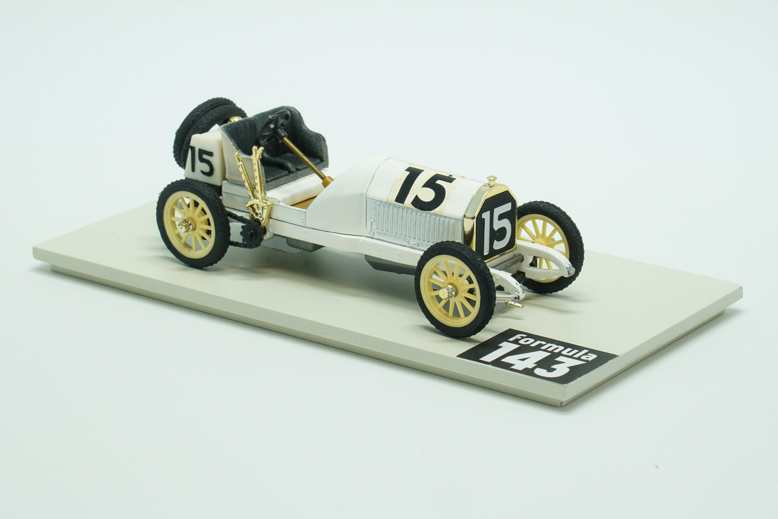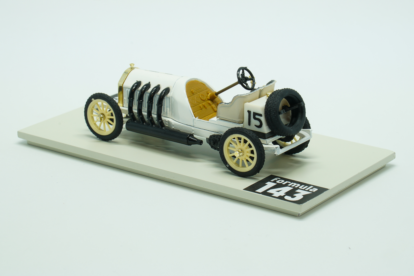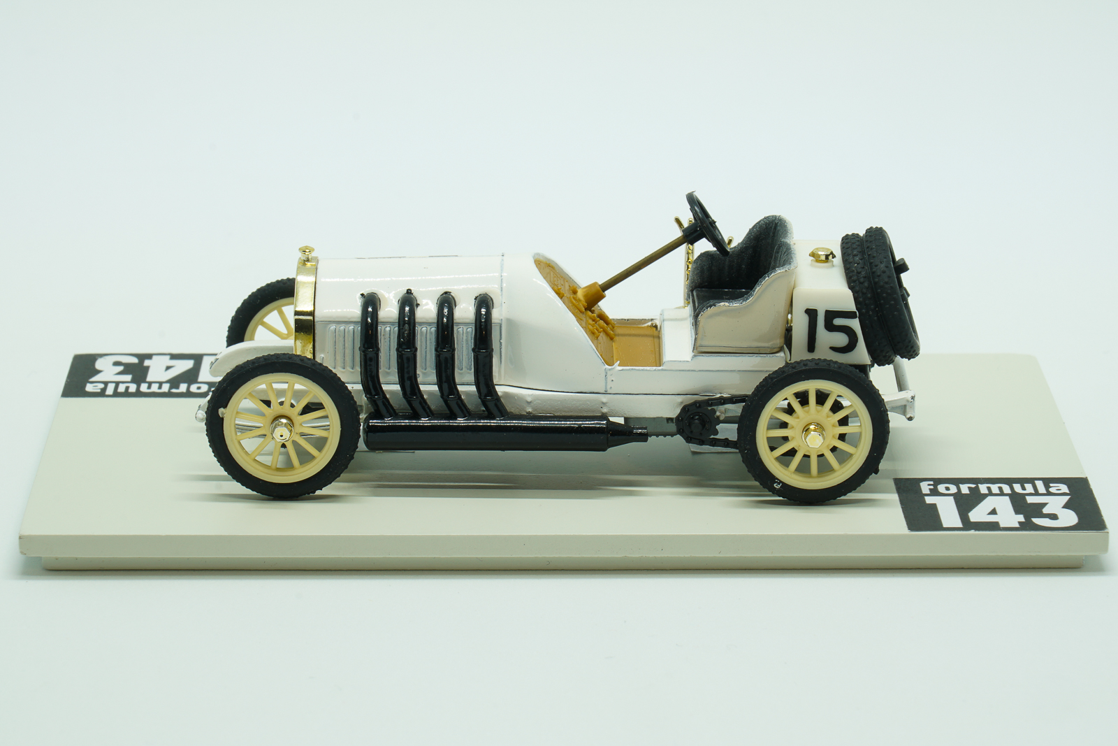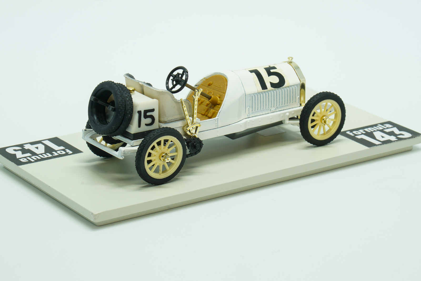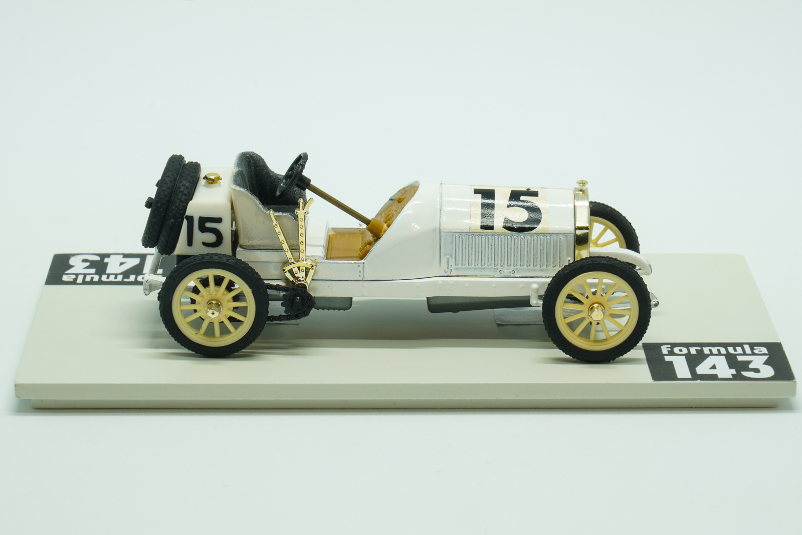 Benz racing history goes back to the very beginning of the motorsport – it took part in the first organized motorsport event – Paris – Rouen trial in 1894. In 1890s – 1910s Benz was the regular entrant of many major automobile races. In 1910 Benz Grand Prix 150 hp cars, based on 1908 GP model, were entered for 1910 American Grand Prize held at Savannah, Georgia. David Bruce-Brown, Victor Hemery and Willie Haupt were the works drivers of the German team. Their main rivals were brilliant FIAT’s squad of Felice Nazzaro, Louis Wagner and Ralph De Palma. FIAT drivers initially took the lead, but all three retired due to technical problems and crashes, opening the way to German cars. The race ends in a one-two victory for Benz, with David Bruce-Brown and Victor Hémery crossing the finish line only seconds apart. This Brumm model is designated by factory as 1909 Blitzen Benz. The Italian scale model manufacturer was not very accurate in historical aspects, at least in their early models. Actually the model, despite being very similar to Blitzen in the body of GP car, represents 1910 GP car based on 150 hp model of 1908, driven in 1910 American Grand Prize by Bruce-Brown. As to Blitzen Benz, Brumm has two more versions of this car in its production list. Both are represented in Formula 143 Collection.