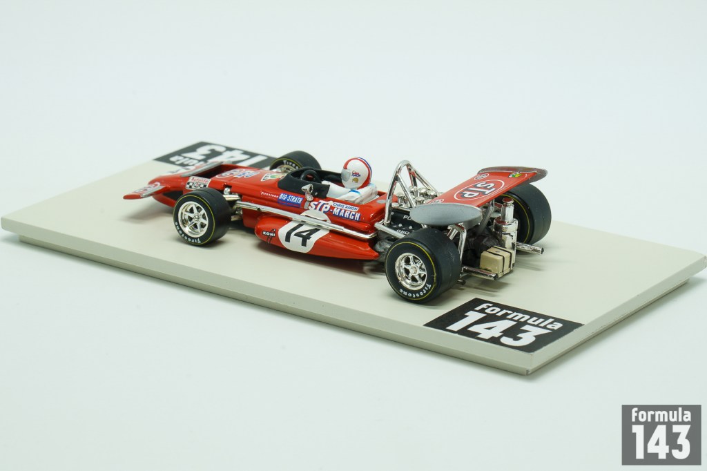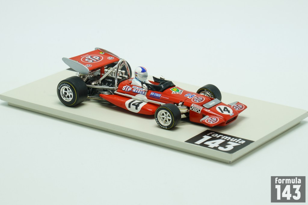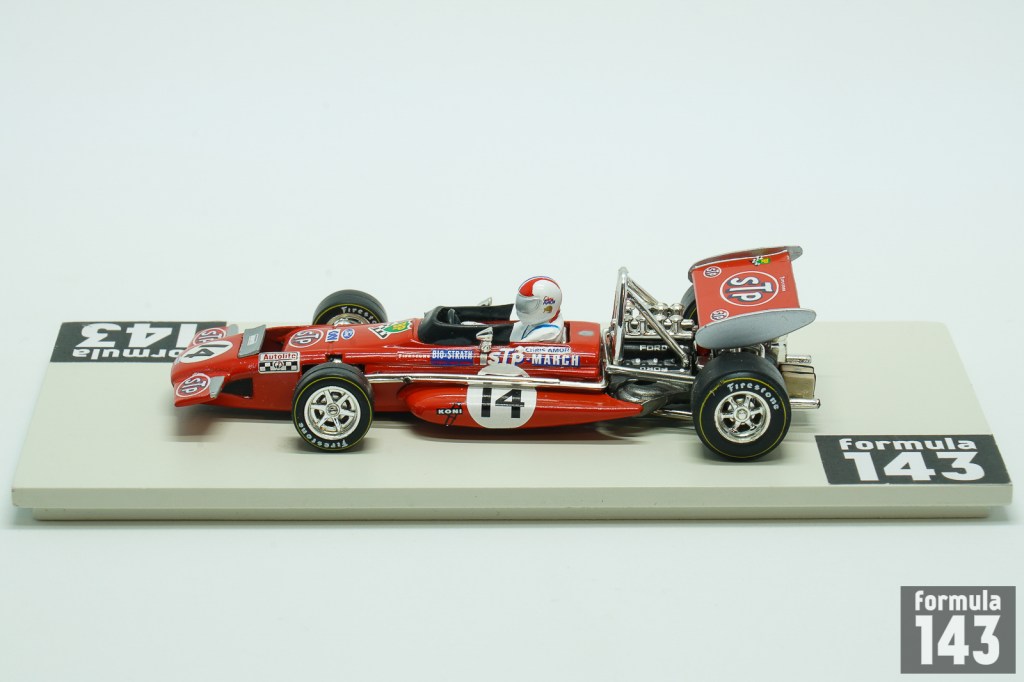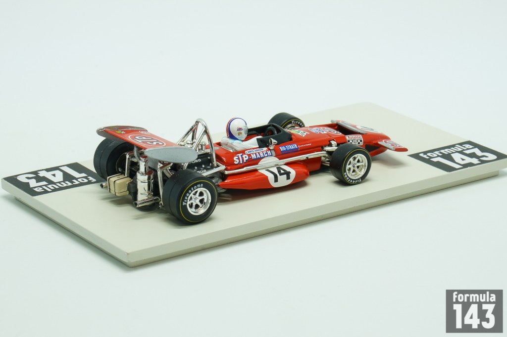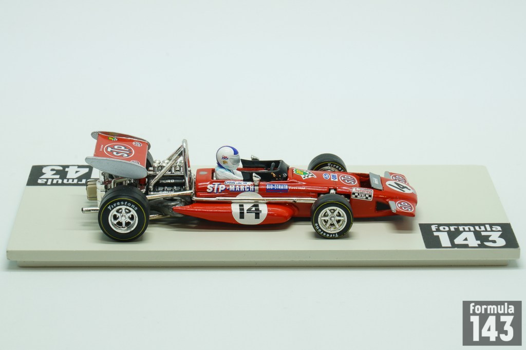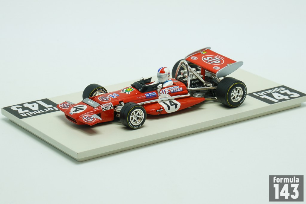 March 701 was the first F1 design by March Engineering. Despite Jackie Stewart has described the car as “the most difficult F1 car I drove”, he was able to achieve the maiden victory for the constructor in its second Championship’ race at 1970 Spanish GP in Jarama. March 701 throughout 1970 season was used by many entrants, including the March works team, Ken Tyrrell Racing Organization and STP Corporation. Works March Engineering team was presented by Jo Siffert and Chris Amon. New Zeelander completely outperformed his Swiss teammate. Amon finished second in Belgium and France and 3rd in Canada. These podiums along with the stable driving in other Championship races put him to the 6th place in the Driver’s Championship final standings. This model by Quartzo is Amon’s car from the French Grand Prix.