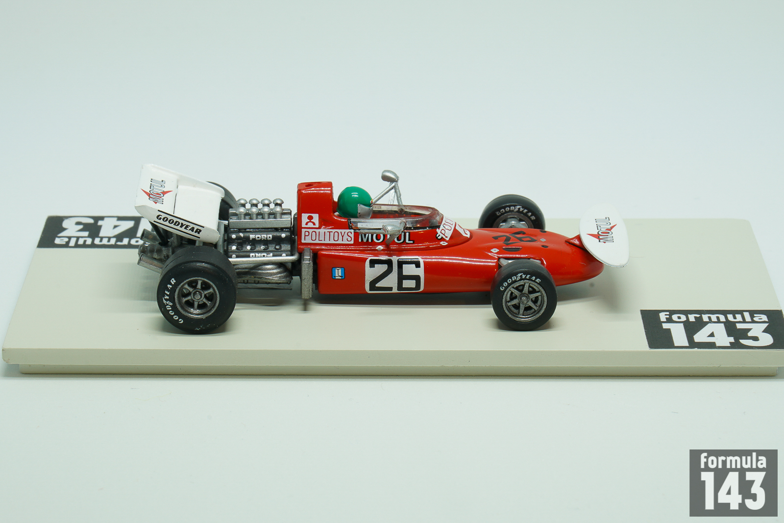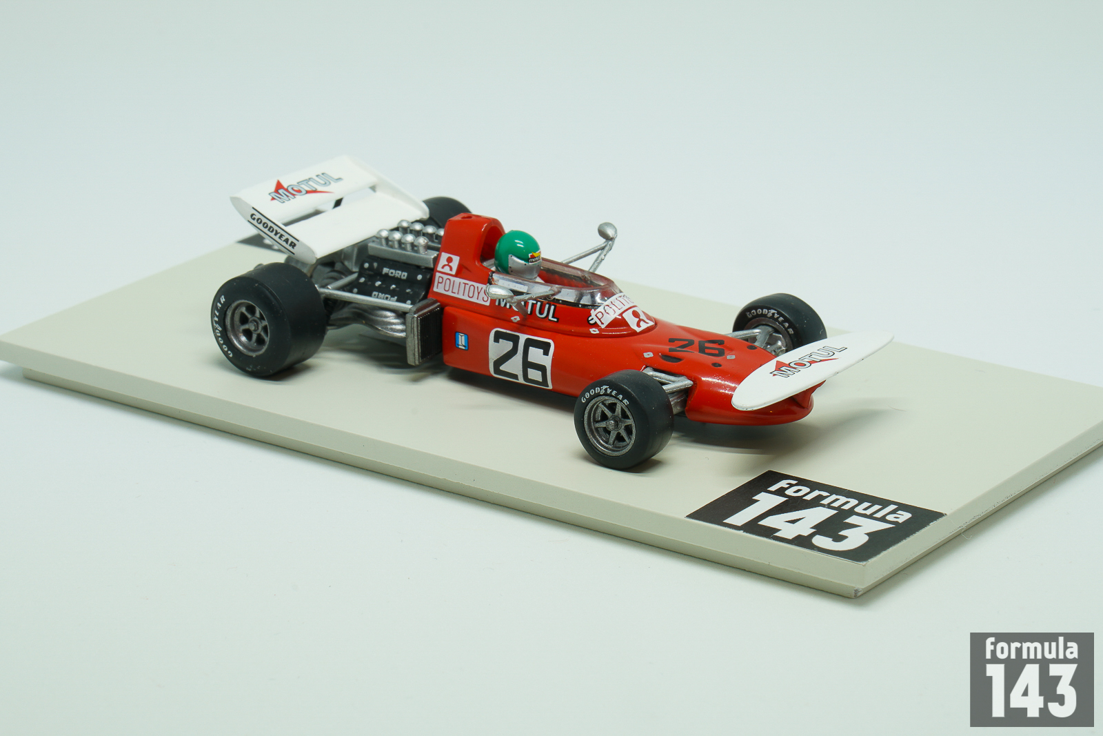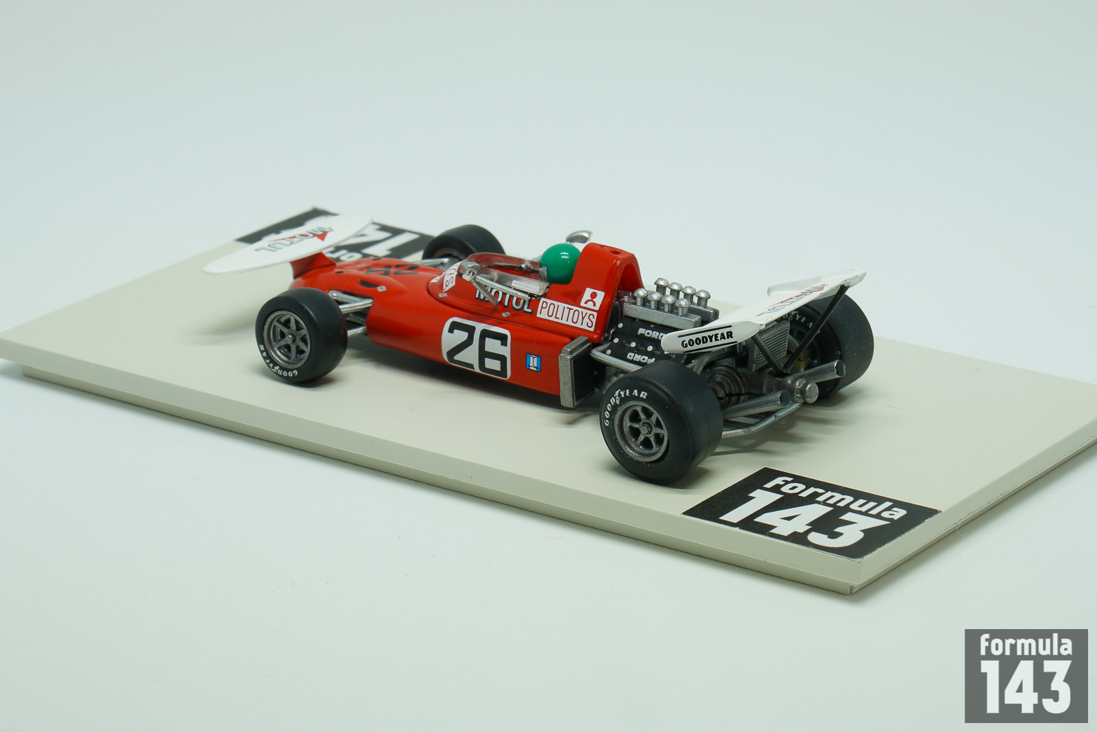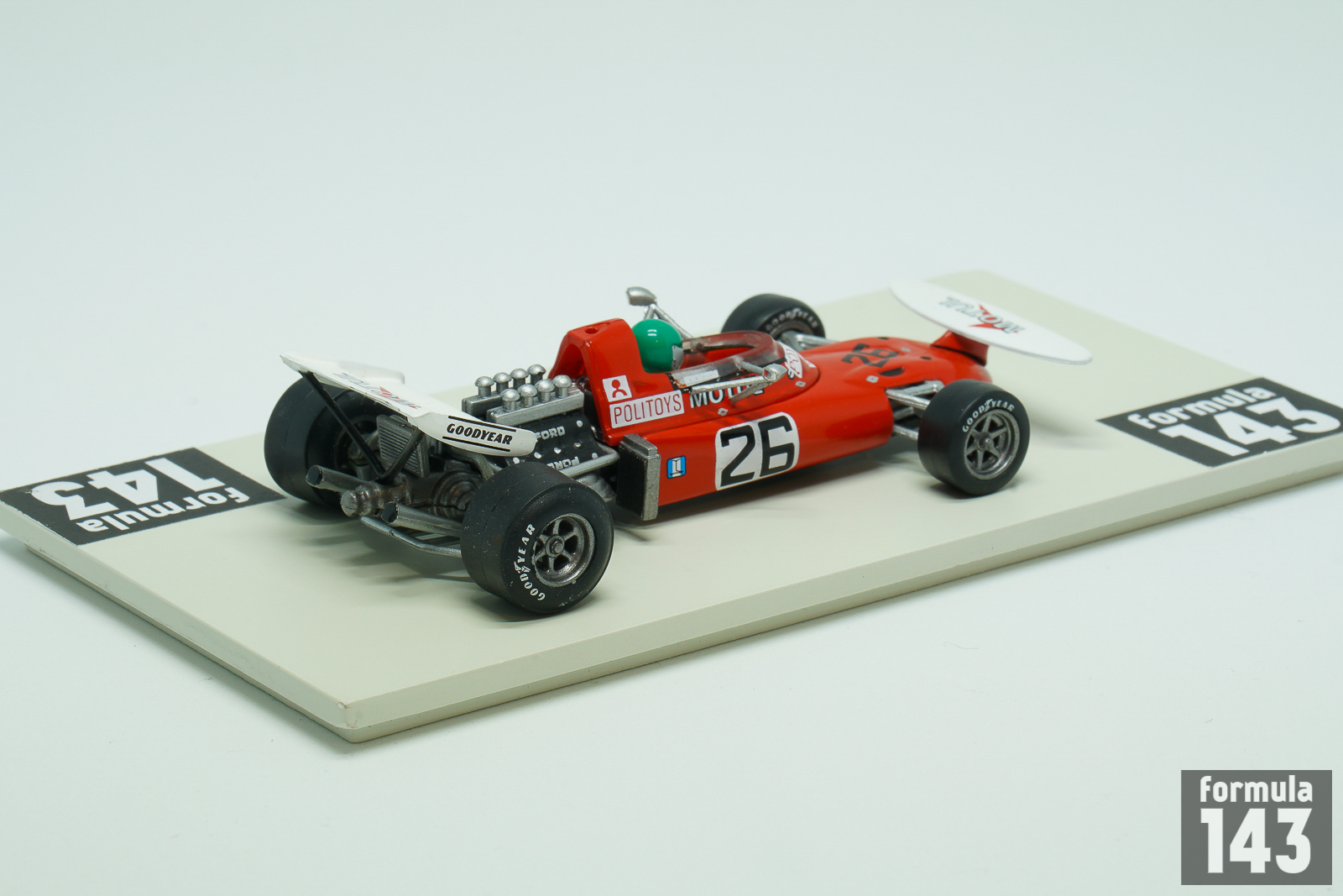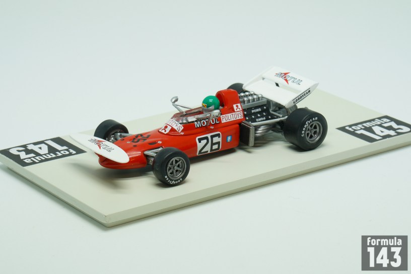 Very distinctive 711 was the second Formula 1 car produced by Macrh Engineering. The design was radically changed comparing to the 1970 March 701. The 711 had side-mounted radiators and inboard front brakes, although been moved outboard later in the season. But the most distinguished feature of the car was aerodynamics developed by Frank Costin. The very large elliptic front wing described as the Spitfire (for its shape) or “tea-tray” (for its elevation from the car), high cockpit sides merging into a head fairing, full engine cover and rear airfoil make the car very aerodynamically efficient. STP Corporation disbanded its own team, but continued to support the works team. Ken Tyrrell’s team started to use his own cars, so the main private entrant of the 711 was Frank Williams sponsored by oil company Motul and toys and scale models manufacturer Politoys. Williams signed former works Matra driver Henri Pescarolo. The team was very short of money, but 711 chassis and abilities of Pescarolo resulted in two finishes in the points – 4th in British Grand Prix and 6th in Austria.