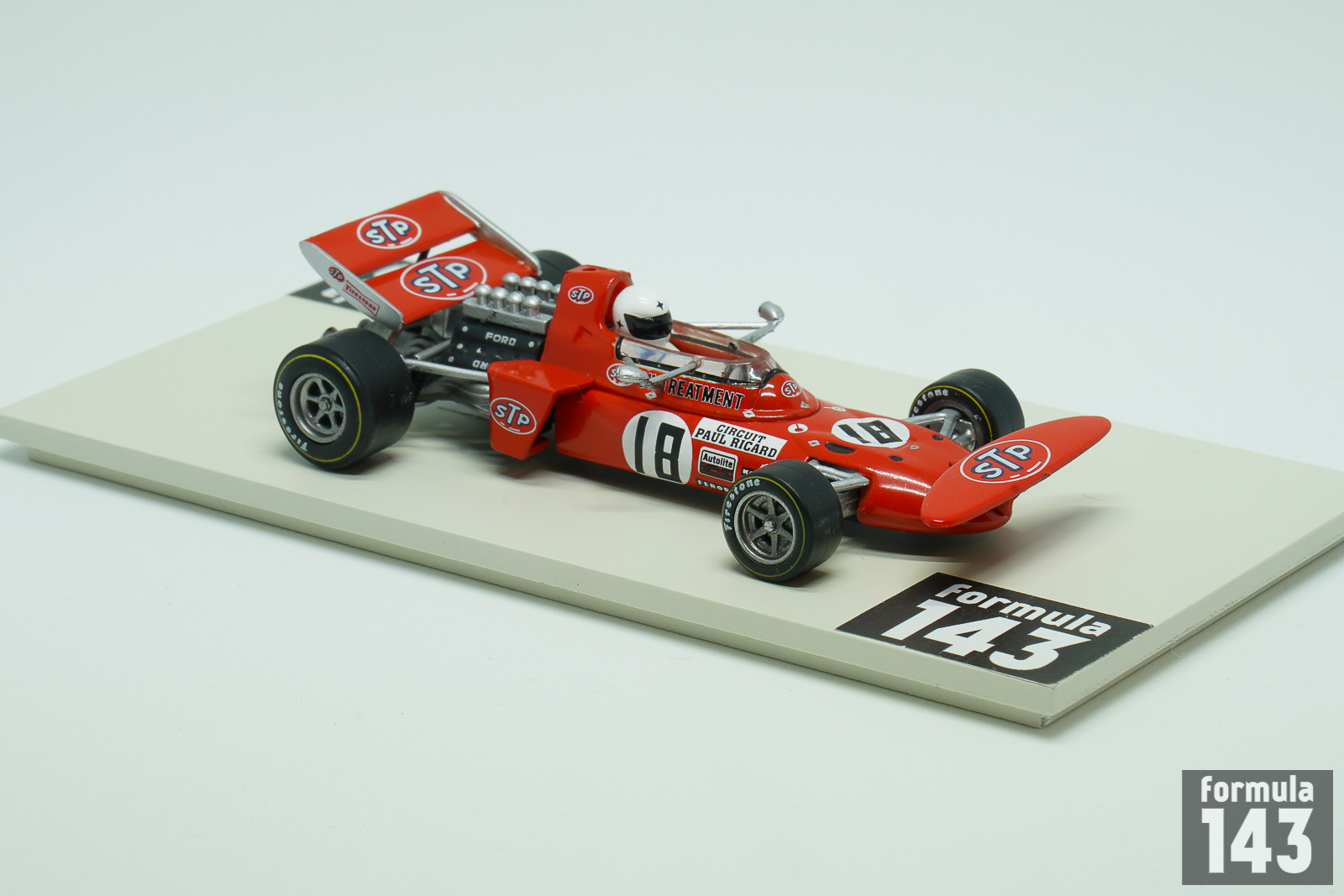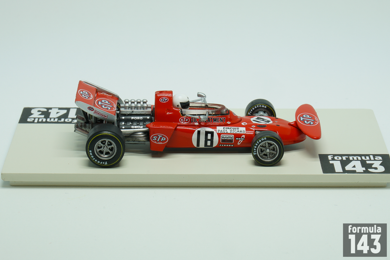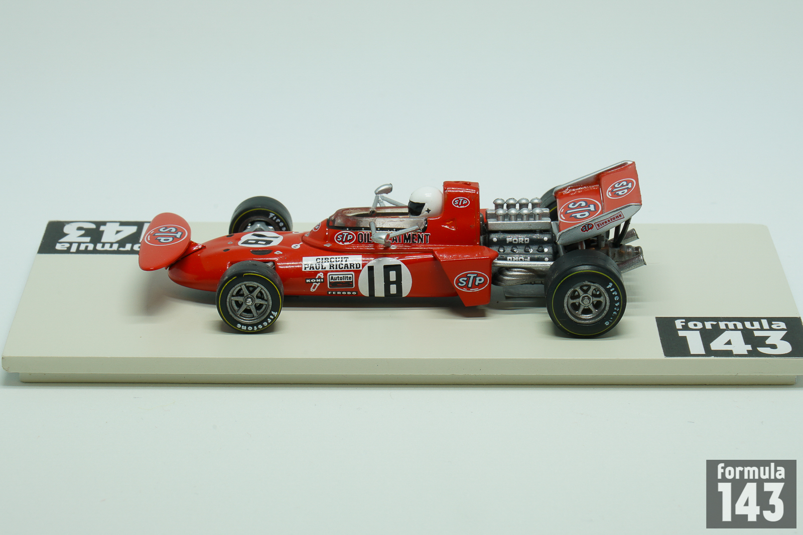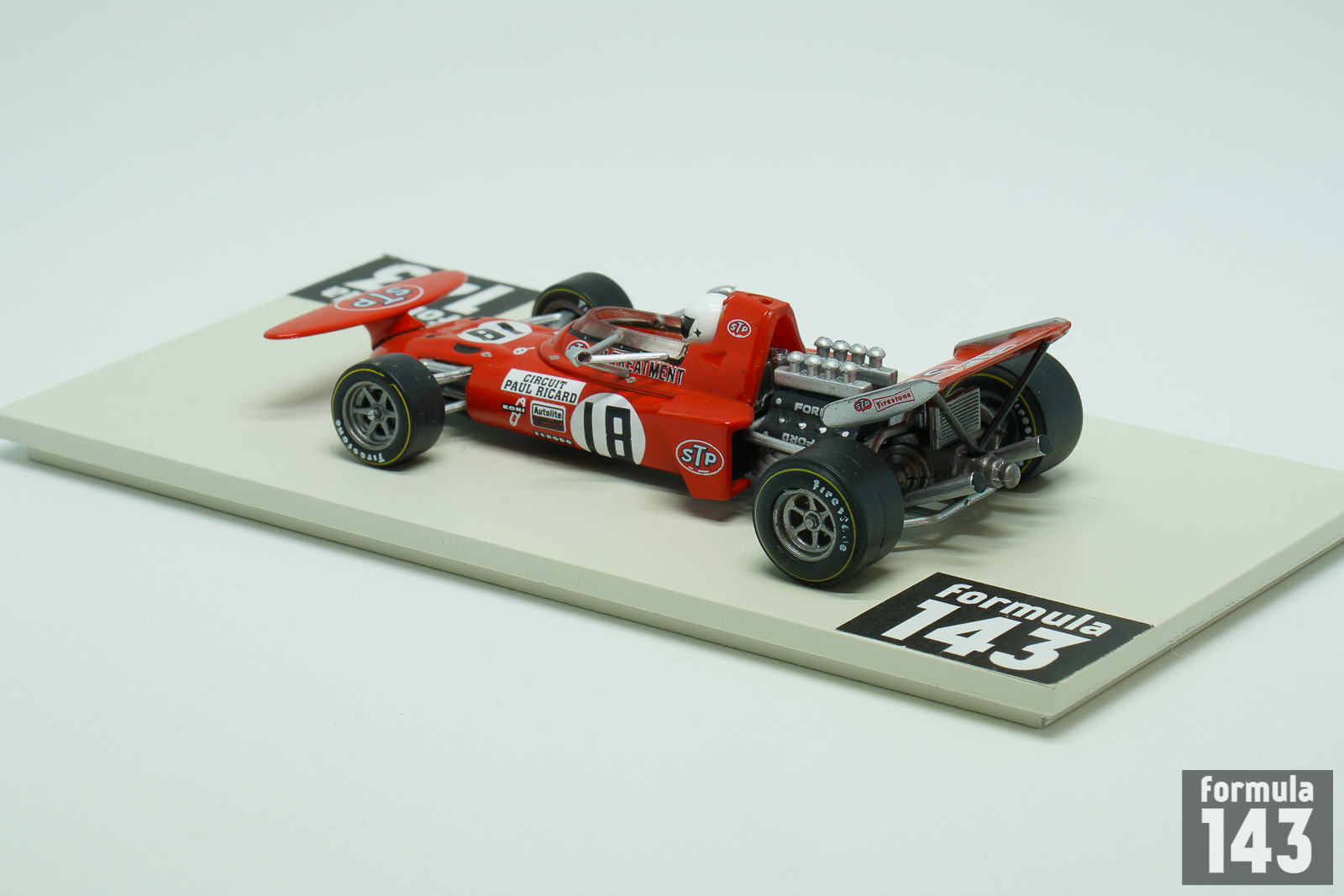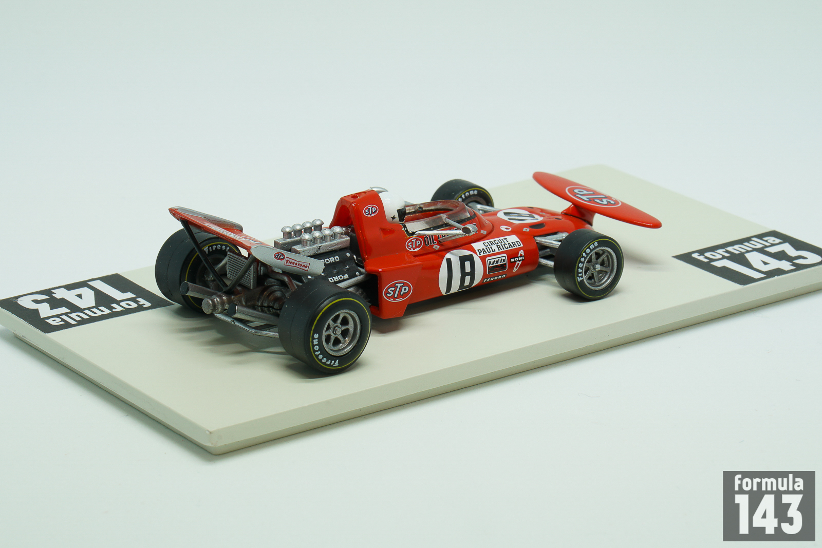 Very distinctive 711 was the second Formula 1 car produced by Macrh Engineering. The design was radically changed comparing to the 1970 March 701. The 711 had side-mounted radiators and inboard front brakes, although been moved outboard later in the season. But the most distinguished feature of the car was aerodynamics developed by Frank Costin. The very large elliptic front wing described as the Spitfire (for its shape) or “tea-tray” (for its elevation from the car), high cockpit sides merging into a head fairing, full engine cover and rear airfoil make the car very aerodynamically efficient. STP Corporation disbanded its own team, but continued to support the works team. Ronnie Peterson was signed as the principal driver of STP March Racing Team. Other woks cars were provided to Andrea de Adamich, Nanni Galli and Alex Soler-Roig. Soler-Roig, 40 years old racing driver from Barcelona, started at the first 5 rounds of the Championship, but did not reach the finish line at all of his races. At French Grand Prix at Circuit Paul Ricard Soler-Roig had retired very early due to oil pump failure. It was his last race for March.