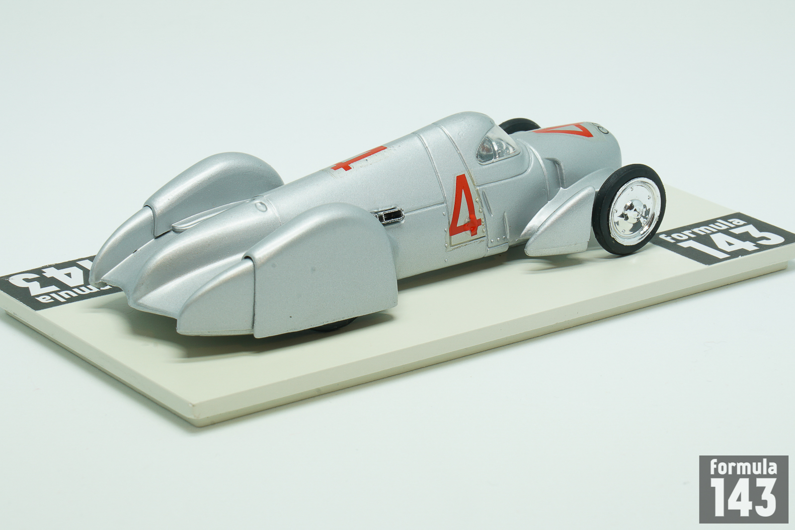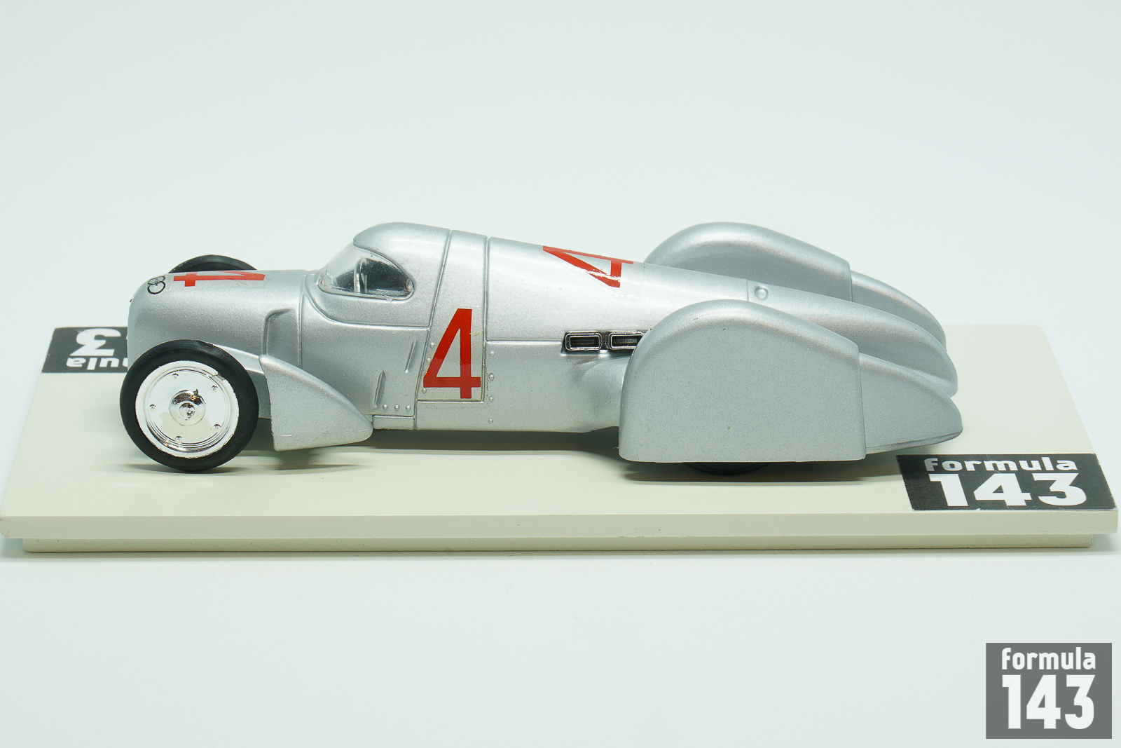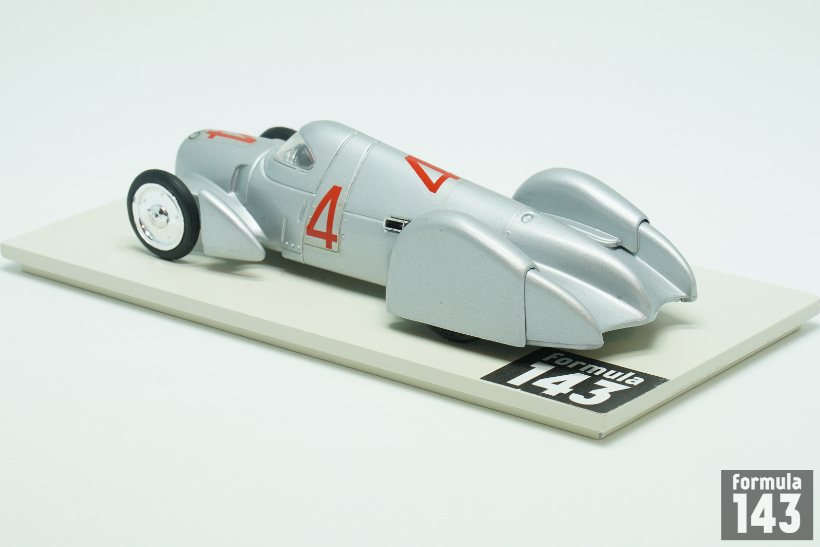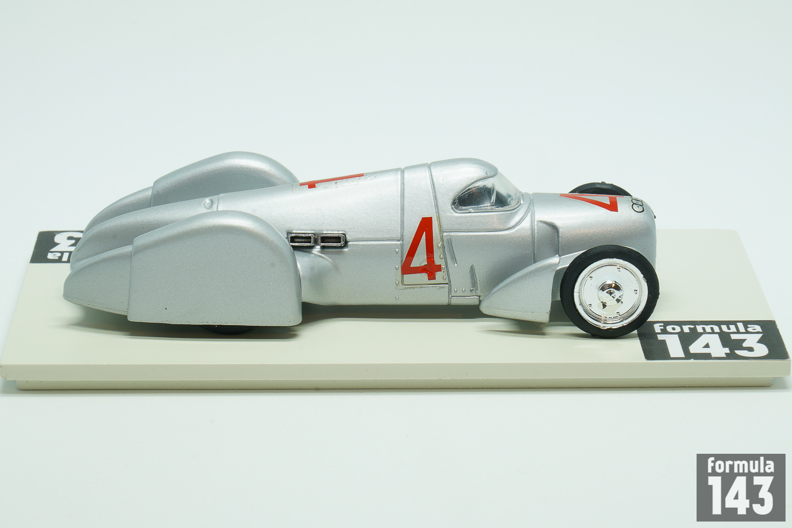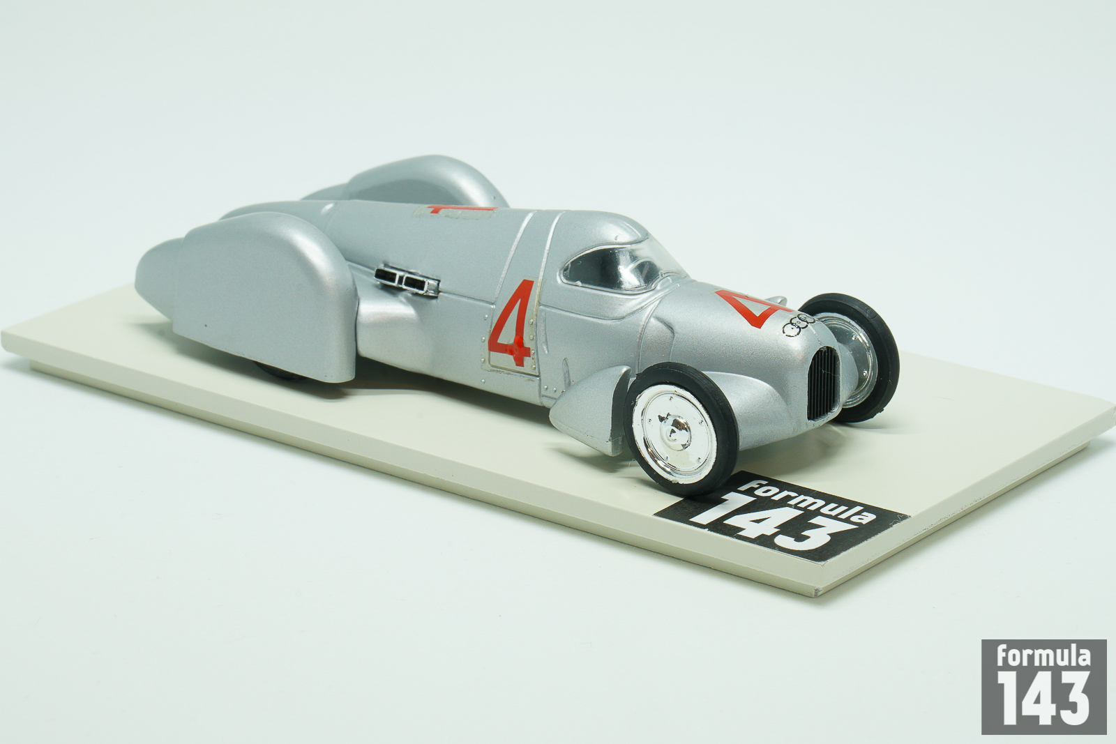 Pre-war Auto Union Grand Prix cars are, probably, one of the most famous racing cars in history. Indeed, German silver cars were technically most advanced racing machines of its time, as well as one of the most successful ones. The rivalry between Auto Union and Mercedes in the 1930s is definitely one of the pinnacles of motorsport history. Type A Auto Unions were built in 1934 and were powered by V16 4.L engine capable of 295 PS. The chassis was constructed with steel tube leader framework. As a consequence of the mid engine design the driver was placed far forward. The main fuel tank was mounted between the driver seat and the engine. Uneven weight distribution and the large amount of weight in the rear of the car made Auto Unions difficult to handle. Along with the main design with the open wheels and open cockpit, several streamlined cars (speedlimousines) with full cabin and enclosed rear wheels were built and used in some races and record runs. Type B built in 1935 was the second car in series of Auto Union racers produced in 1934 – 1939. The car was based in 1934 A-type model, but with very significant modifications. The original Porsche-designed V16 engine now had bigger valves and new cylinders, increasing compression from 7 to 8.95. The displacement of the engine was increased to 4,954 cubic centimeters (instead of 4,358 cc in A-type), as well as compressor pressure (0.75 bars vs 0.61),which resulted in the increase of power to 375 PS compared to 295 PS in type A. Chassis was constructed using new longer 105 mm chassis tubes. The cooling system was totally rebuilt with the frame no longer carrying water to the radiator. The two tanks were replaced with a single 210 liter main tank behind the driver keep fuel for 320 km Grand Prix distance. German drivers Hans Stuck, Bernd Rosemeyer and Italian Achille Varzi were regular Auto Union drivers for Grand Epreuves and major Hill Climbs, while Hermann zu Leiningen and Paul Pietsch occasionally drove in some other races. Despite at least 4 new B-type were built, three out of 5 1934 A cars were upgraded for 1935 season with higher compression, improved gearbox and brakes. Two of them were streamlined speedlimousines which were raced in 1935 Avus-Rennen in Berlin. The races held at Avus circuit which actually was two long stretches of public Autobahn connected by two short curves. The configuration of the circuit predispose to very high speed, so streamlined version might have some advantage over regular open-cockpit cars. Four Auto Unions were entered for the Avus race: Stuck and Varzi used conventional GP cars, and A-type modified streamliners were given to Rosemeyer and zu Leiningen. Talented 25-years old Rosemeyer was newcomer to the team while for 33-years old Nobleman Prince zu Leiningen it was his 6 season in Grand Prix racing. But for both of them the race ended equally unsuccessfully with the retirements in preliminary heats. Rosemeyer’s car suffered from tire puncture and engine problems in heat 1, and zu Leiningen did not finish heat 2 due to engine failure. This Brumm model of the car driven by Rosemeyer is designated as Auto Union B, but actually it is type A chassis modified for 1935 season. Earlier, in February 1935, this 1935 streamliner Auto Union car also was driven to a new world record for 1 mile of 320.267 km/h at the Florence – Pisa autostrada at Lucca by Hans Stuck.
