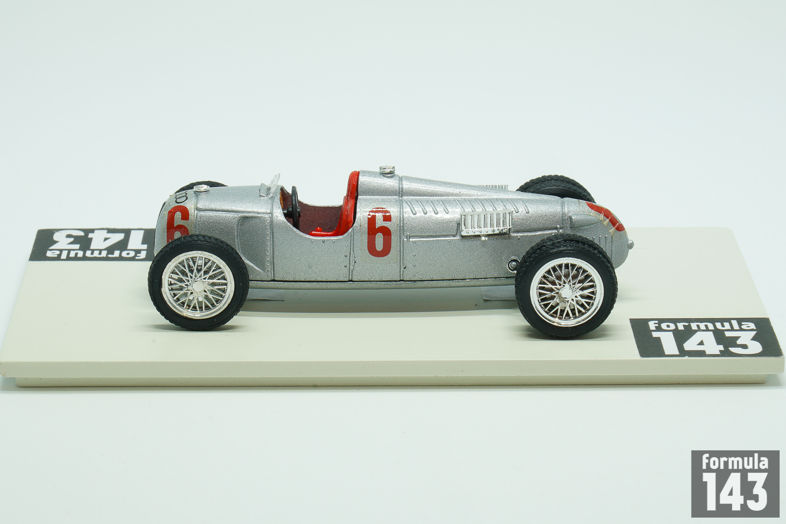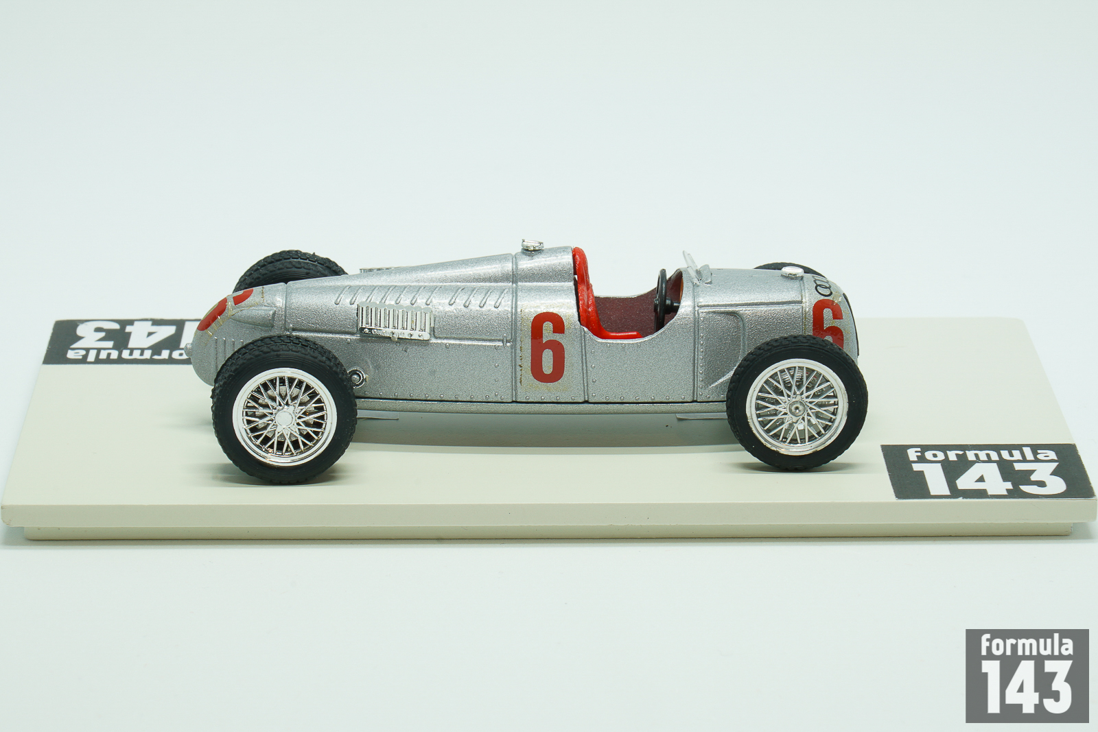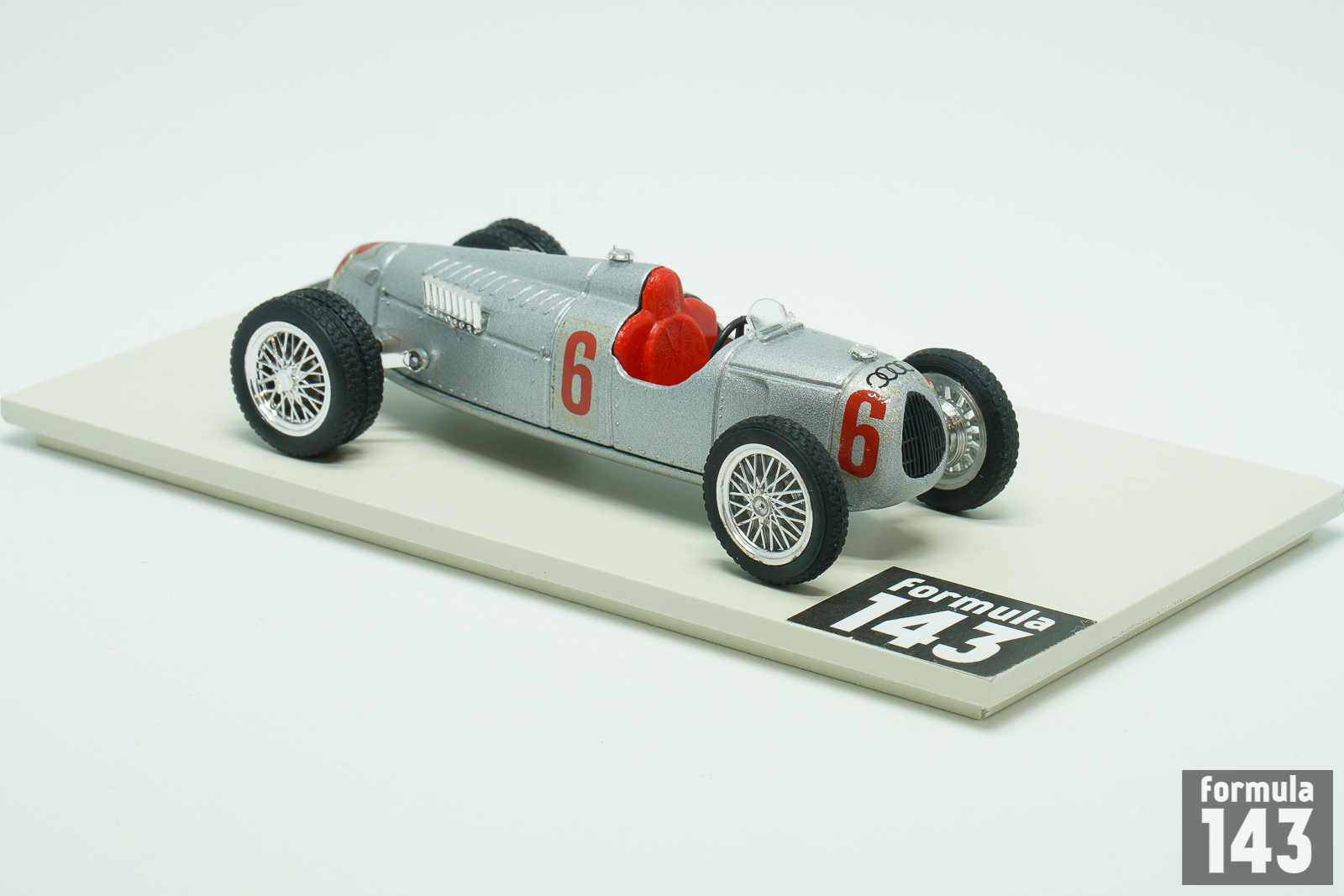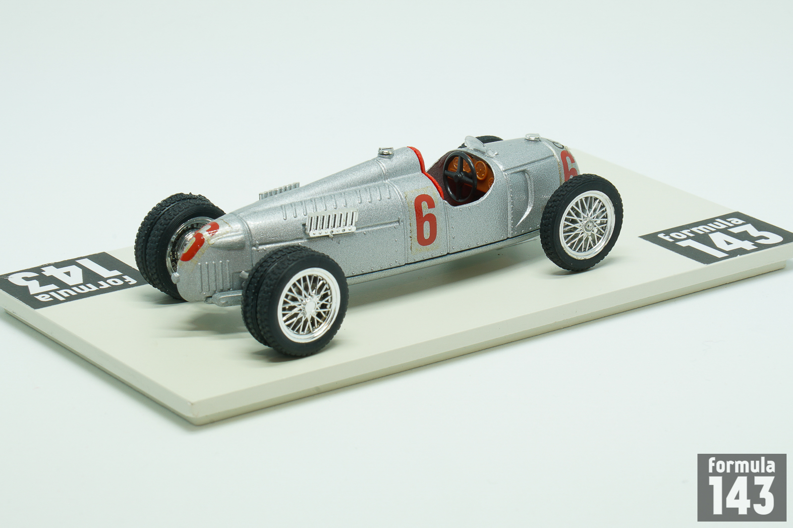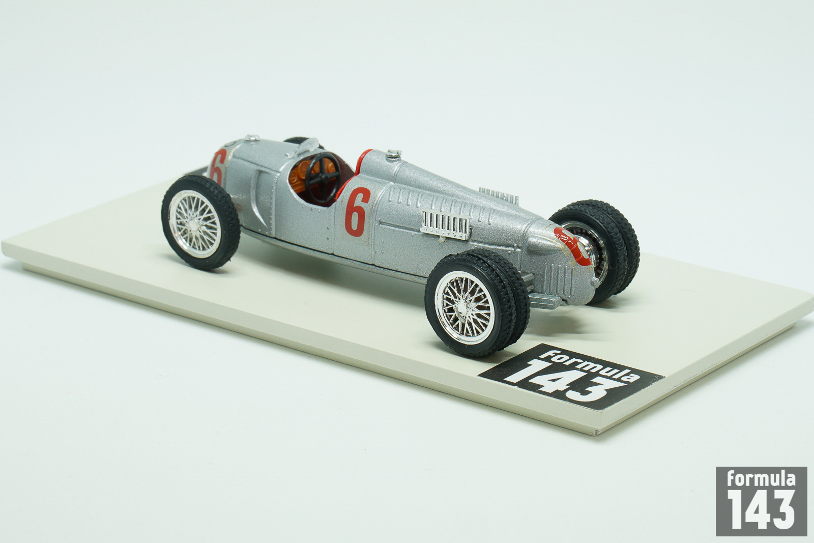 The third evolution of Auto Union race cars, Type-C, appeared in 1936 and was designed by Ferdinand Porsche. V16 engine with Roots supercharger was extended to 6005 cc and was capable of 520 bhp at 5000 rpm. It was the largest possible design within the 750-kg weight limit. Bernd Rosemeyer, Hans Stuck and Achille Varzi were main Auto Union drivers in 1936, and team line-up was completed by Ernest von Delius and Rudolf Hasse. New Auto Union car became more competitive than B-type of 1935, and allowed Rosemeyer to win the European Drivers’ Championship, established by the Association Internationale des Automobile Clubs Reconnus (AIACR). Rosemeyer won 3 out of 4 Grand Prix (German, Swiss and Italian) counted for the Championship. Two more victories in Eifelrennen and Coppa Acerbo completed his GP record for 1936. The version of C-type with double rear wheels was used in some Hill Climb events, very popular form of motorsport of that time, where Auto Union was competed very actively. Hans Stuck won La Turbie Mountainclimb in France, and Rosemeyer was the winner at Grosser Bergpreis of Germany and at Feldbergrennen. But this scale model by Brumm cannot be attributed to any of the mentioned Hill Climb events.