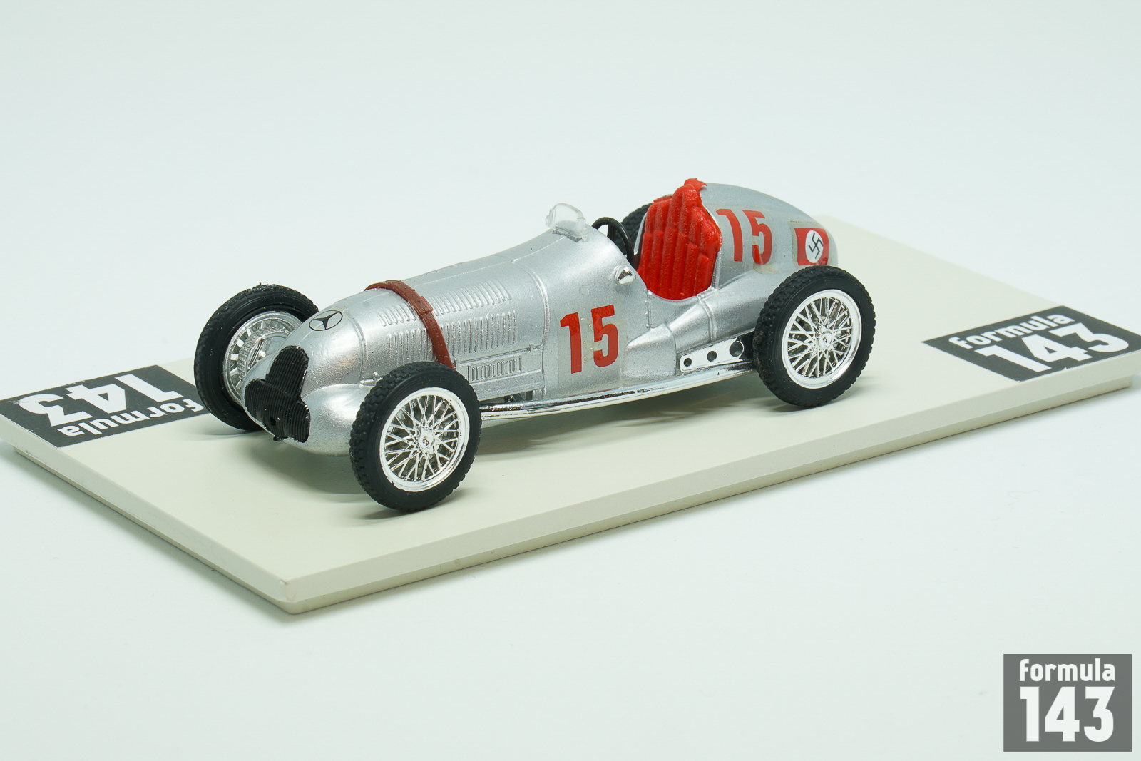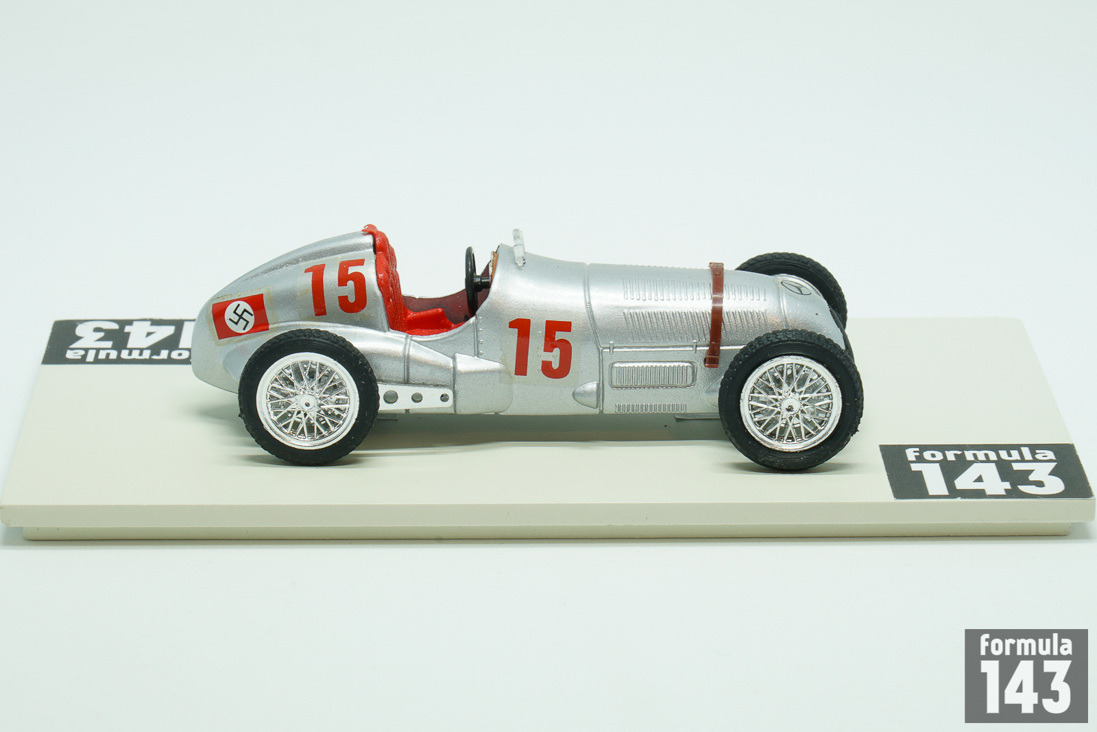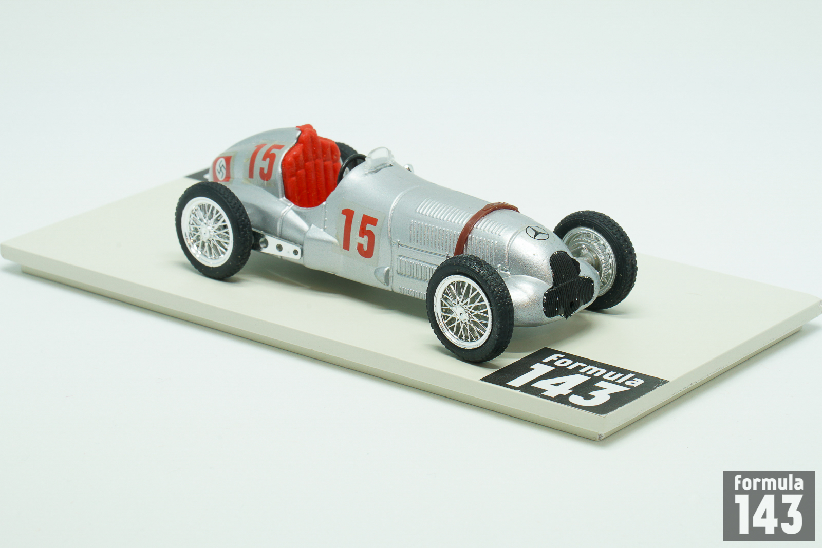 The Merecedes-BenzW125 used by Daimler-Benz AG during the 1937 Grand Prix season was the most powerful pre-war Grand Prix car. Only in early 1980s turbo-era Formula 1 cars were able to surpass it in power. Designed by Daimler-Benz engineering team lead by Rudolf Uhlenhaut, W125 was powered by supercharged 8-Cylinder 5.6-litre engine capable to develop 595 horse power. The W125 won 6 out of 12 races where it took part, and Rudolf Caracciola won the European Driver’s Championship with the W125. Daimler-Benz drivers won 4 out of 5 European Championship races in 1937 – Caracciola was victorious in German, Swiss and Italian Grand Prix; Manfred von Brauchitsch won in Monaco. The rivals from Auto Union could only take one GP in Belgium. Mercedes driver lineup for 1937 was Rudolf Caracciola, Manfred von Brauchitsch and Hermann Lang as drivers with British Richard Seaman and Swiss Christian Kautz as junior drivers and Italian Goffredo Zehender as reserve. Seaman who signed for Mercedes-Benz against the wishes of his mother, who did not want him to drive for a “Nazi” team, got the chance to drive W125 in two Grand Epreuves in 1937 – in Germany and Italy. In addition Englishman started in many smaller Gran Prix finishing best as 2nd in Vanderbilt Cup at Roosevelt Raceway in New York. His car from this event is present in this scale model by Brumm. Seaman, who was one of the Adolf Hitler’s favorite drivers, continued to race for Mercedes in 1938-39 taking his first win in a major Grand Prix in 1938 German GP. In 1939 he fatally crashed driving the Mercedes-Benz when leading the Belgian GP in a wet race.