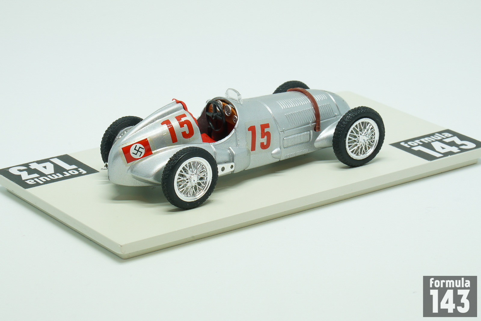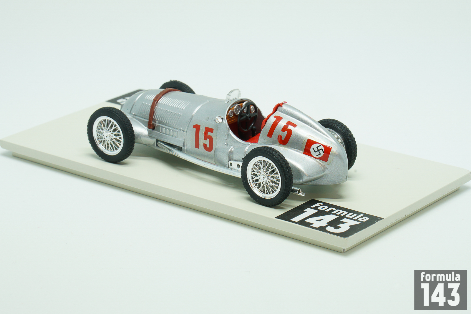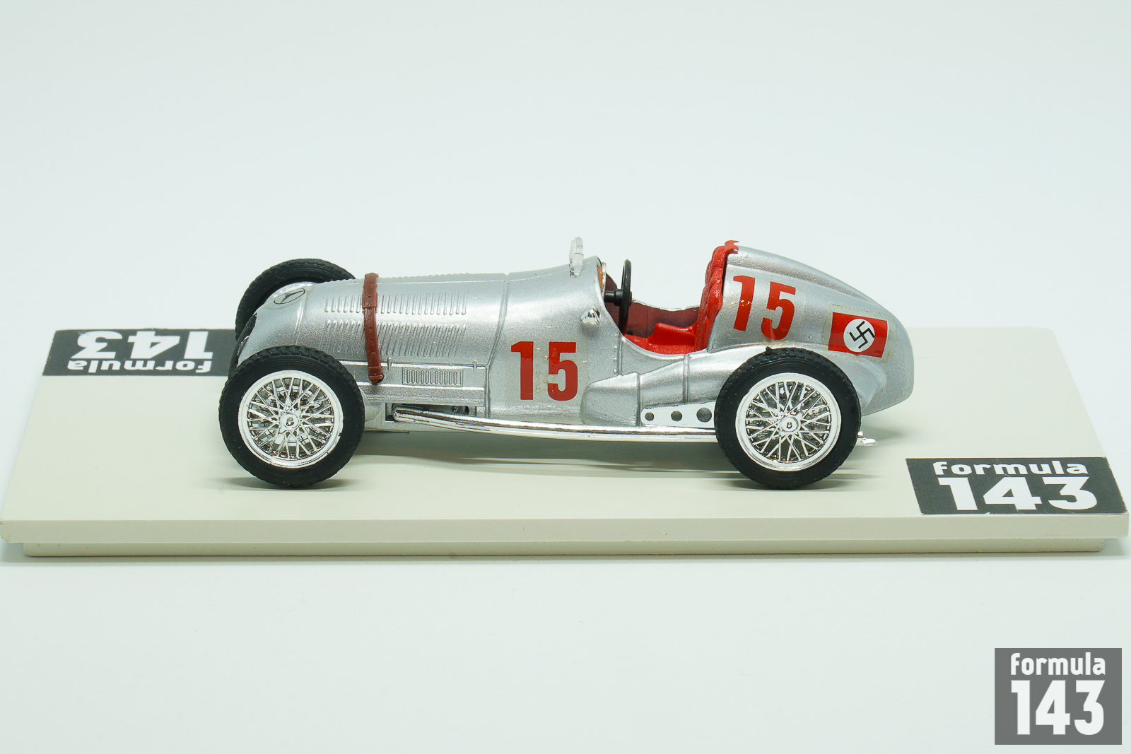 The Merecedes-BenzW125 used by Daimler-Benz AG during the 1937 Grand Prix season was the most powerful pre-war Grand Prix car. Only in early 1980s turbo-era Formula 1 cars were able to surpass it in power. Designed by Daimler-Benz engineering team lead by Rudolf Uhlenhaut, W125 was powered by supercharged 8-Cylinder 5.6-litre engine capable to develop 595 horse power. The W125 won 6 out of 12 races where it took part, and Rudolf Caracciola won the European Driver’s Championship with the W125. Daimler-Benz drivers won 4 out of 5 European Championship races in 1937 – Caracciola was victorious in German, Swiss and Italian Grand Prix; Manfred von Brauchitsch won in Monaco. The rivals from Auto Union could only take one GP in Belgium. Mercedes driver lineup for 1937 was Rudolf Caracciola, Manfred von Brauchitsch and Hermann Lang as drivers with British Richard Seaman and Swiss Christian Kautz as junior drivers and Italian Goffredo Zehender as reserve. Seaman who signed for Mercedes-Benz against the wishes of his mother, who did not want him to drive for a “Nazi” team, got the chance to drive W125 in two Grand Epreuves in 1937 – in Germany and Italy. In addition Englishman started in many smaller Gran Prix finishing best as 2nd in Vanderbilt Cup at Roosevelt Raceway in New York. His car from this event is present in this scale model by Brumm. Seaman, who was one of the Adolf Hitler’s favorite drivers, continued to race for Mercedes in 1938-39 taking his first win in a major Grand Prix in 1938 German GP. In 1939 he fatally crashed driving the Mercedes-Benz when leading the Belgian GP in a wet race.