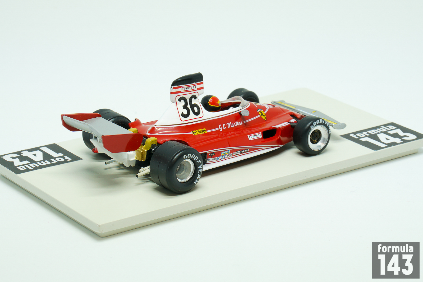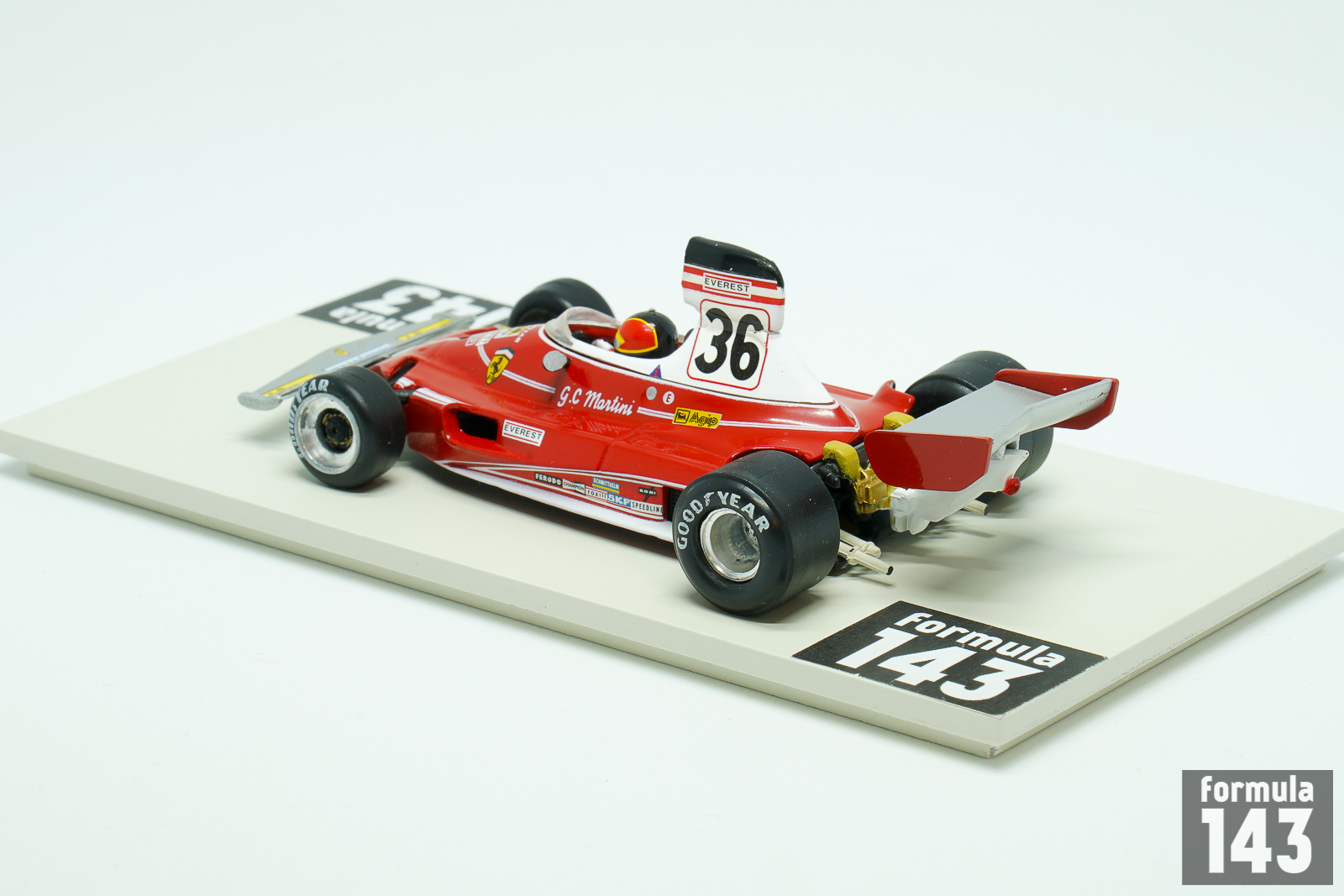 Giancarlo Martini, uncle of the racing drivers Pierluigi Martini and Olivier Martini, in the mid-1970 drove in European formula 2 championship for Scuderia Everest, the team run by Giancarlo Minardi. In 1976 on behalf of Scuderia Everest Giancarlo Minardi signed a three-year deal with Ferrari to enter a Ferrari 312T in secondary events with the aim to provide talented up-and-coming Italian drivers with F1 experience. Scuderia Everest ran the loaned Ferrari 312T-021 for Giancarlo Martini in the Daily Mail Race of Champions at Brands Hatch and in the BRDC International Trophy at Silverstone – these were the year’s only non-championship events. Martini, who was 28 at the time, managed to shunt 312T on the warm-up lap in Brands Hatch and finished 10th in the International Trophy. Quartzo made the models from both races, car #36 with the white upper air intake from Brands (4054A), and car #36 with black one from Silverstone (4054B). For both models the car is designated as “British GP 1976 ‘Test Car’” on the plate. See also model of Martini’s car from BRDC Int’l Trophy from Ferrari F1 Collection.