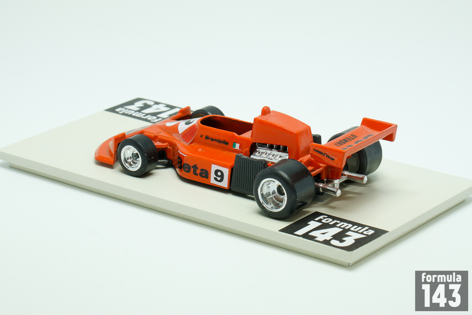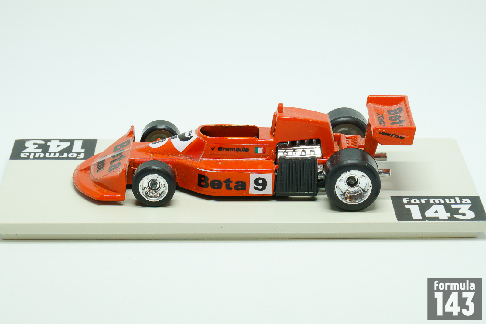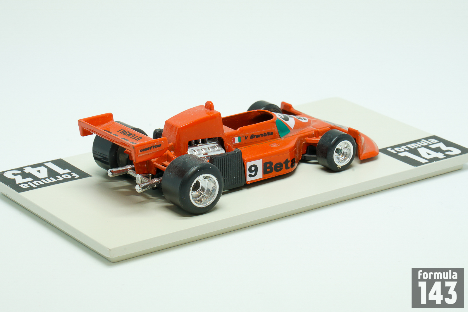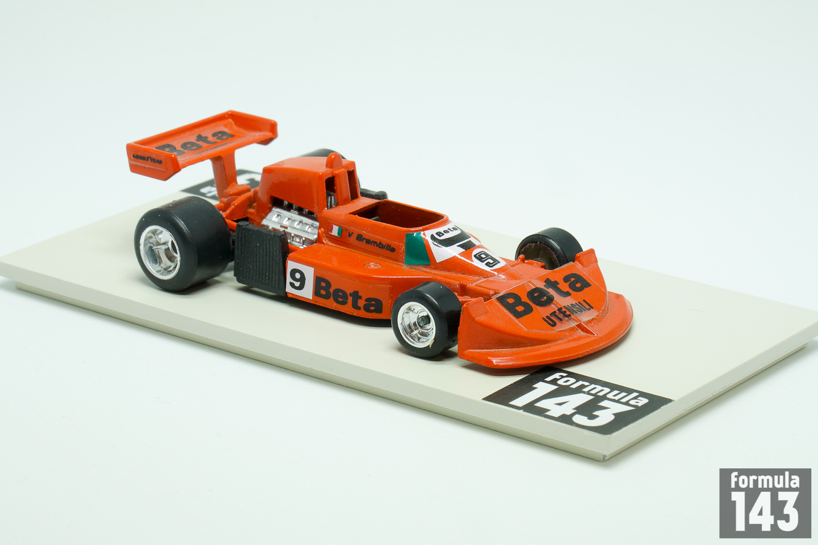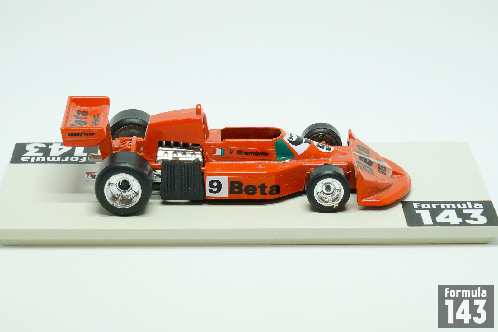 March F1 car for 1976 season was at the disposal of works March Engineering team with Ronnie Peterson, Hans-Joachim Stuck, Vittorio Brambilla, Arturo Merzario and Lella Lombardi. Due to a small budget, the cars tending to turn up in different liveries as race-by-race sponsorship deals were signed. Brambilla was entered under Beta sponsorship, Merzaio raced for Ovoro and Lombardi was sponsored by Lavazza. Vittorio Brambilla continued to race for March for the third consecutive season, and for the second season under Beta sponsorship. The hopes after his first and only GP victory in 1975 Austrian Grand Prix was high, but the 761 was very fragile and unreliable despite being quite fast. Brambilla managed to finish 6th in Zandvoort, while Ronnie Peterson was able to drove the same works 761 to the victory at the fastest race of the season at Monza. The contemporary model was made by Italian Polistil company. Compare with the model by John Day.