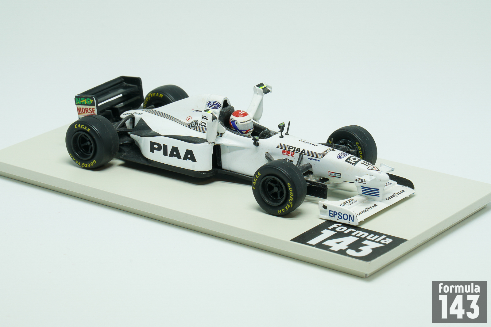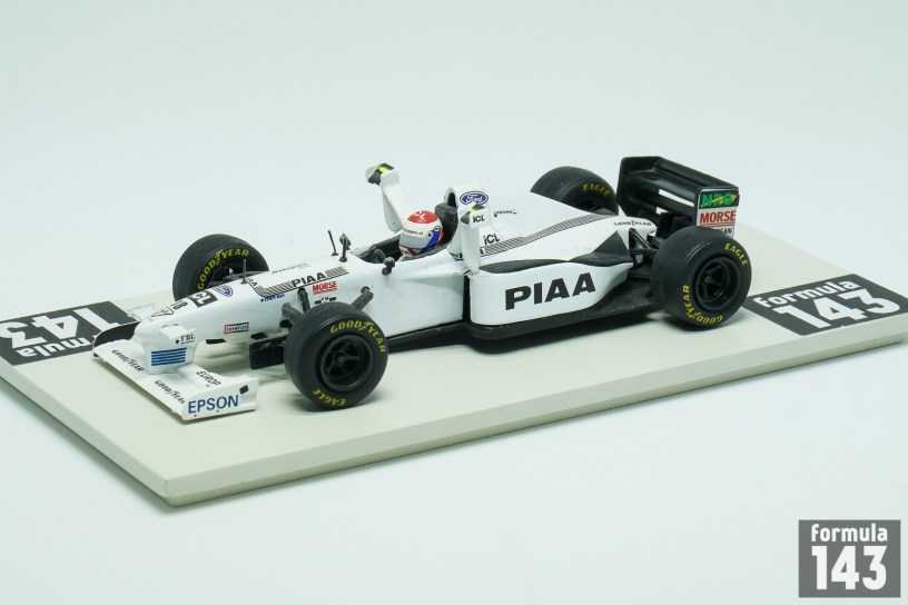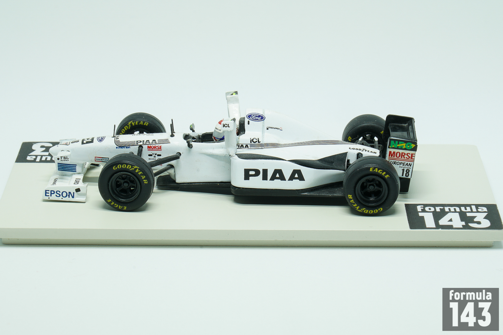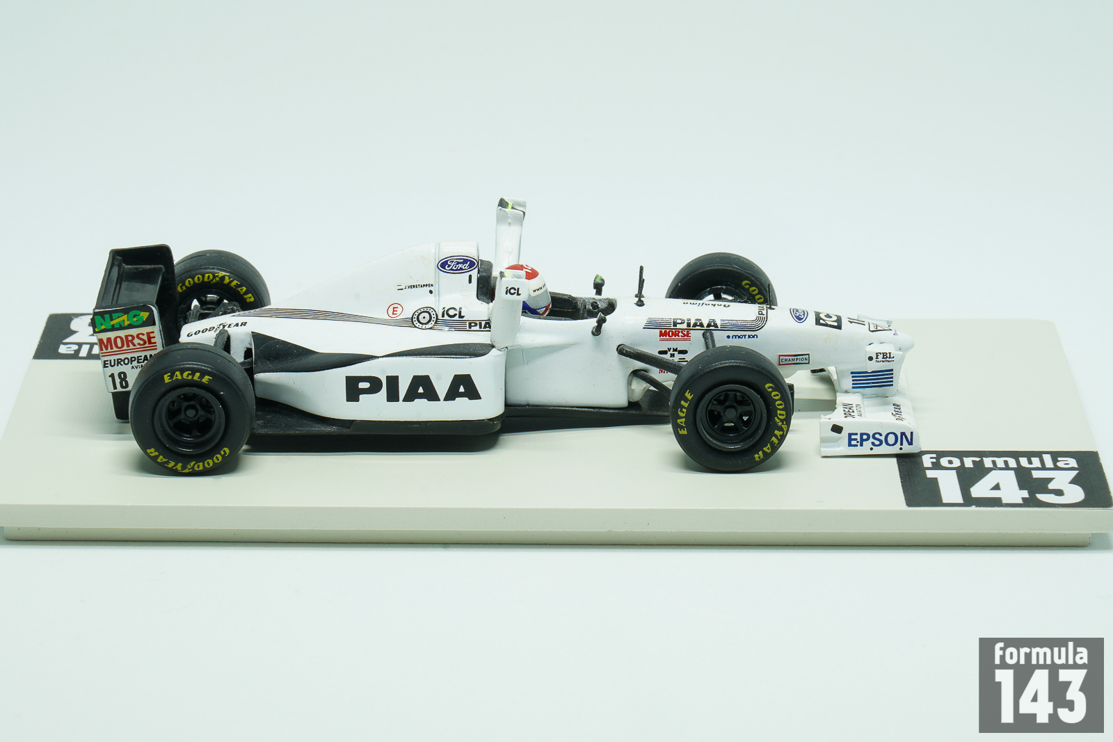 Tyrrell 025 designed by Harvey Postlethwaite was the further evolution of 024 from the previous season. The major revision was the replacement of very unreliable Yamaha V10 engine with Ford V8. The car was driven by Finn Mika Salo and Dutch Jos Verstappen, who moved from Footwork. The drivers duo was fast, the car was well balanced but the lack of power restricted them to the battles at the back of the grid. Tyrrell drivers were able to compete for high positions only at slow circuits. The only 2 points for Tyrrell were brought by Salo in Monaco when he managed to finish 5th. Verstapeen’s best finish was 8th position in the same race. Despite a disappointing season, as ever Tyrrell used a fair degree of technical innovation. On high-downforce circuits (such as Monaco and Imola), two additional wings were installed on either side of the cockpit. X-wings on Verstappen’s car was painted yellow and Salo’s dark orange to distinguish between two drivers – the feature which was introduced later by other teams with different colors of top camera. The “X-wings” would be banned during 1998 after safety concerns in the pitlane. The scale model by Onyx represents Verstappen’s car with X-wings from San Marino GP.