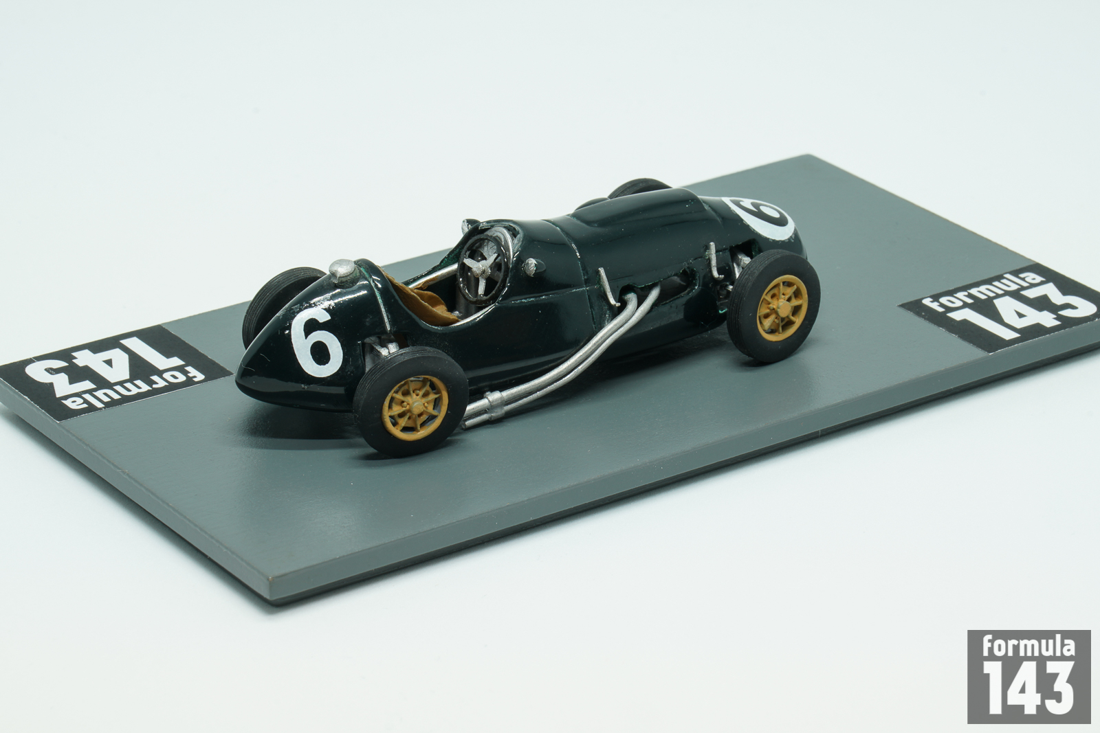 Cooper T23 – Bristol, or Cooper-Bristol MkII, built by Cooper Cars in 1953 was the further development of T20 (MkI) from 1952. The T23 had many improvements, such as a lighter tubular frame and larger brakes. The 11-inch Alfin light-alloy drum brakes of MkII were very significant improvement because drum brakes of the MKI had been one of the vehicles achilles heal. The body was slightly redesigned, making it smoother and more aerodynamic. T23 was powered by the same Bristol engines as T20. The car failed to score any championship points during the 1953 season, but was used extensively in many non-championship races by lot of private drivers and teams. One of these privateers was Horace Gould from Bristol, who entered his cars as Gould’s Garage (Bristol). This scale model produced by K&R Replicas represents Gould’s T23 from I London Trophy. The race was held in Crystal Palace on 19 September 1953. Both heats of the race were won by Stirling Moss on Cooper-Alta t24, while Gould was 5th in Heat 1 and 4th in Heat 2.