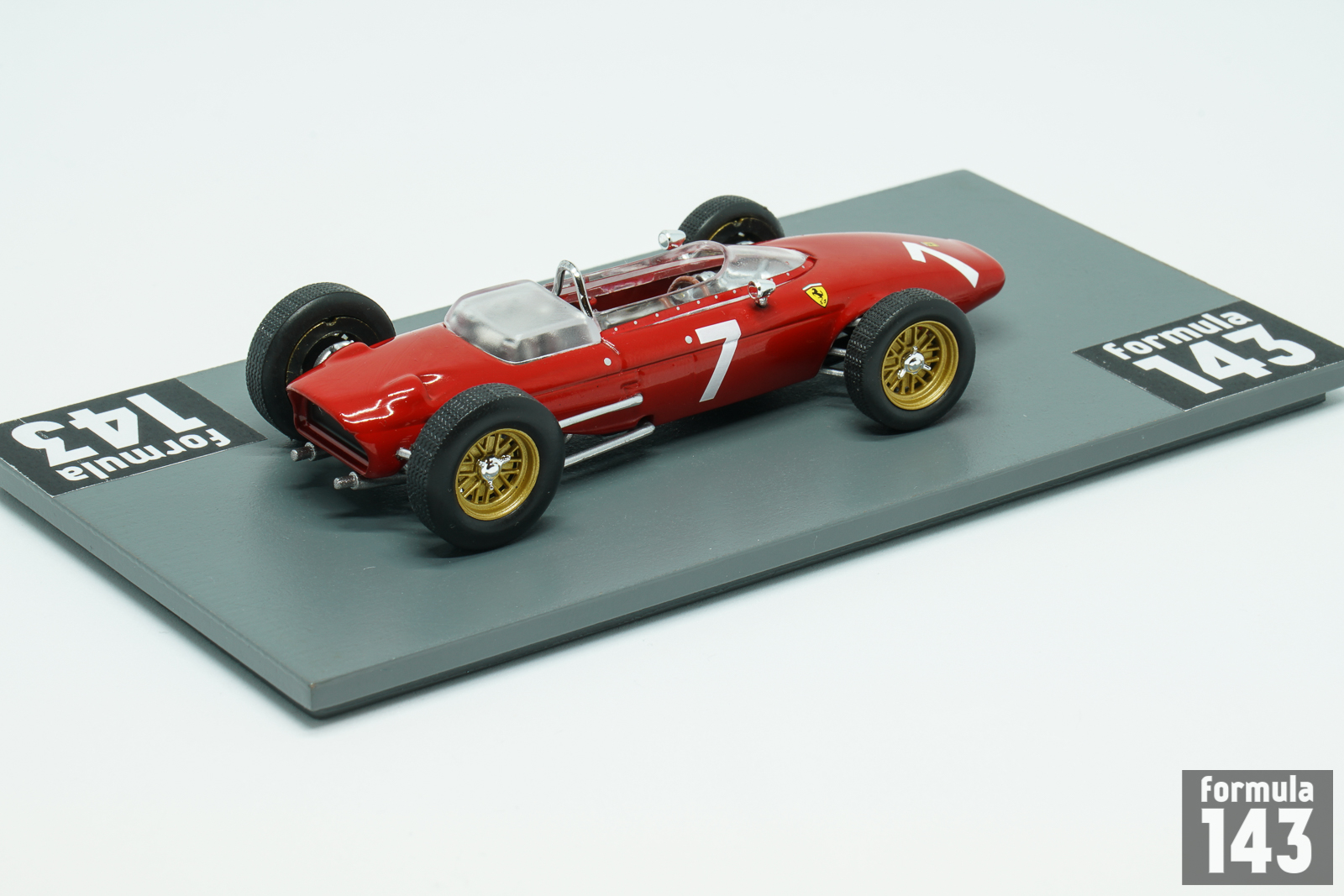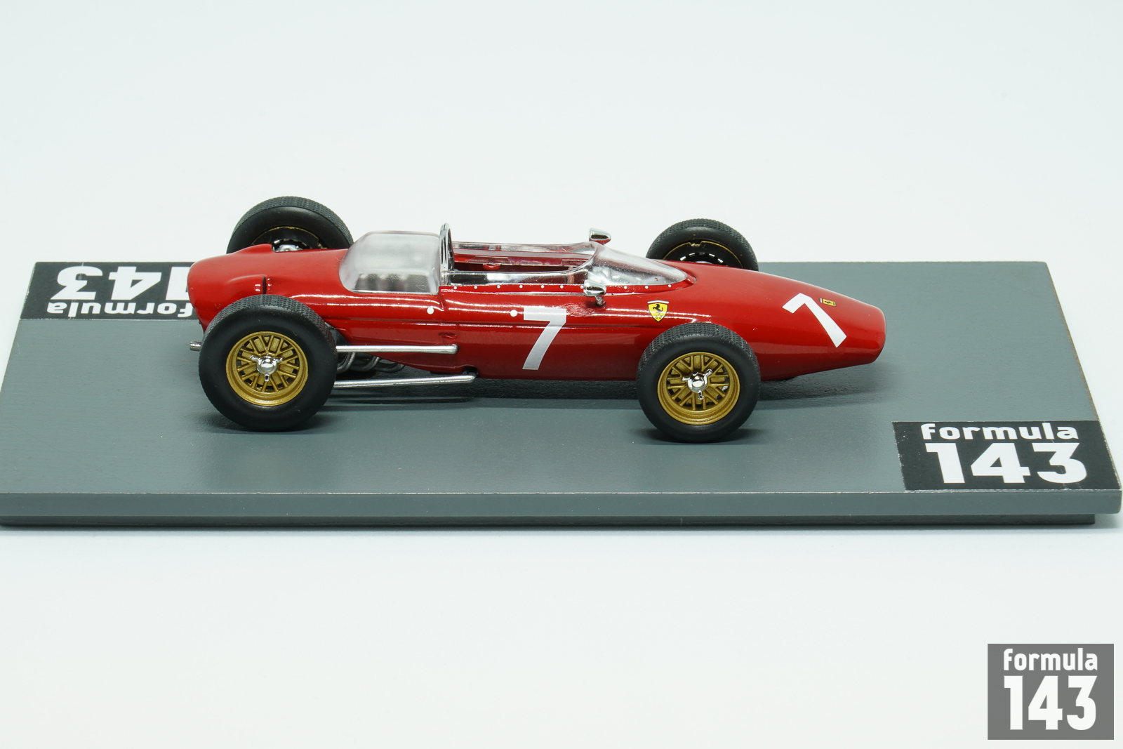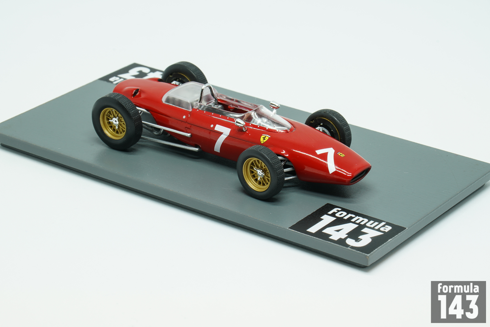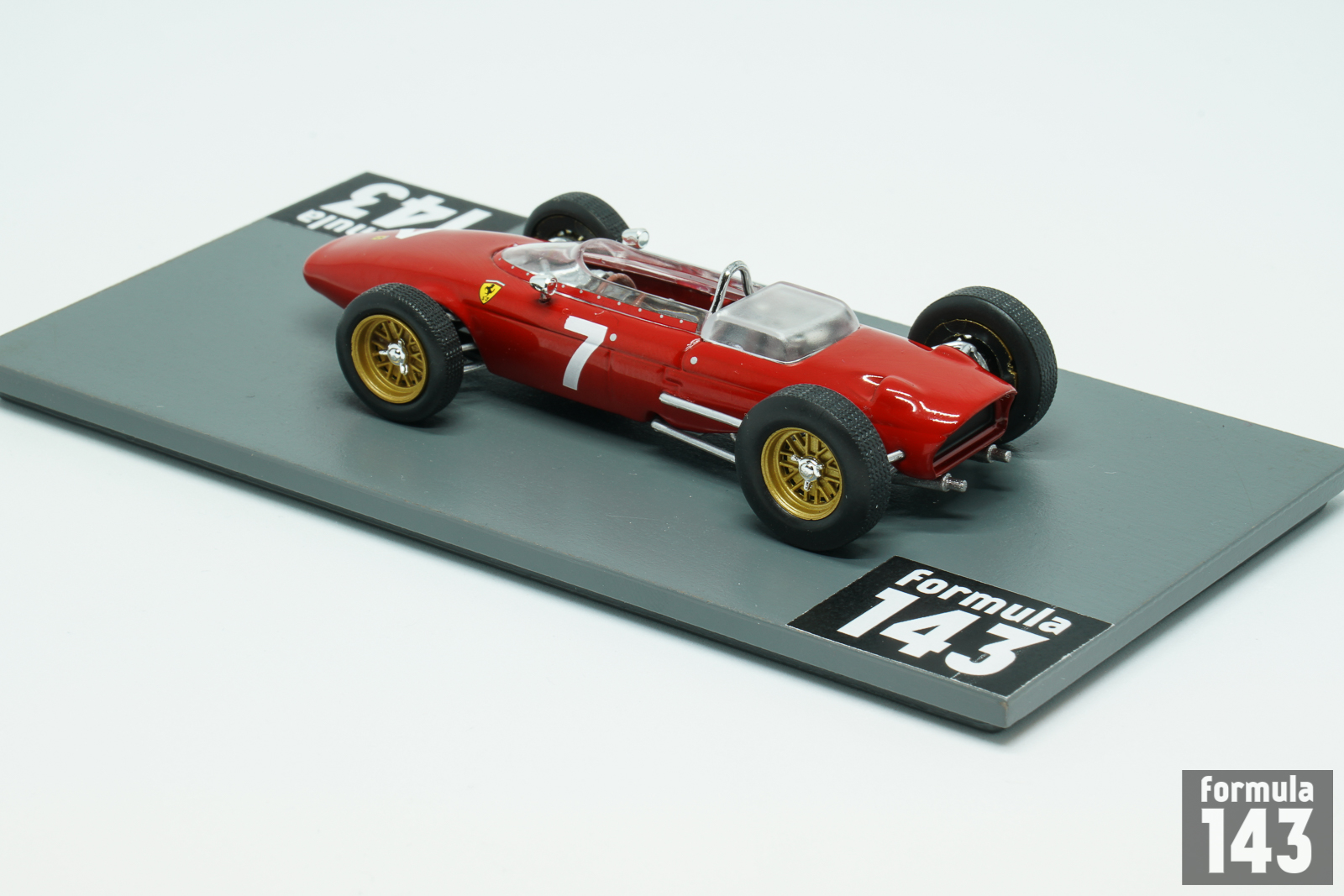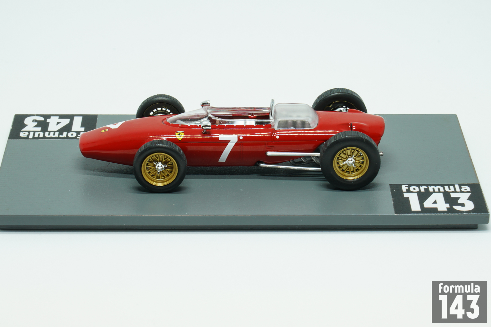 The Ferrari 156 was developed by the team from Maranello in 1961 to comply with new 1.5-Lirte Formula 1 regulations. The car was built around tubular spaceframe chassis and was powered by Ferrari Type 178 1,476 cc V6 engine developing 190 bhp. In 1961-62 Ferrari 156 features distinctive sharknose design, but the updated version (156-63) used in 1963 and 1964 had a rather conventional intake. The 1963 156 boasted two innovative features. The first was a semi-monocoque chassis, i.e. one with external panels riveted to the load-bearing tubular structure, which improved the overall robustness of the car. The second feature was a direct fuel injection engine developed in association with Swiss technician May, who used the high pressure Bosch pump in it. However, the car still failed to convince, so the direct fuel injection was abandoned. For John Surtees, 6-time motorcycle World Champion in 1958-60, it was his first season in Ferrari. After a couple of podiums he achieved his first win in German Grand Prix at Nurburgring. This scale model from Ferrari Formula 1 Collection reproduce Surtees’ car from this race. This remains the only Ferrari victory in 1963 season. In the final standings Surtees and Ferrari both were placed 4th in Driver’s and Constructors’ Championships, respectively.