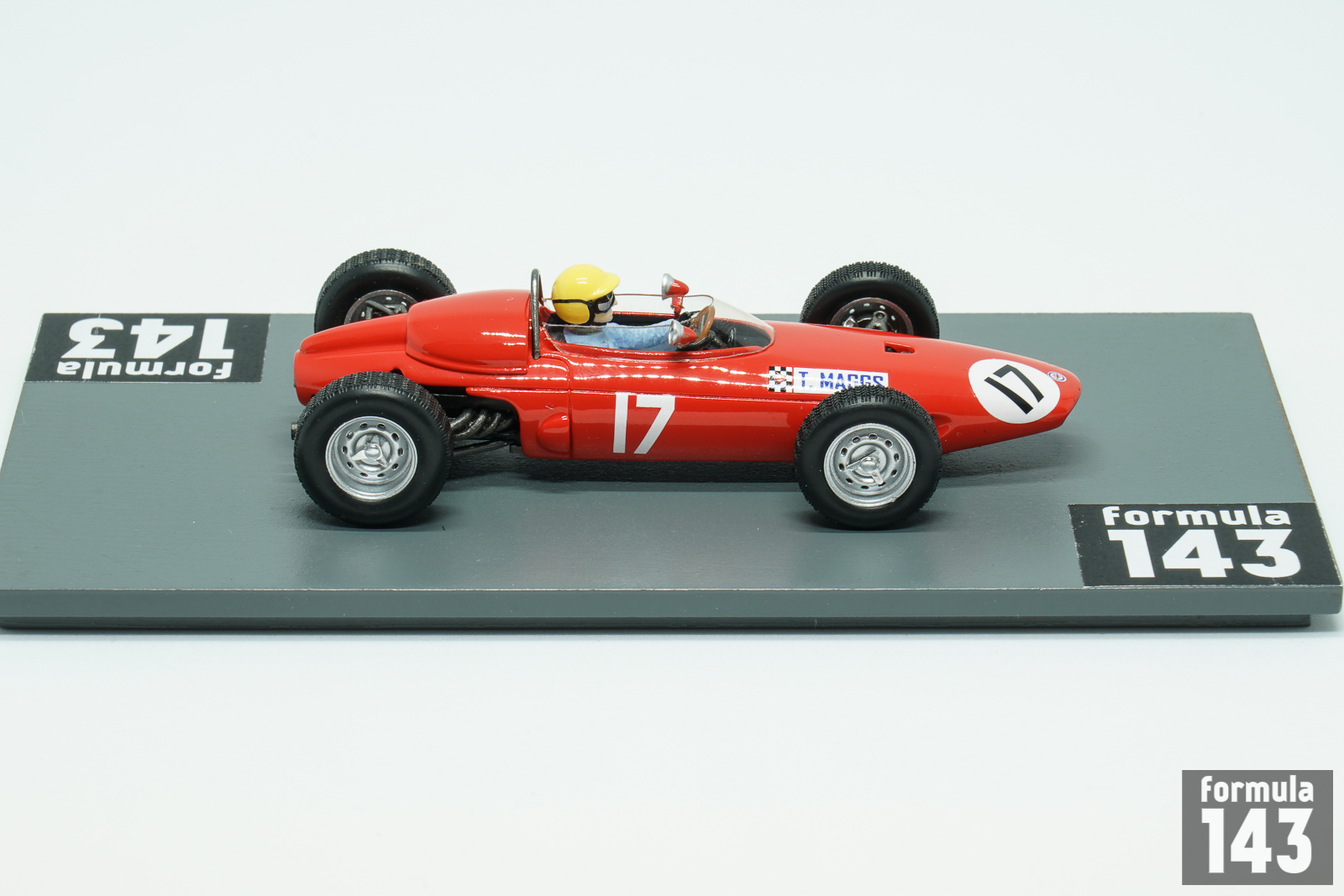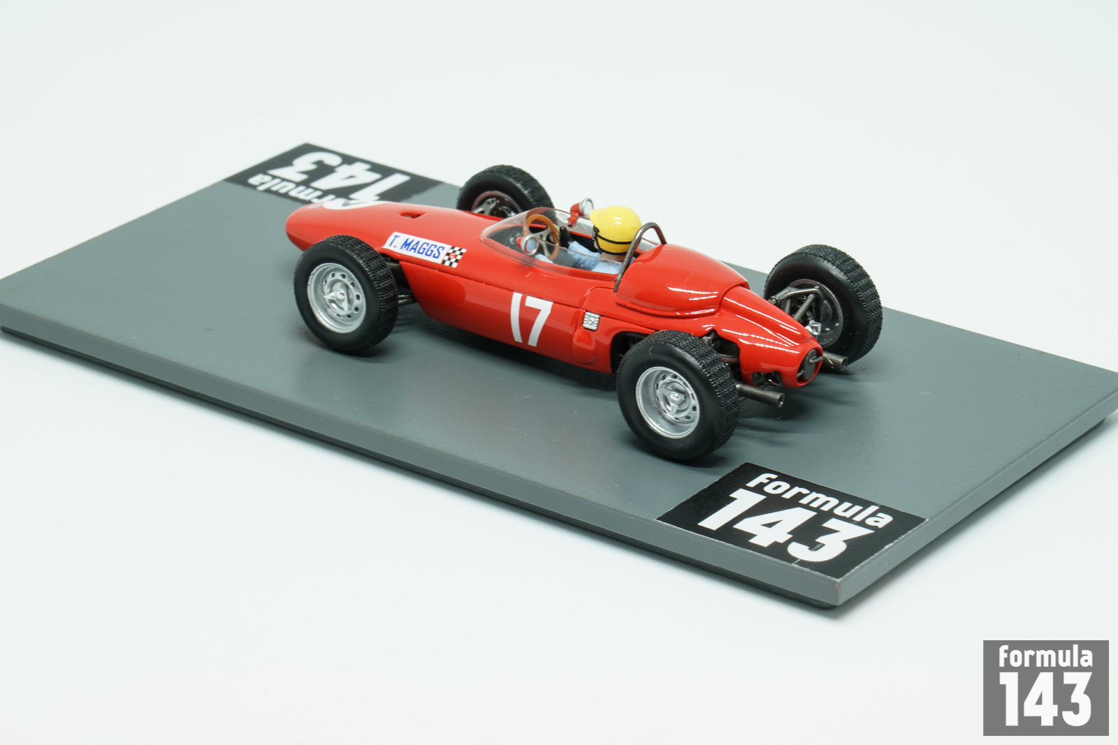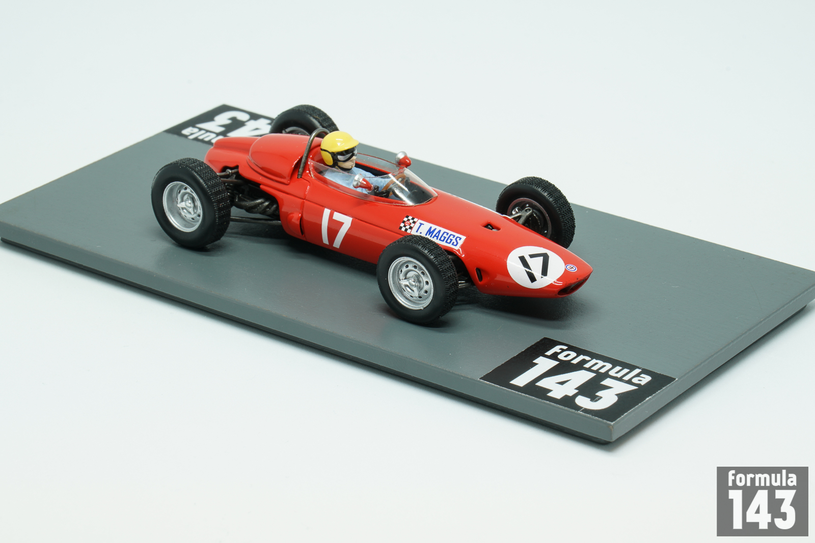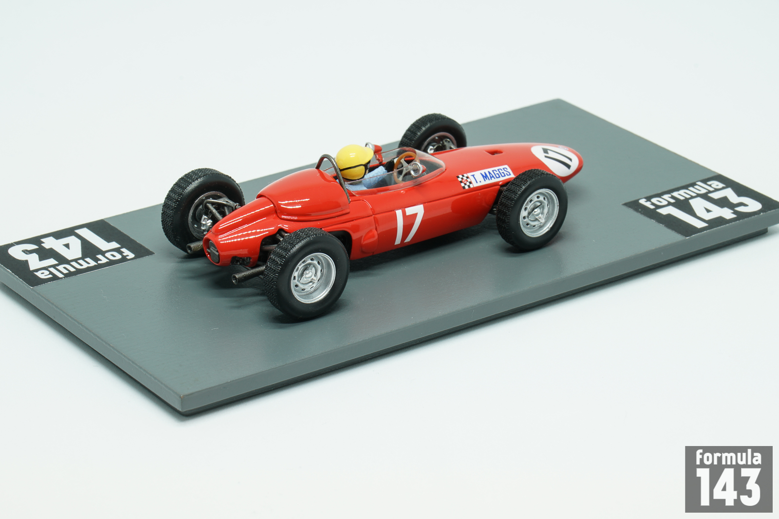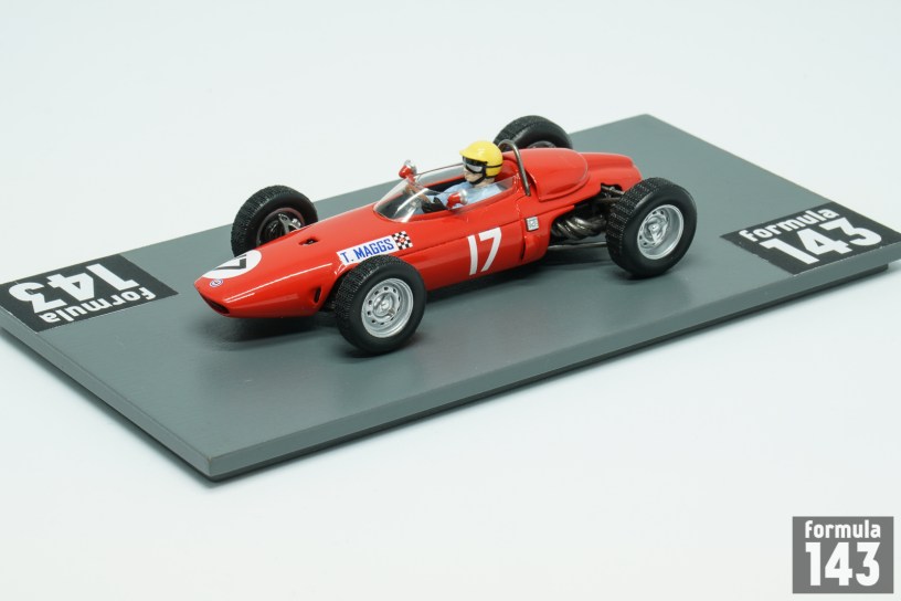 Like other manufacturers, BRM introduced new 1.5-Litre F1 car for 1961 to comply with new Formula 1 regulations. But their new 1.5 liter V8 engine was not ready in 1961, so the first season of the new formula BRM used Covenrty Climax FPF S4 engine available to any customer. Since 1962 P57 was equipped with BRM P56 V8 engine, and this combination was used in 1962-63 by works team and until 1965 by private entrants. One of BRM clients in 1963-65 was famous Scuderia Centro Sud, Italian private team from Modena owned and run by Guglielmo “Mimmo” Dei. In 1964 Dei entered P57 for Italian Giancarlo Baghetti and South African Tony Maggs. Maggs, who shared with Jo Siffert the European F2 Championship in 1961, in 1962-63 was Cooper Car Company F1 works driver. Then he moved to Scuderia Centro Sud for 1964 to take part in just 3 Grand Prix races. He retired at his first appearance behind the wheel of BRM P57 in British GP but then managed to get points in Germany and Austria. His P57 in Italian racing color is represented in this scale model by Spark.