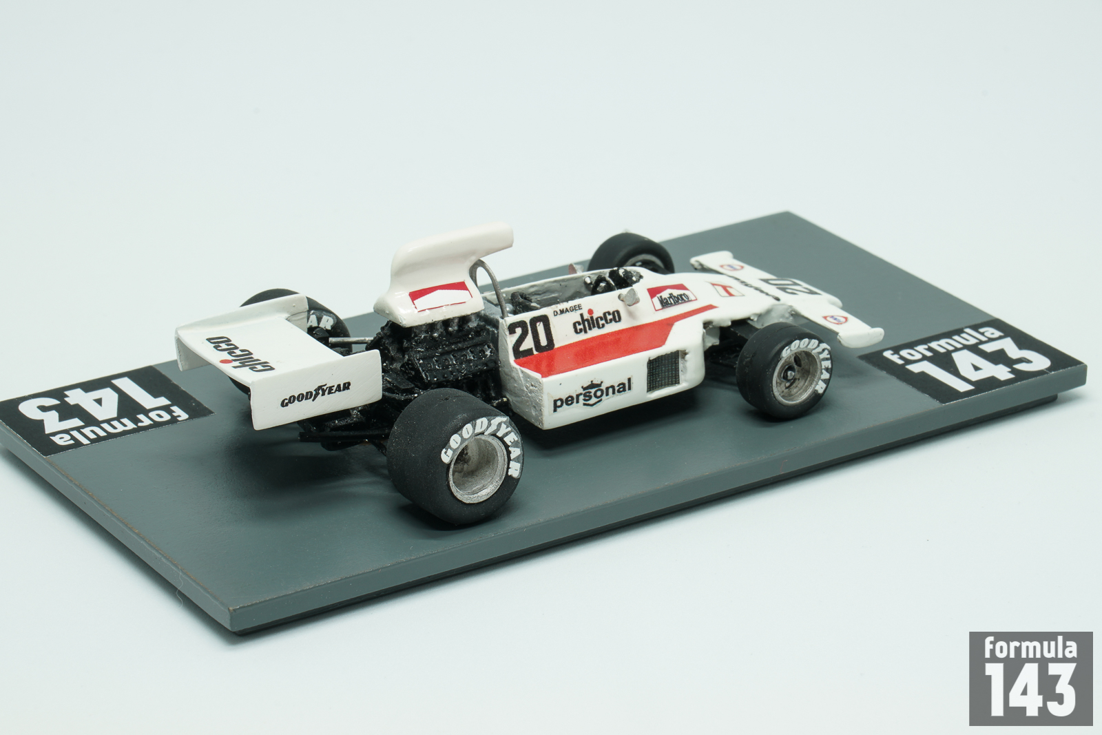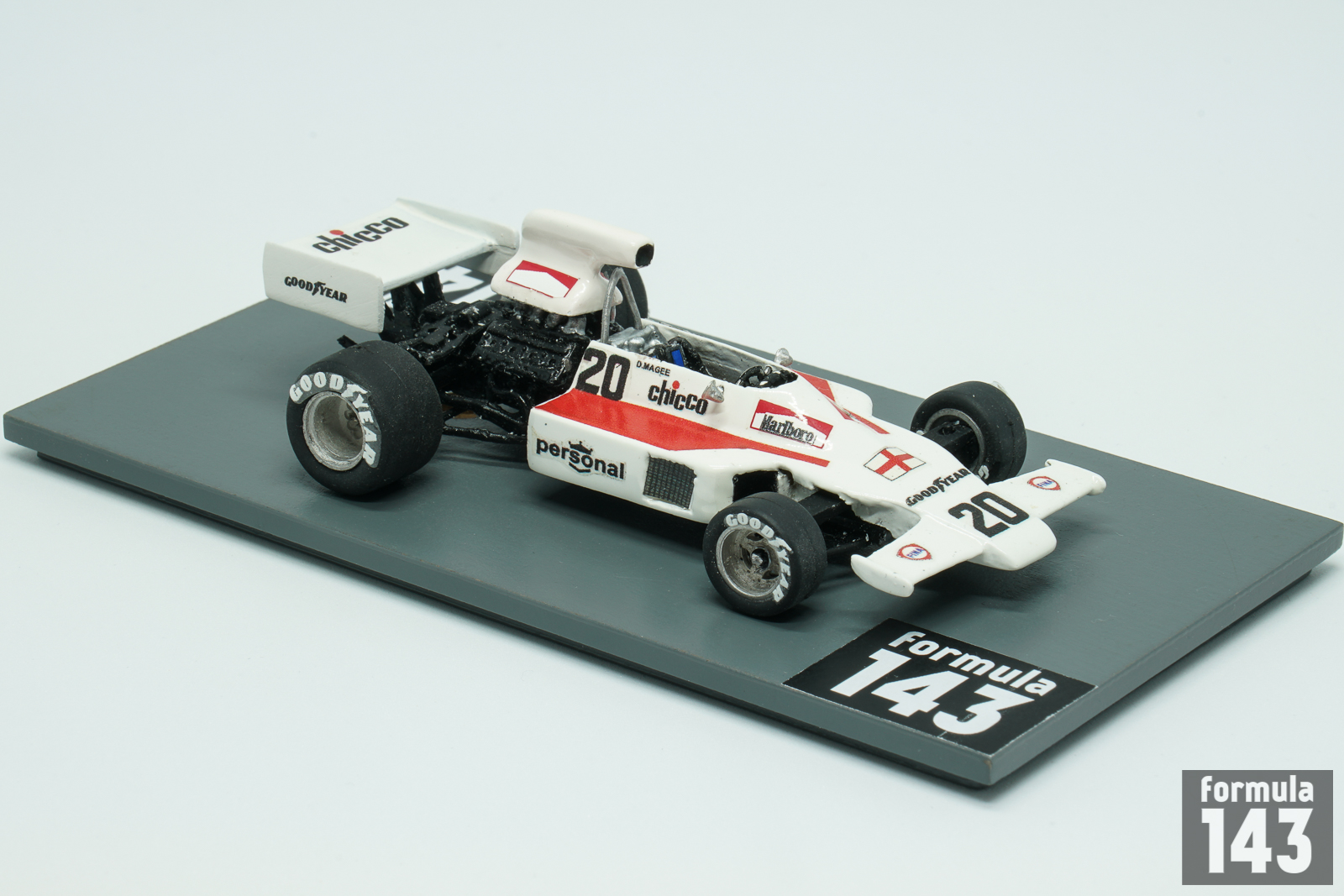 The story of this car goes back to Iso-Marlboro IR raced by Frank Williams Racing Cars in 1973. The car was designed by John Clarke, featured aluminum monococque with Ford Cosworth DFV engine as a fully stressed member. After backers Iso and Marlboro left before the 1974 season, the slightly revised car was renamed the Iso–Marlboro FW. Two chassis (“01” and “02”) were built in 1973, and new third “03” was completed in 1974. The three remaining FW chassis were renamed the Williams FW for 1975, and revised by Ray Stokoe. They were resdesignated the FW01, FW02 and FW03 despite being of the same type. The FW01 (the original IR chassis “01”) was used as a spar car only, the FW02 raced for the first three races of the season, and FW03 continued to be used in all remaining European rounds alongside with new FW04 model which was ready for the Spanish Grand Prix. Frank Williams usually entered two cars for each race. One seat was guaranteed to Jacques Laffite. Second driver Arturo Merzario left the team after Belgian Grand Prix, and the second FW03 was subsequently driven by drivers hired on one race deals. It was the usual practice for Frank Williams those days. That was the time when Frank Williams hired and fired more drivers than mechanics. Between 1973 and 1976, 27 drivers drove his cars in WDC races. Damien Magee from Northern Ireland was among the many one-time Williams drivers and took the seat of FW03 for the Swedish Grand Prix 1975 and finished 14th in this race 2 laps behind the winner. Magee competed in Formula 3, Formula 5000, Formula Ford 2000 and North American Formula Atlantic before. His final opportunity in F1 was one-time drive for RAM Racing in Holland next year. In 1976 the Ulsterman had finally managed to secure a regular drive, racing a Cosworth GA-powered March 751 in the Shellsport Group 8 series for Hexagon Racing. Magee won rounds two and three of the series (in Snetterton and Oulton Park) and survived a big accident at Snetterton. Magee finished the year as runner-up behind David Purley but retired from racing at the end of 1977 after another couple of British G8 starts.