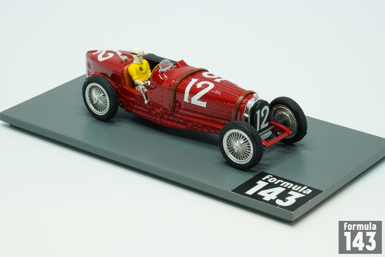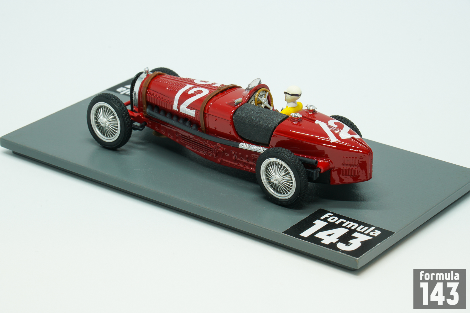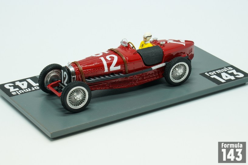 Bugatti T59 emerged in 1933 was the further evolution of T35 – T51 – T54 racing car series by Bugatti. It used an enlarged 3.3 L (3257 cc/198 in³) version of the straight-eight Type 57’s touring car engine sitting in a modified Type 54 chassis. The engine was lowered for a better center of gravity, and the frame was lightened with a number of holes drilled in the chassis. In 1934 Bugatti works team Usines Bugatti competed in all Grand Epreuves except German Grand Prix. The line-up for each race varied and consisted of 3-4 pilots selected from 5 works drivers: Rene Dreyfus, Robert Benoist, Jean-Pierre Wimille, Tazio Nuvolari, and Antonio Brivio. The major team success was the victory in Belgium by Rene Dreyfus. In Monaco Dreyfus was third, and Tazio Nuvolari finished in 5th position. The Spanish Grand Prix held in Lasarte, was the final Grand Epreuve or the season. Mercedes-Benz drivers Luigi Fagioli and Rudolf Caracciola took the double victory, while Nuvolari was third in one of the best Bugatti performances of the season. This scale model by Brumm is from Tazio Nuvolari Limited Edition series.