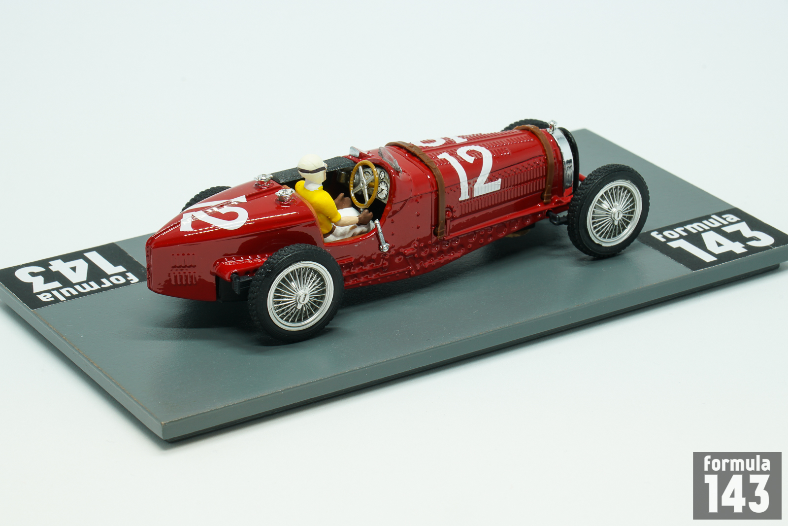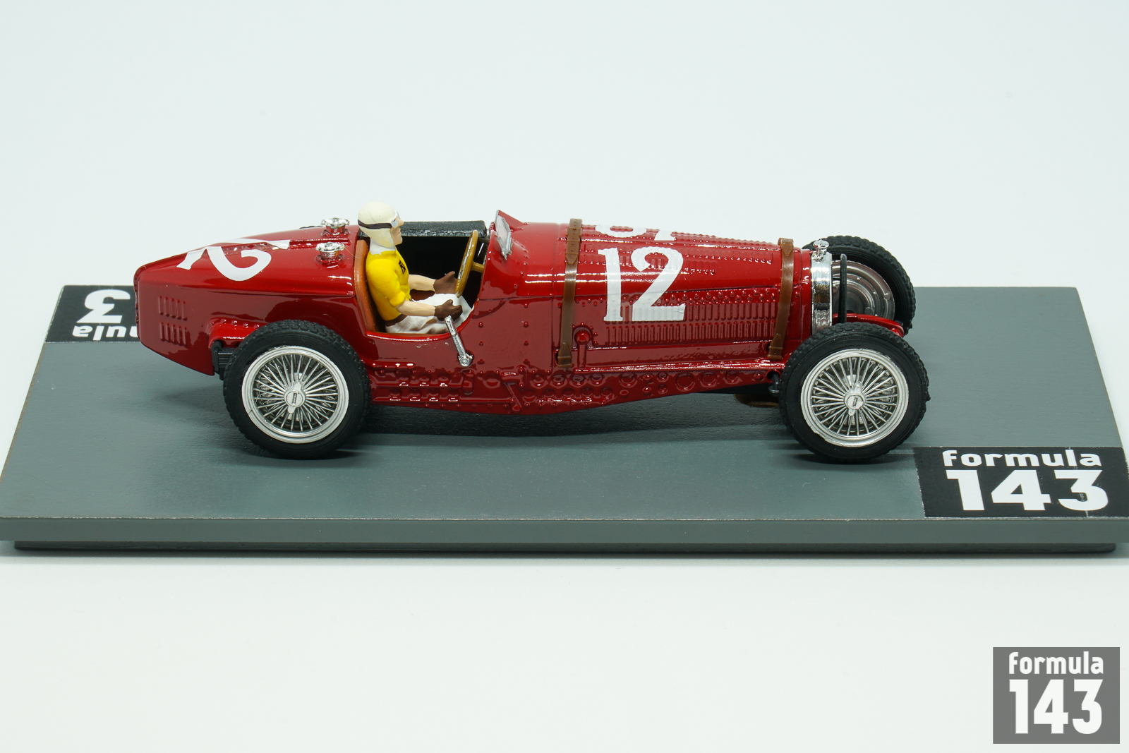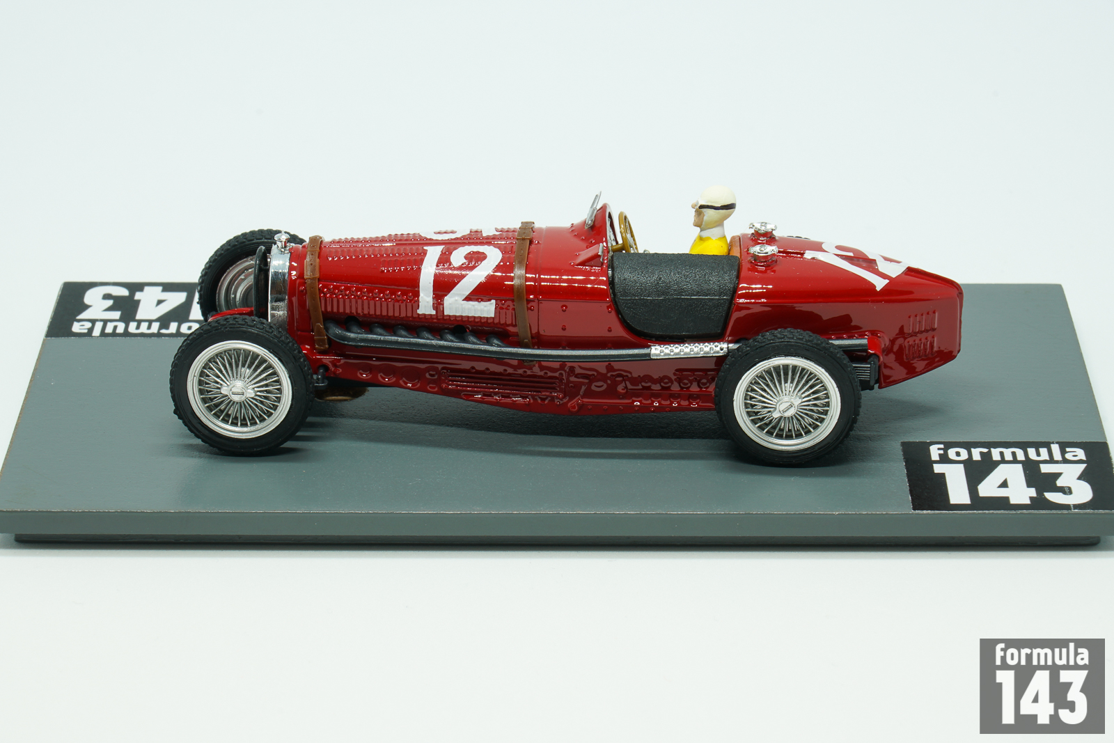 Bugatti T59 emerged in 1933 was the further evolution of T35 – T51 – T54 racing car series by Bugatti. It used an enlarged 3.3 L (3257 cc/198 in³) version of the straight-eight Type 57’s touring car engine sitting in a modified Type 54 chassis. The engine was lowered for a better center of gravity, and the frame was lightened with a number of holes drilled in the chassis. In 1934 Bugatti works team Usines Bugatti competed in all Grand Epreuves except German Grand Prix. The line-up for each race varied and consisted of 3-4 pilots selected from 5 works drivers: Rene Dreyfus, Robert Benoist, Jean-Pierre Wimille, Tazio Nuvolari, and Antonio Brivio. The major team success was the victory in Belgium by Rene Dreyfus. In Monaco Dreyfus was third, and Tazio Nuvolari finished in 5th position. The Spanish Grand Prix held in Lasarte, was the final Grand Epreuve or the season. Mercedes-Benz drivers Luigi Fagioli and Rudolf Caracciola took the double victory, while Nuvolari was third in one of the best Bugatti performances of the season. This scale model by Brumm is from Tazio Nuvolari Limited Edition series.
