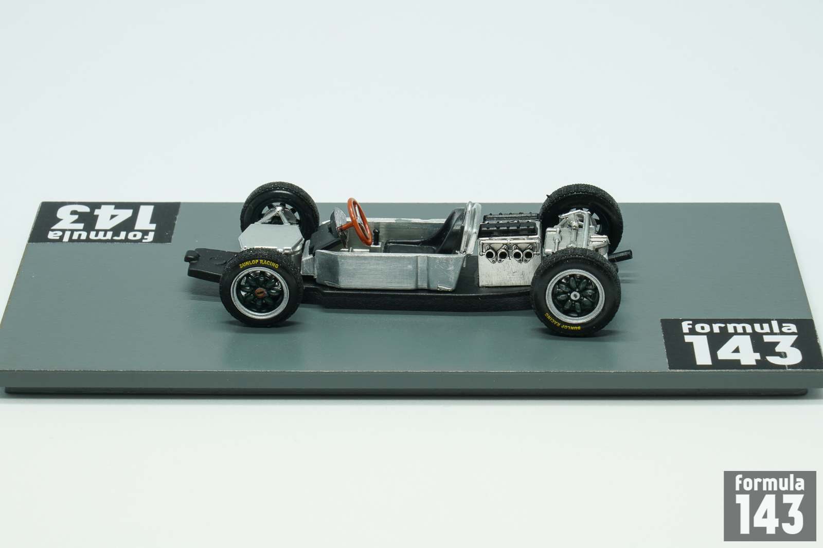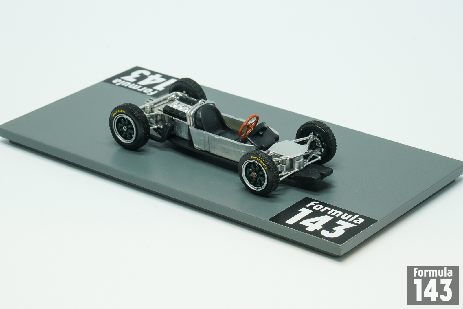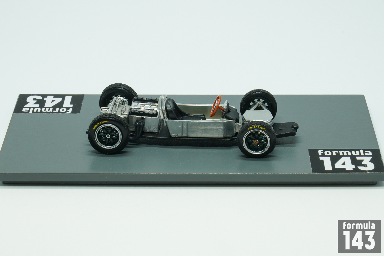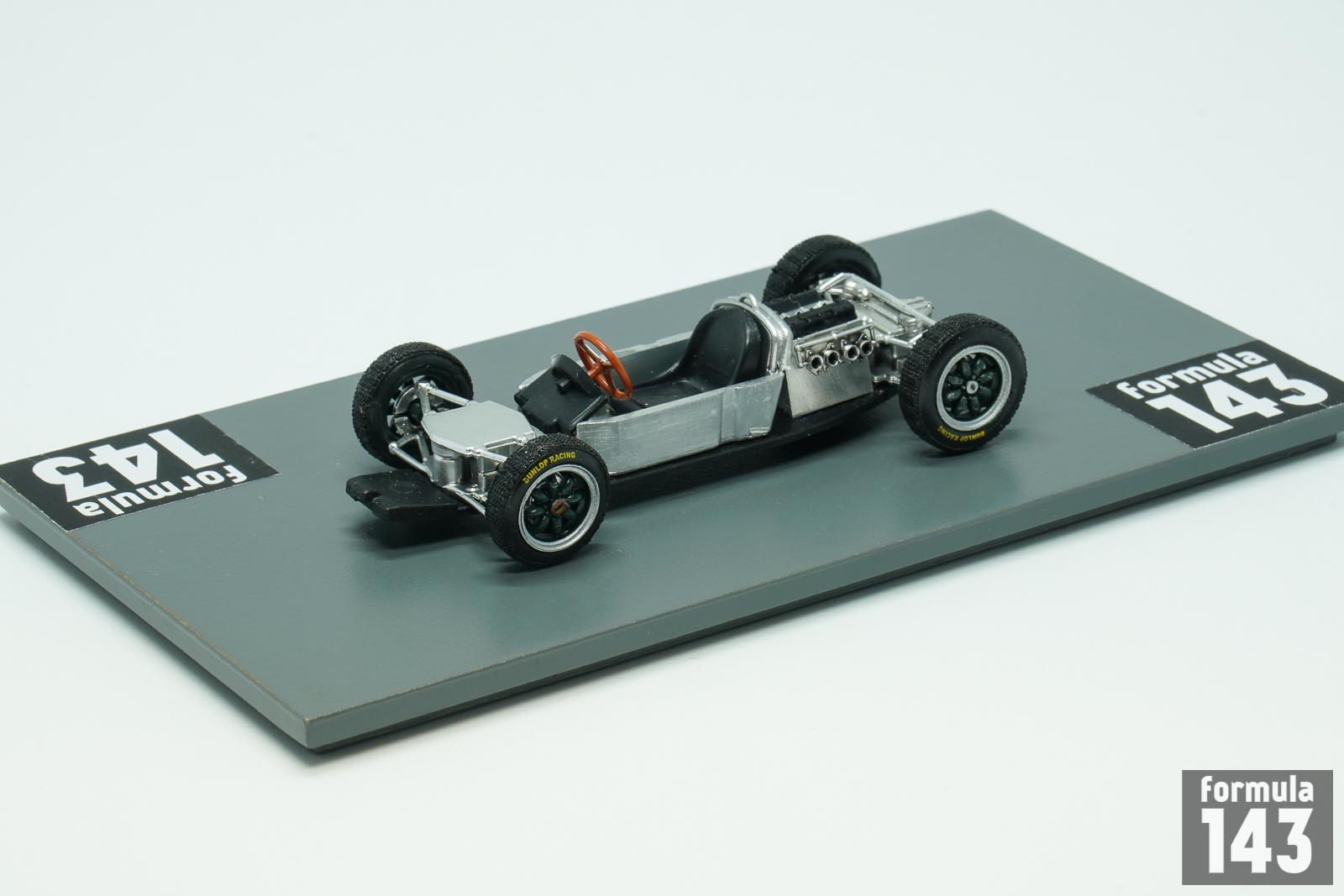 Cooper Car Company started the 1960 season with T51, its successful model of the previous year. But after extraordinary performance of new Lotus 18 at races in Argentina in the beginning of the season, team principal John Cooper and designer Owen Maddock have no option rather than to try redevelop T51 into new chassis copying best Lotus technical solutions in in addition to winning Cooper combination of simplicity and reliability. New T53 was born very quickly and was available for Monaco Grand Prix in May. It was more lighter, lower and aerodynamically effective than T51. Jack Brabham, despite disqualification in Monaco for outside assistance, won four next Championship races and took his second consecutive Drivers’ Championship title. This scale model of Jack’s T53 from victorious British GP at is from Brumm Anteprima series and represents the car in full and as a frame not covered with the panels.