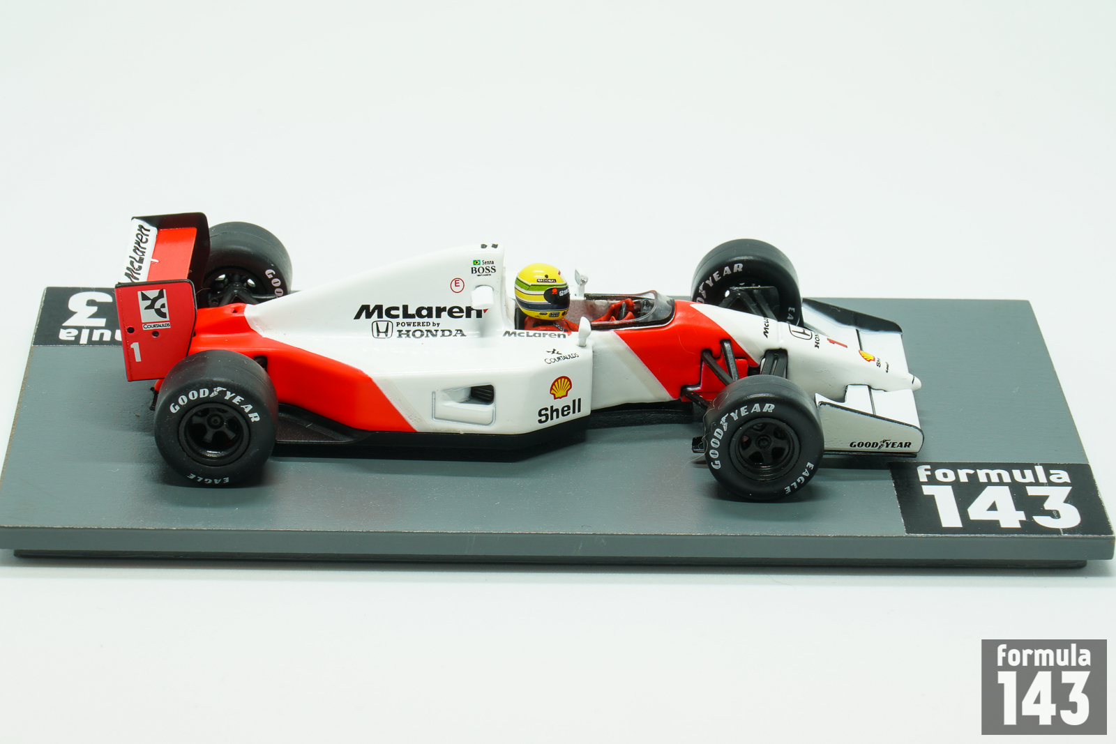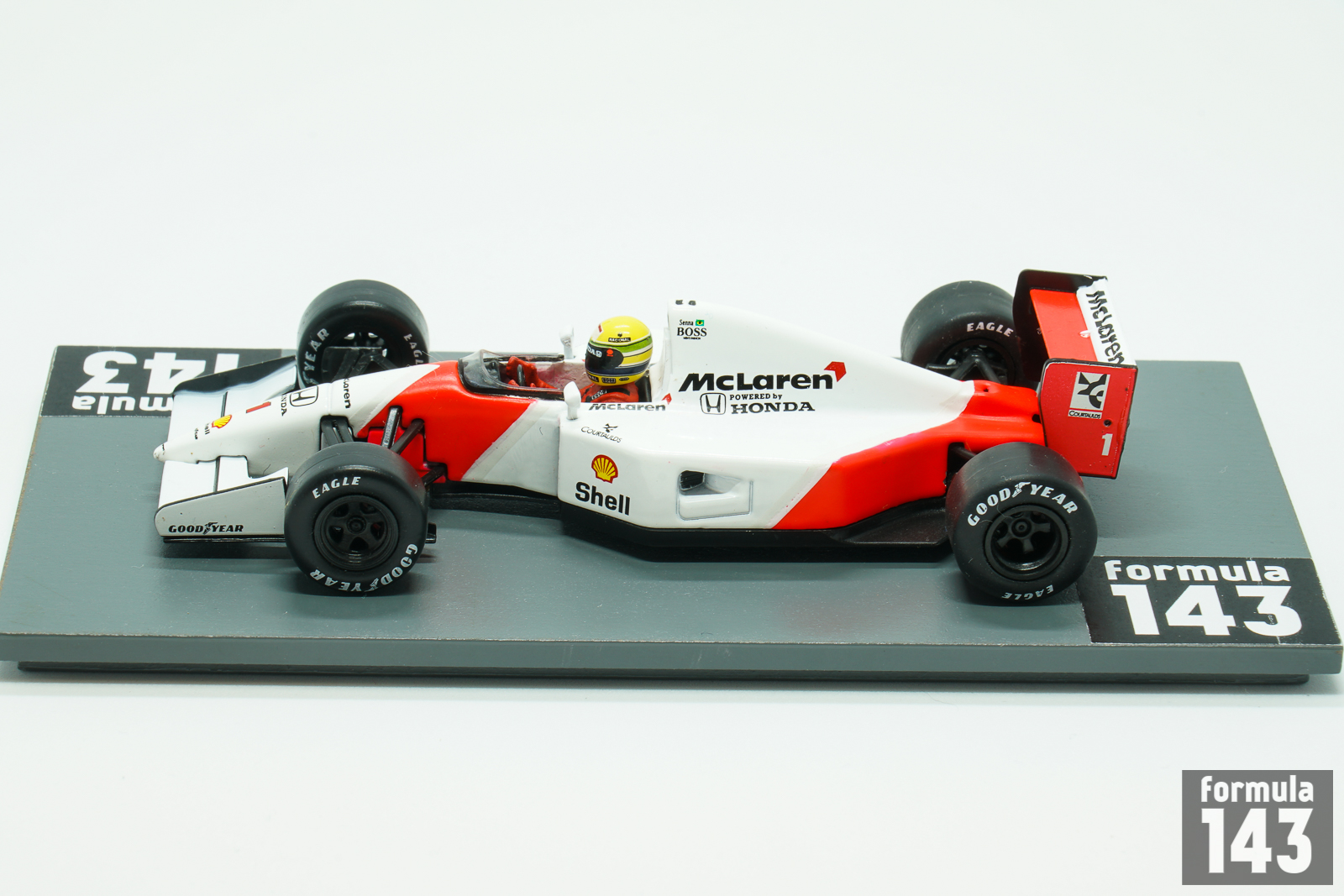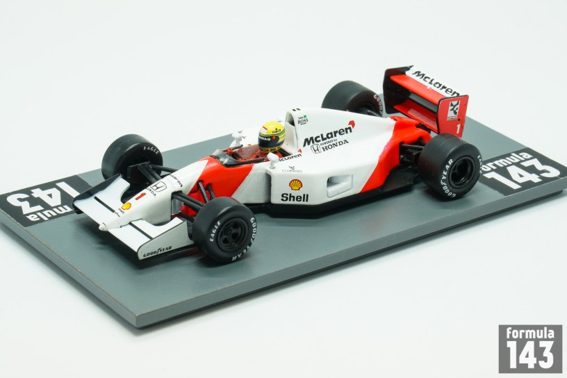 The MP4/7 from 1992 was the last McLaren powered by Honda engine after very successful partnership lasted 5 seasons and resulted in 44 wins and 4 Driver’s Championship and Constructors Championship titles in a row. Honda will return to McLaren many years later, in 2015, but the alliance will not be able to compare with past achievements. The MP4/7 was mainly based on the 1991 winning design featuring carbon fibre monocoque chassis and Honda RA122E V12 engine. The very new feature was the introduction of semi-automatic transmission, developed with the help of the team’s technology partner Techniques d’Avant Garde (TAG). However the Williams-Renault combination proved to be more reliable and faster in 1992 season, leaving McLaren to fight with Ferrari and Benetton for the “best of the rest” title. Ayrton Senna won 3 races that season (at Monaco, Hungary and Italy) and was 4th in the Championship, while Gerhard Berger, who moved to Ferrari after the end of the season, won Canadian and Australian Grand Prix and was placed 5th in the final standing just 1 point behind Senna. This scale model from the “Brazilian Legends” Collection represents Senna’s car from the German Grand Prix where Ayrton finished 2nd behind Nigel Mansell’s Williams.