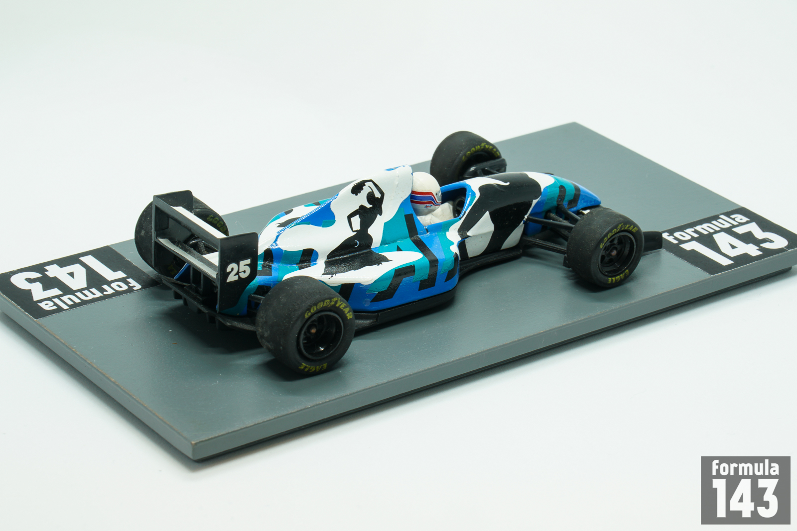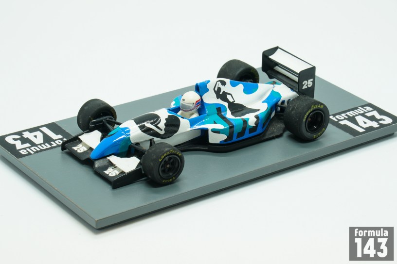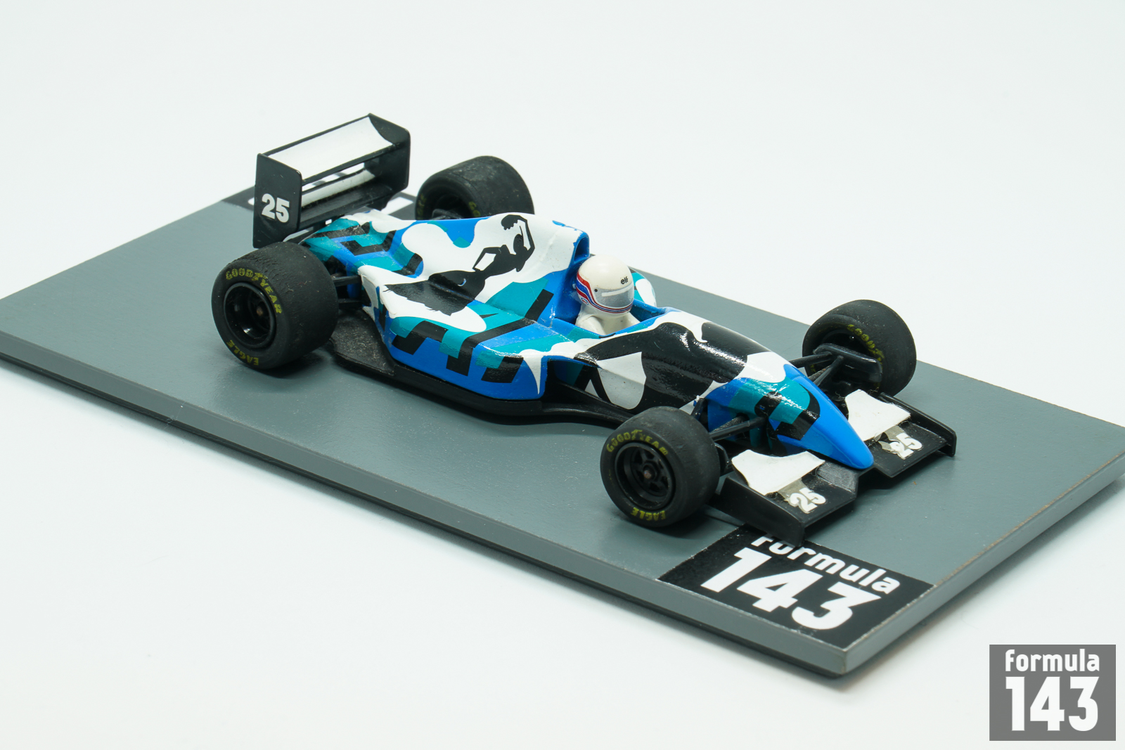 The JS39, designed by Gerard Ducarouge, Paul Crooks and Loic Bigois and driven by Martin Brundle and Mark Blundell, performed quite well. The car fitted with the Renault RS53.5 V10 engine was regular top-6 finisher. Three 3rd place finishes achieved by Brundle in San Marino and by Blundell in South Africa and Germany, together with other good results allowed Ligier to occupy 5th place in the World Constructors’ Championship. Brundle and Blundell were placed 7th and 10th in the Drivers’ standings. The long-term major sponsor of the team, Gitanes cigarettes, continued to support the French team for 20 years providing its well recognizable blue and white livery. For the last two races in 1993, the logo on the sidepod disappeared – at least for one car. That doesn’t mean Gitanes were gone from the livery, though. In fact, they were more present than ever. Italian comics author Hugo Pratt was tasked by the French tobacco manufacturer SEITA – parent company of Gitanes – to create a special livery for Martin Brundle’s #25 car. As with the regular season livery, the car was predominantly blue. All other sponsor logos expect Gitanes were gone. The name of the main sponsor was written in huge letters along the entire chassis. It was partly overlaid by an oversized version of Gitanes’ logo’s white billows of smoke, both on the engine cover and on the rear part of the nose cone. This way, the wording was almost unrecognizable and so was the smoke – making the mix of blue and white appear more like a cow pattern. On top of the smoke sat Gitanes’ trademark silhouette of a woman playing the tambourine.