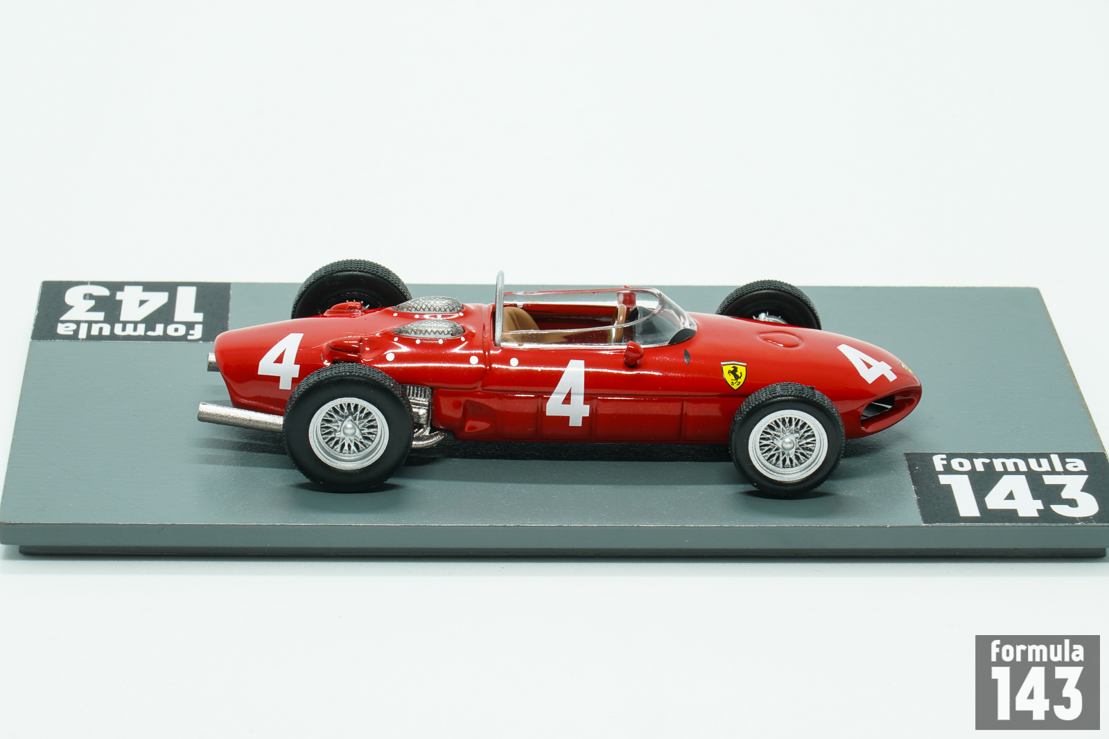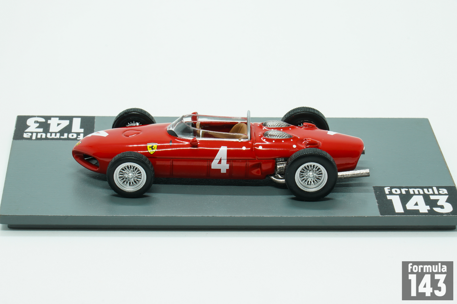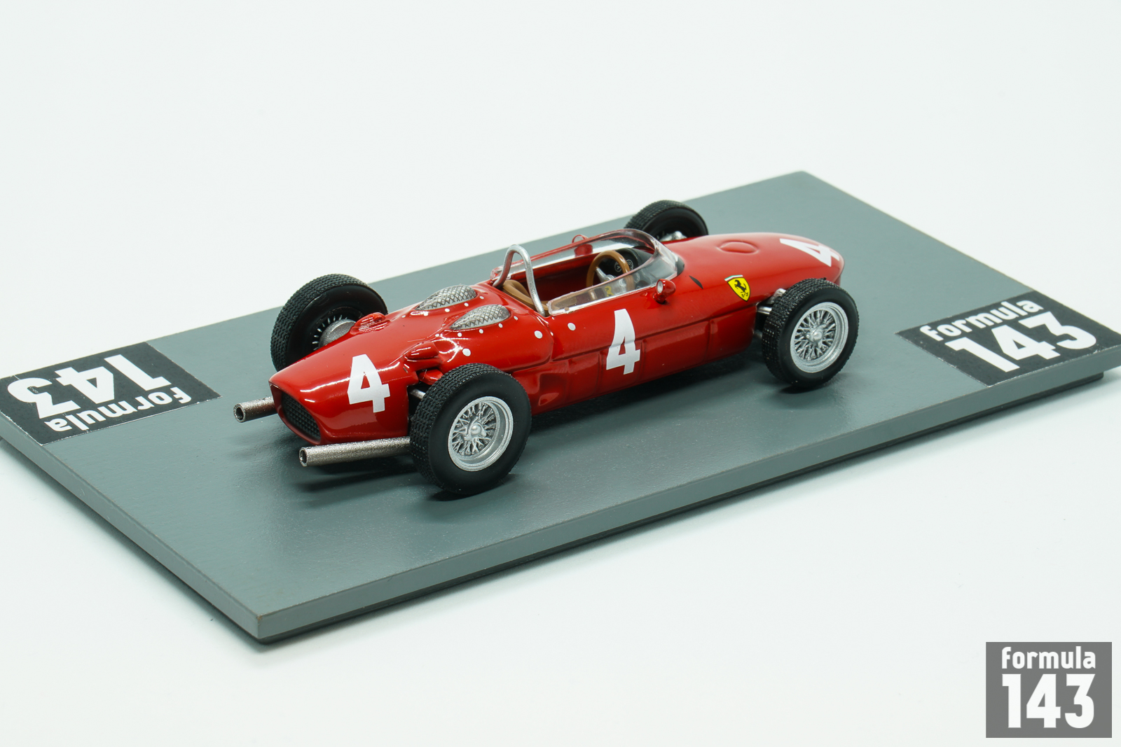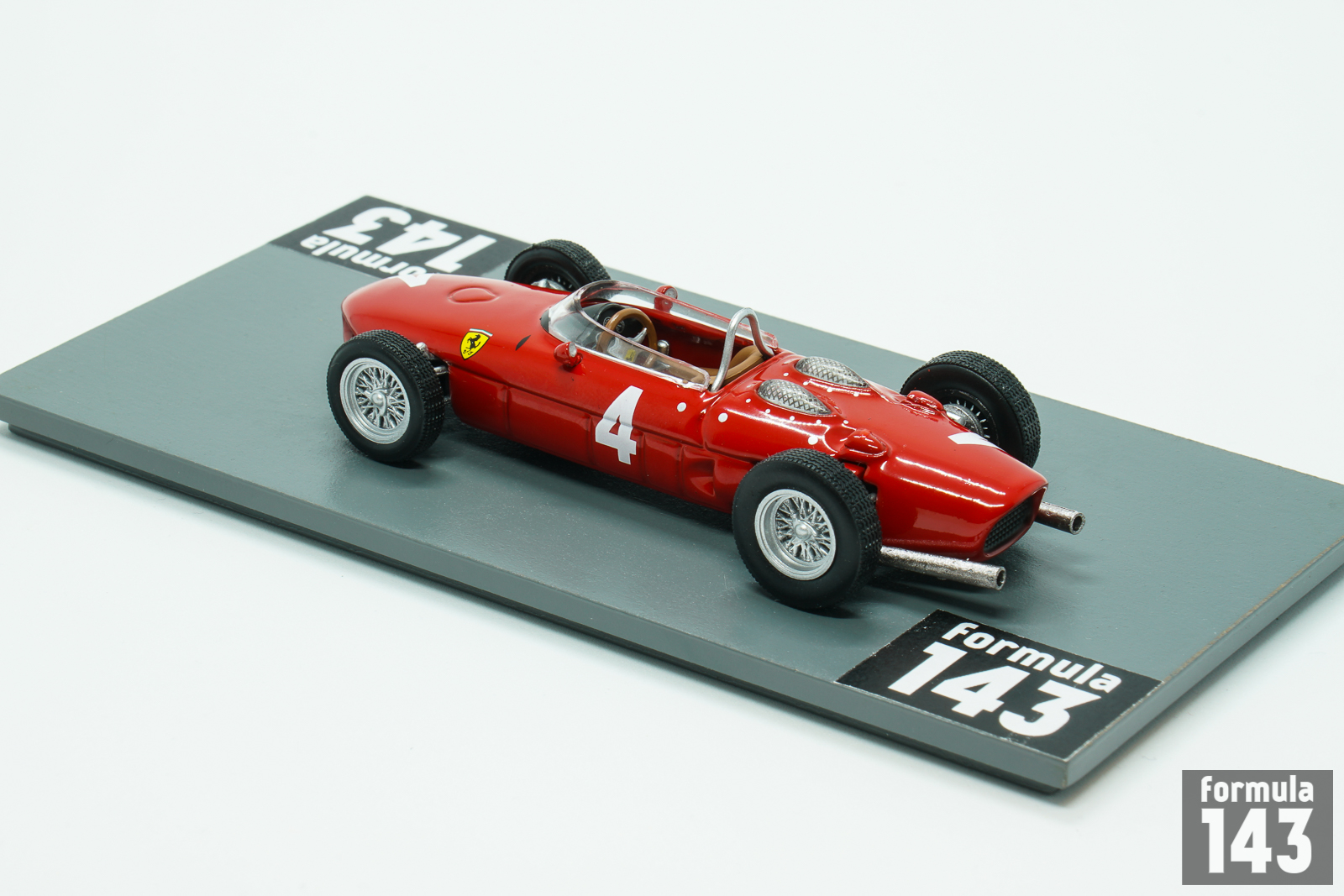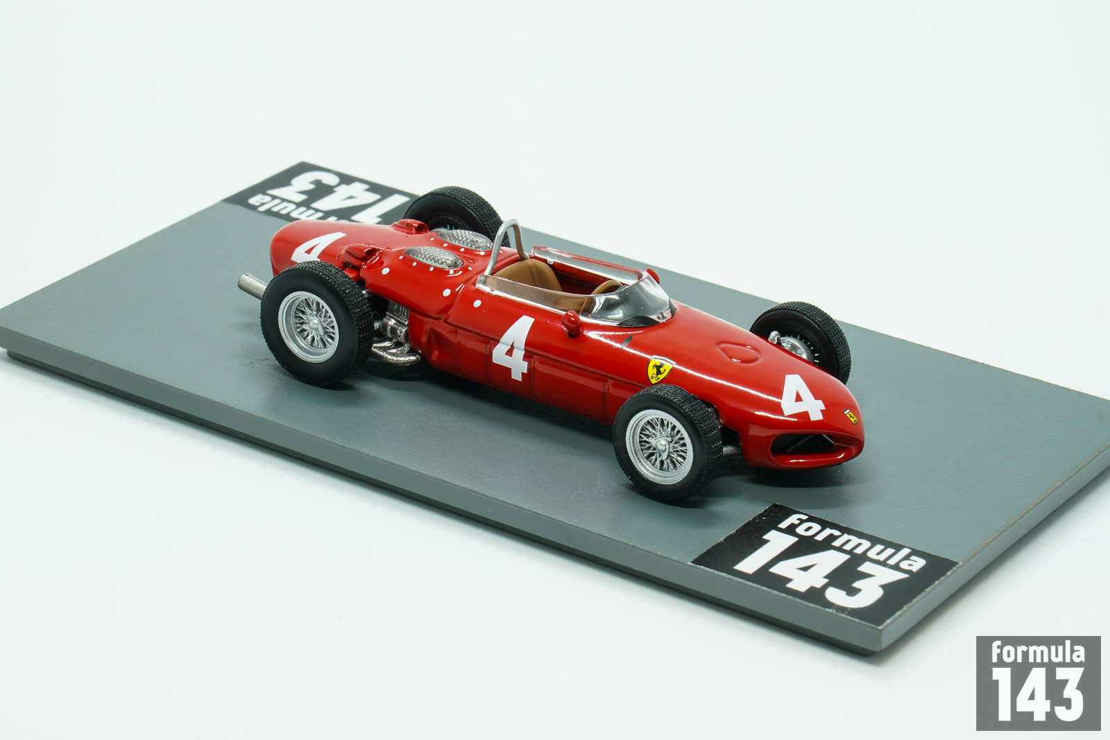 In 1961 new Formula 1 regulations reduced engine displacement from 2.5 to 1.5 litres were introduced. Ferrrai built the new F1 vehicle based on 1.5-L F2 machin, 156 F2. The Carlo Chitti designed featured a tubular spaceframe chassis and was powered by 1476 cc naturally aspirated V6 engine positioned in the middle of the car behind the driver’s seat. The most distinctive feature of the car was its characteristic air intake “nostrils”, thanks to which the car was nicknamed “sharknose”. American Phil Hill and German Wolfgang Berghe von Trips were 1961 Ferrari works drivers. Hill won the Belgian and Italian Grand Prix and took the Driver’s World Championship. Von Trips won in Holland and UK and was second in the Championship. On September 10, 1961, after a collision with Jim Clark’s Lotus on the second lap of the Italian Grand Prix, the 156 of von Trips became airborne and crashed into a side barrier, fatally throwing him from the car and killing fifteen spectators. The 156 was in use 3 more seasons – in 1962-64, being modified in the “Aero” version without sharknose intakes in 1963.
