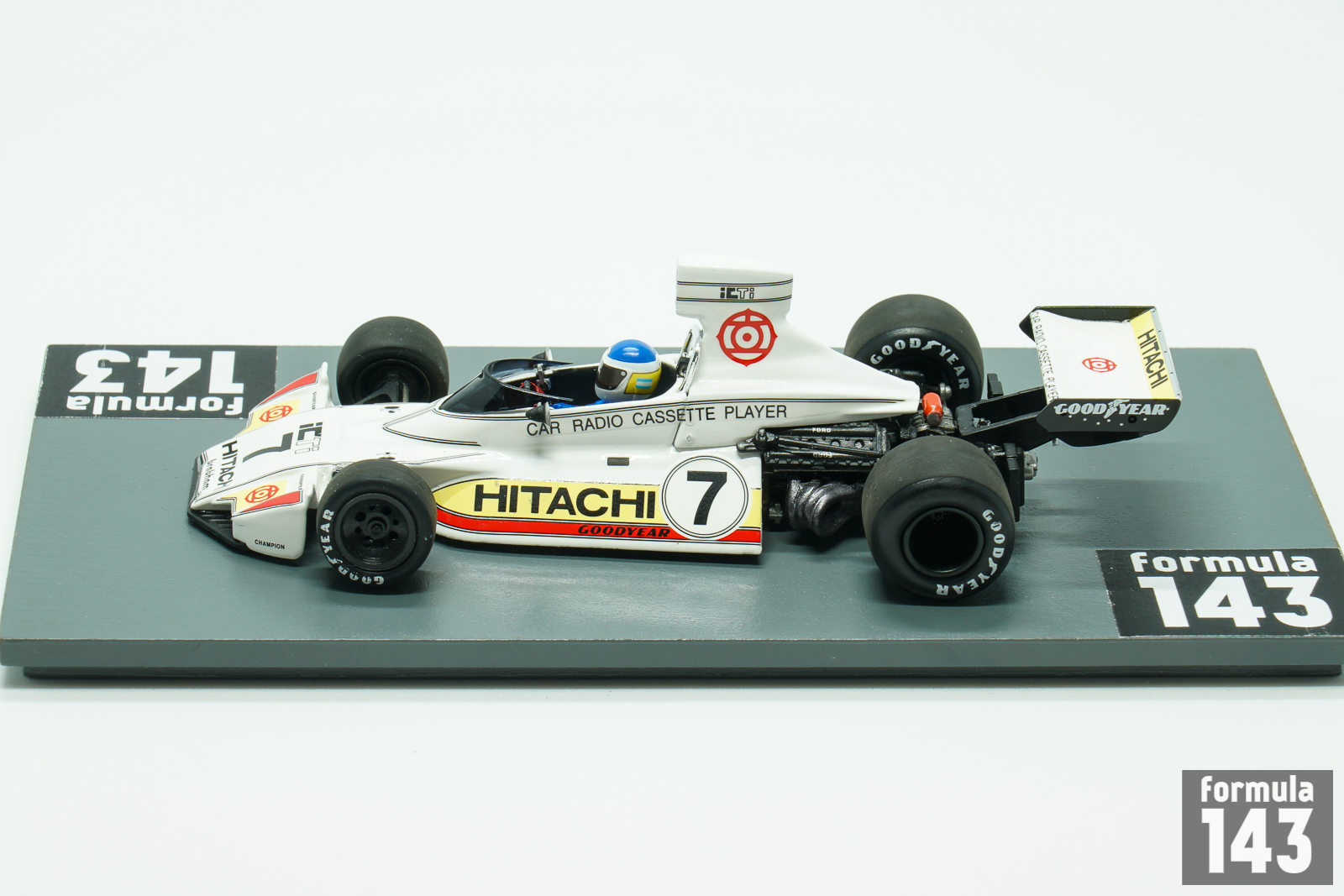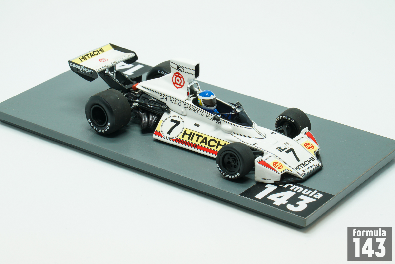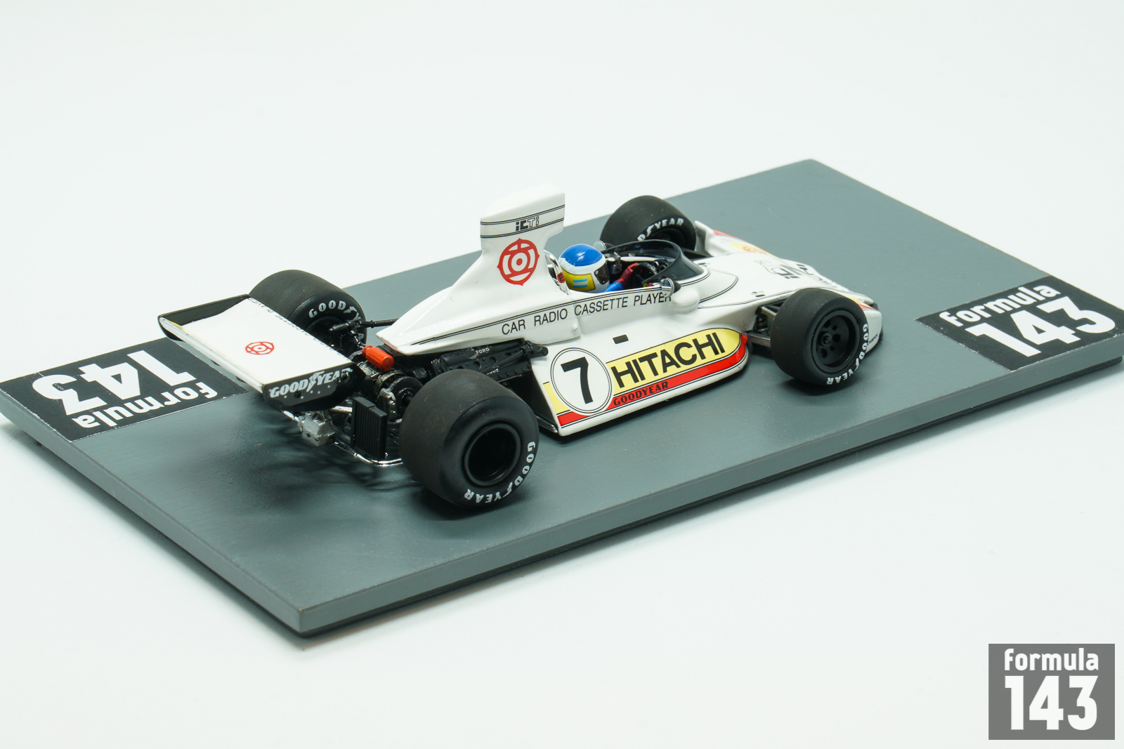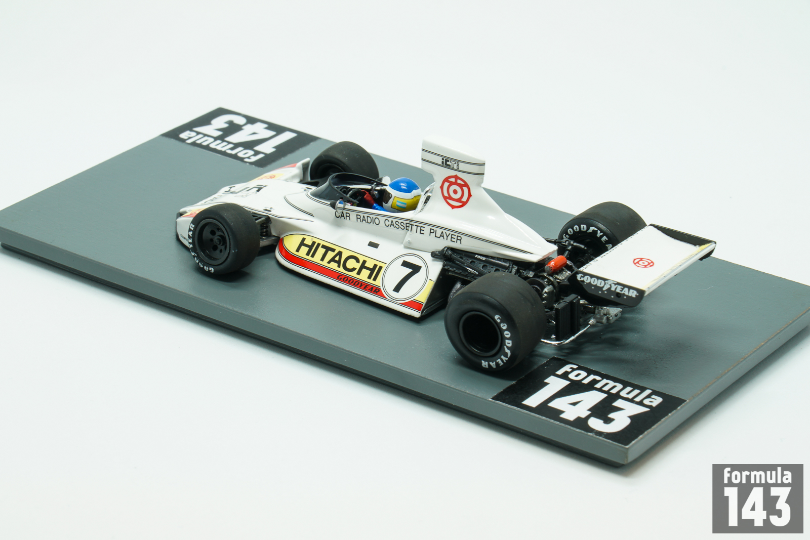 Brabham BT44 was designed by Gordon Murray for 1974 season and was used by the works team in 1974-75. The car followed conventional line of mid-70s design with an aluminium monococque body and standard Ford DFV/Hewland gearbox combination. The strong feature of the BT44 was its aerodynamics due to clean body lines and use of side skirts and airdams, a precursor to ground effects aerodynamics. The team driver #1 Argentinian Carlos Reutemann took three wins in 1974, but many retirements in other races dropped him to only 6th place in the Championship. In the position of the second driver of the team Richard Robarts and Ricky von Opel started several races each until finally Carlos Pace came to the team at the British Grand Prix.