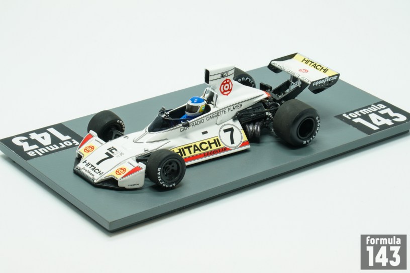 Brabham BT44 was designed by Gordon Murray for 1974 season and was used by the works team in 1974-75. The car followed conventional line of mid-70s design with an aluminium monococque body and standard Ford DFV/Hewland gearbox combination. The strong feature of the BT44 was its aerodynamics due to clean body lines and use of side skirts and airdams, a precursor to ground effects aerodynamics. The team driver #1 Argentinian Carlos Reutemann took three wins in 1974, but many retirements in other races dropped him to only 6th place in the Championship. In the position of the second driver of the team Richard Robarts and Ricky von Opel started several races each until finally Carlos Pace came to the team at the British Grand Prix.