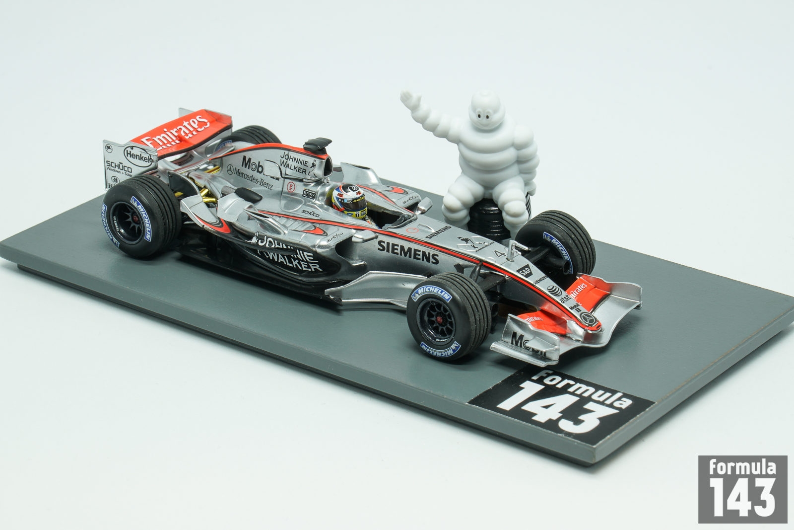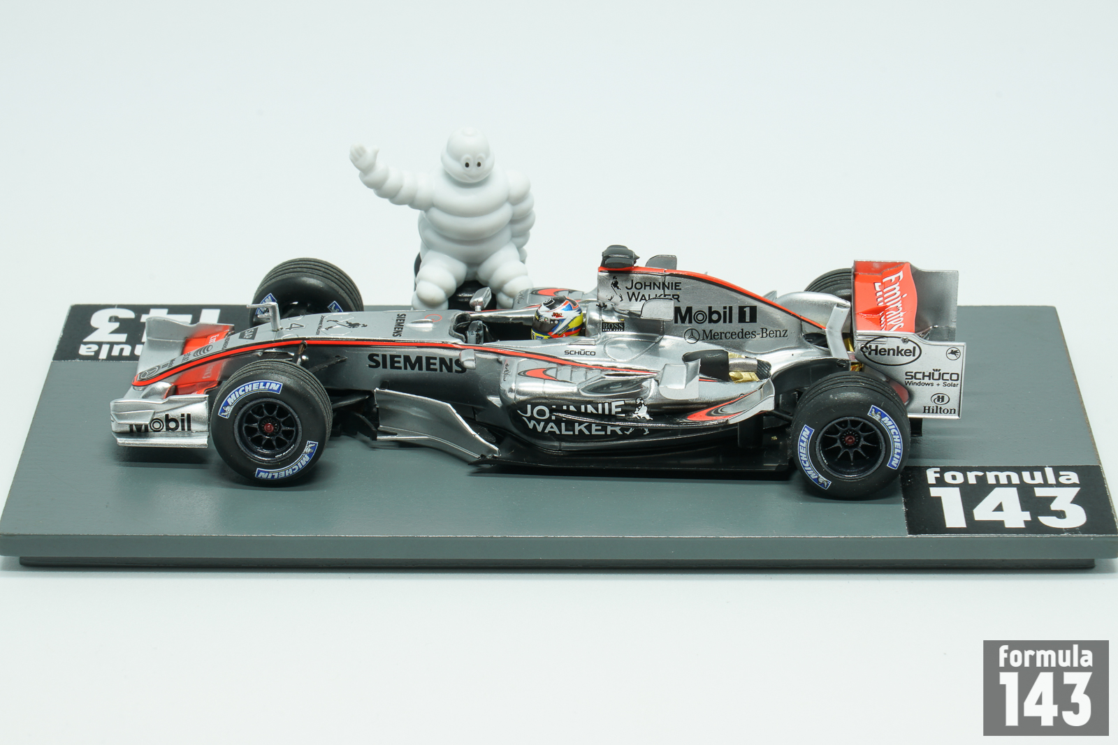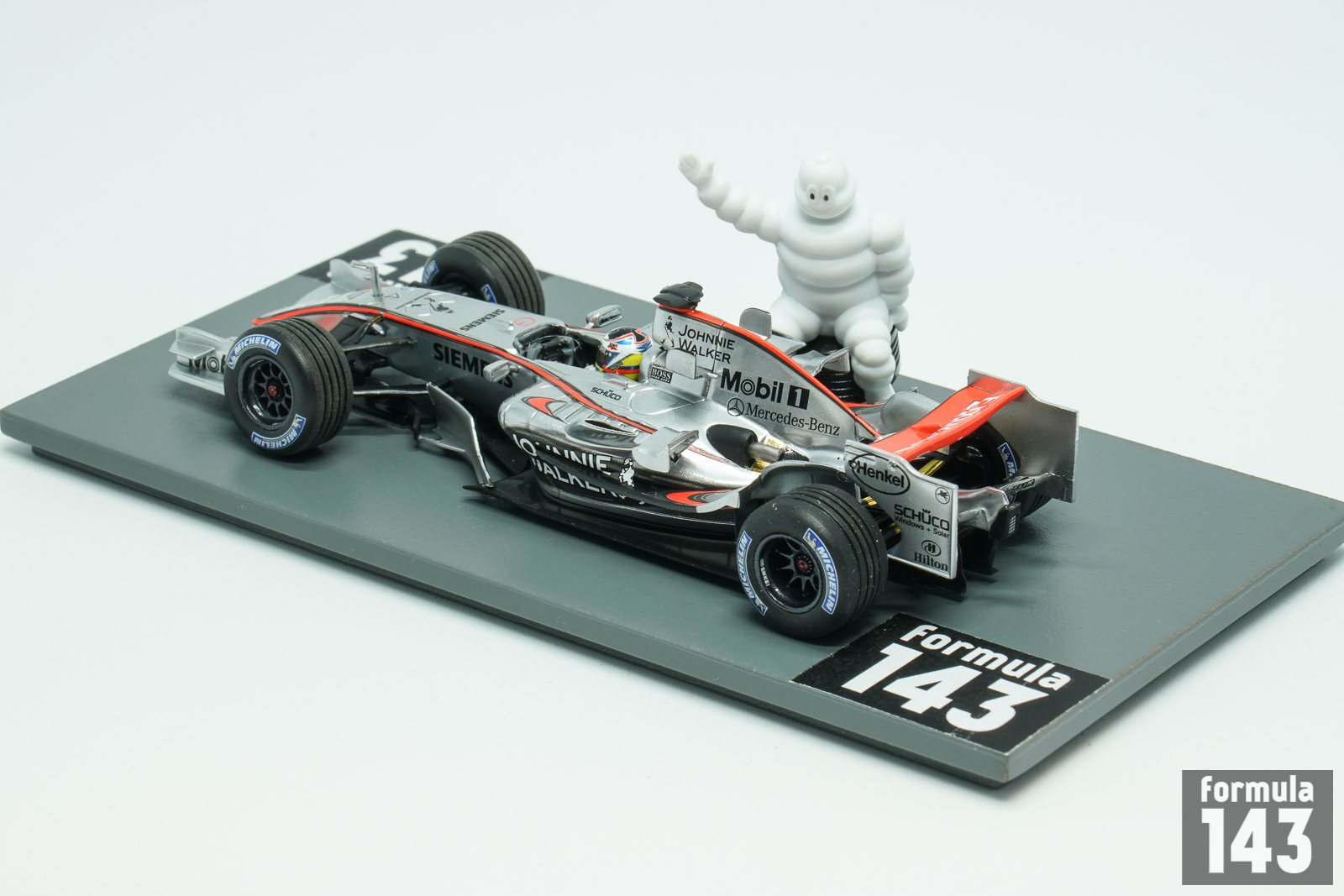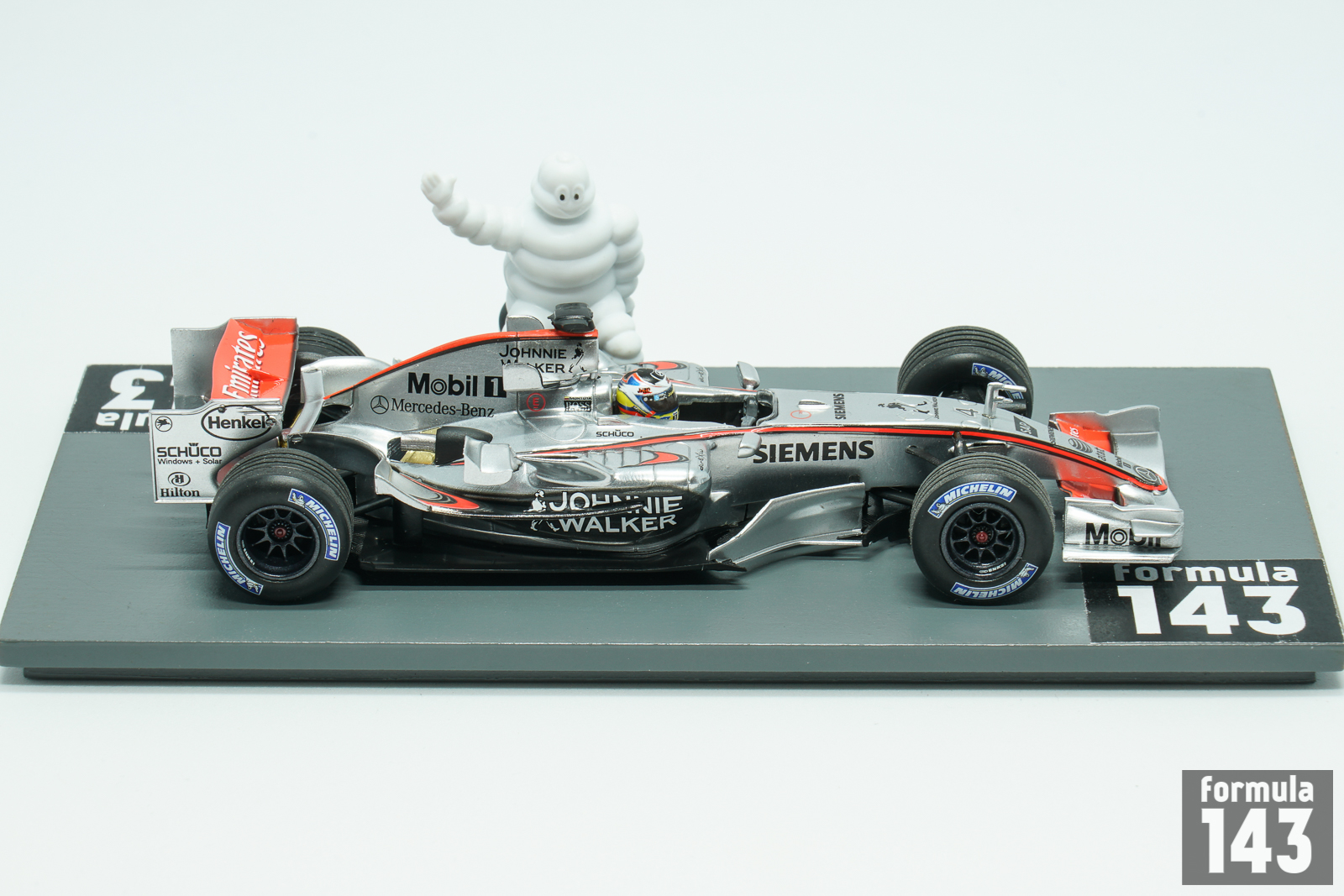 The MP4-21 was the first McLaren car powered by purely Mercedes-Benz engines after 11 years partnership with Ilmor as an engine builder. The chassis was designed by the team leaded by Adrian Newey as technical director. The car were driven by Kimi Raikkonen and Juan Pablo Montoya. MP4-21 was not so competitive as its predecessor, MP4-20 from the 2005. It never won the Grand Prix – the Finn scored 6 podium finishes , and the Columbian finished 3rd at Imola and 2nd in Monaco before retiring from the team and from F1 after the US Grand Prix. Montoya signed the contract with Chip Ganassi Racing to drive in NASCAR from 2007 and Ron Dennis offered Montoya an early exit from his contract with McLaren, provided that he resigned from receiving any payout to terminate his contract. Montoya finished the season in 8th position in the Drivers’ Championship. The scale model by Minichamps is from Michelin special limited edition, so the figure of Bibandum (Tyre Man), an official mascot of the Michelin tyre company, is included in the set.
