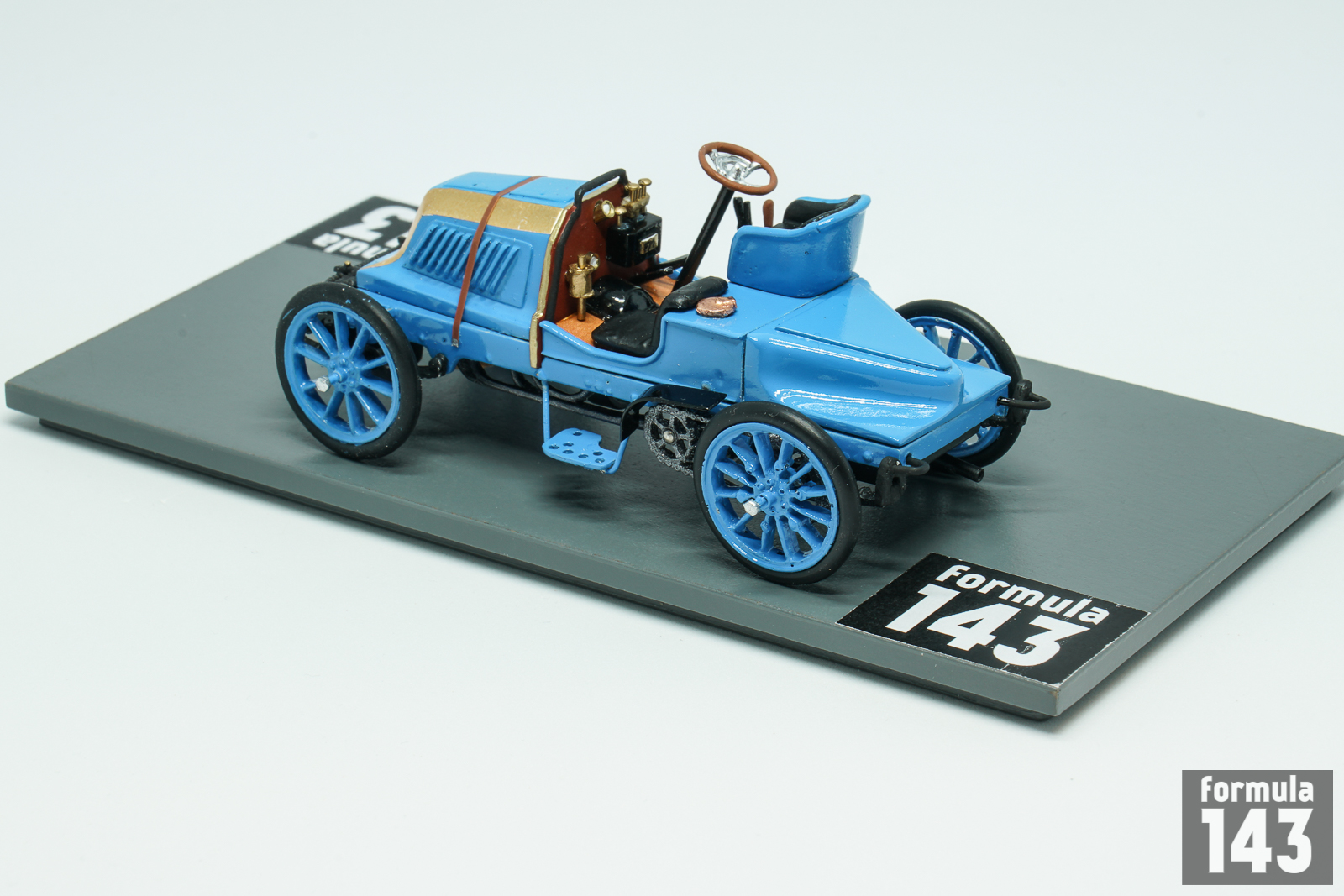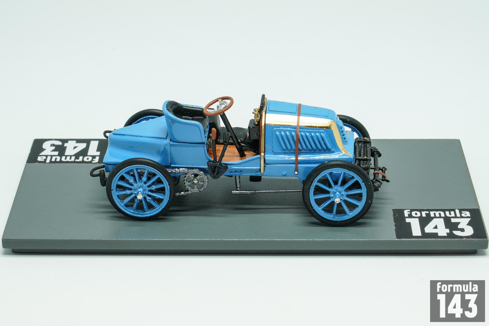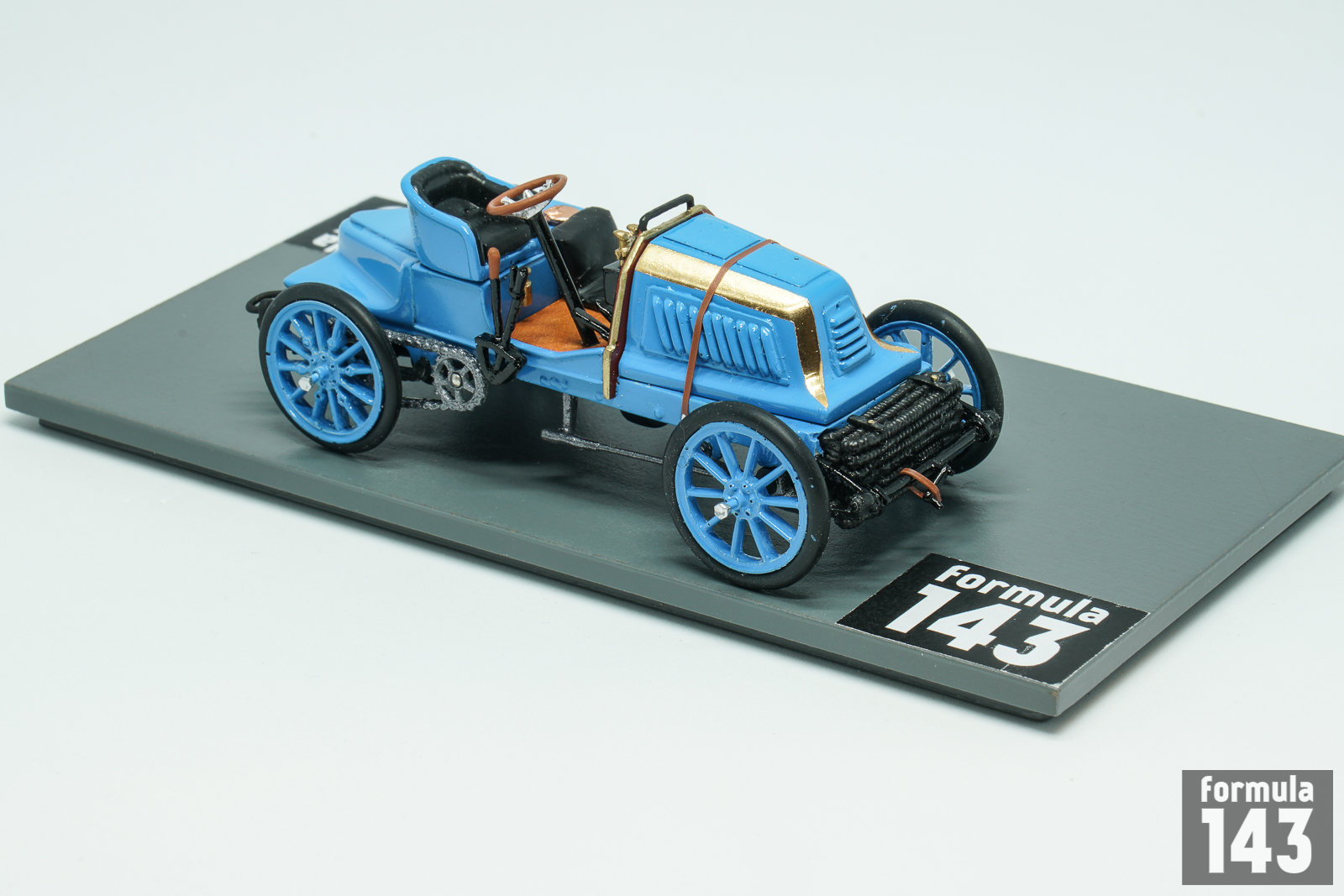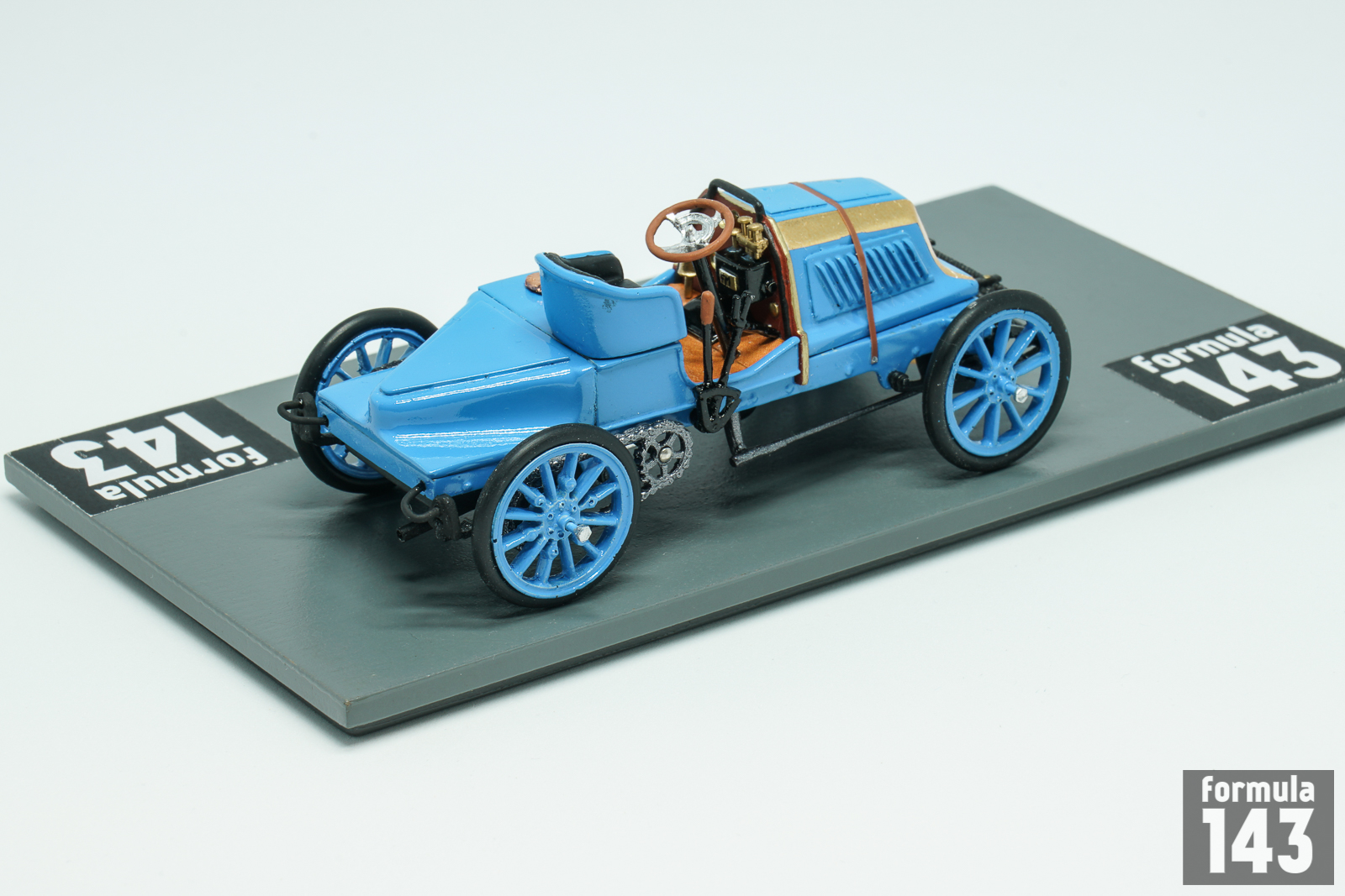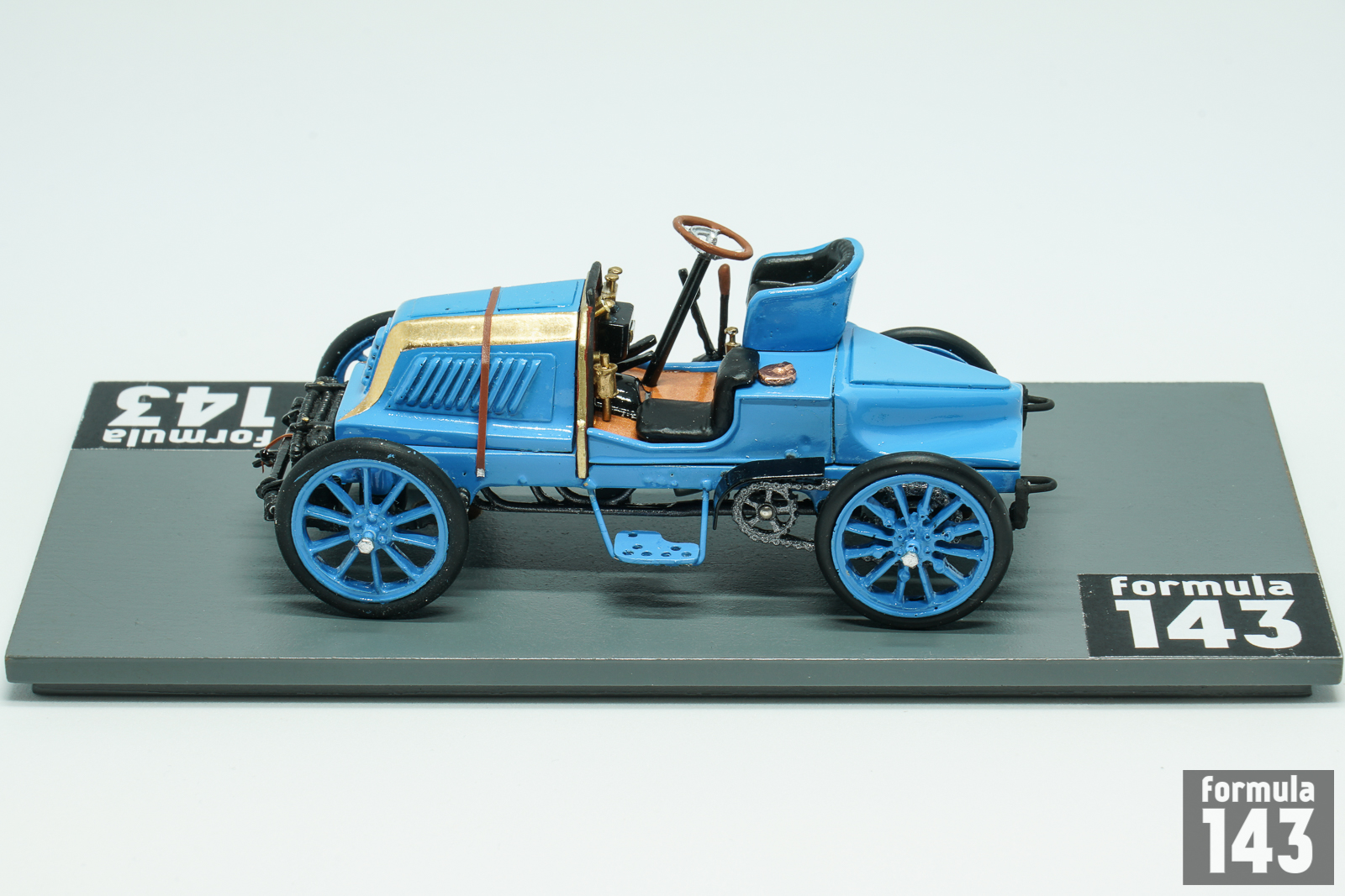 In the beginning of 1900s the principal rivals in major motor racing events were Panhard Levassor and Mors companies. In 1901 Mors dominated the scene when Henri Fournier in 60 hp Mors won both biggest city-to-city races of the year – Paris – Bordeaux and Paris – Berlin races. Panhard Levassor in its hand took II Coupe Internacionale (II Gordon Bennett Trophy) with Leon Girardot. In 1902 new formula for Heavy Racing Cars Class was introduced (1,000 kilogram weight limit plus an extra 7 kilograms for magneto ignition) in an attempt to reduce the furious speeds of 1901. Manufacturers responded with more horsepower than ever in ultra light chassis. Mors Z built according to heavy cars restrictions was powered by 9236 cc four-cylinder engine with magneto ignition developing 60 hp at 1400 rpm. Not matching the prodigious power of Panhard, Mors chose a more conservative approach: “pneumatic” shock absorbers for better handling and a mechanically efficient direct drive top gear to redress Panhard’s horse power advantage. In the major race of 1902, Paris – Vienna, the squad of six Mors Z cars appeared driven by Henri Fournier, Fernand Gabriel, Baron Pierre de Caters, Augieres, Foxhall Keene, and Charles Rolls. Henri Fournier took the early lead and covered first 140 km to Troyes with the average speed of 114 kph. Despite such a brave start, 4 out of 6 Mors entries retired. The best car on the finish, that of the Baron de Caters, was placed 9th. The handbuilt model by Jakana is based on de Caters’ car which survived today and is on display in the Miles Collier Collections at Revs Institute in Naples, Florida, USA.