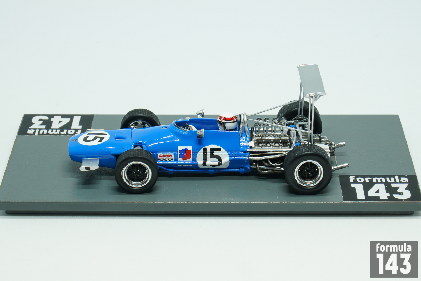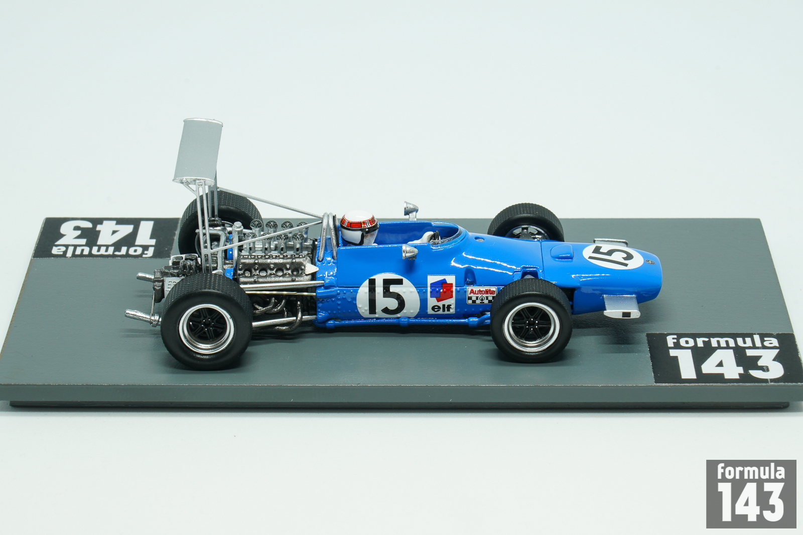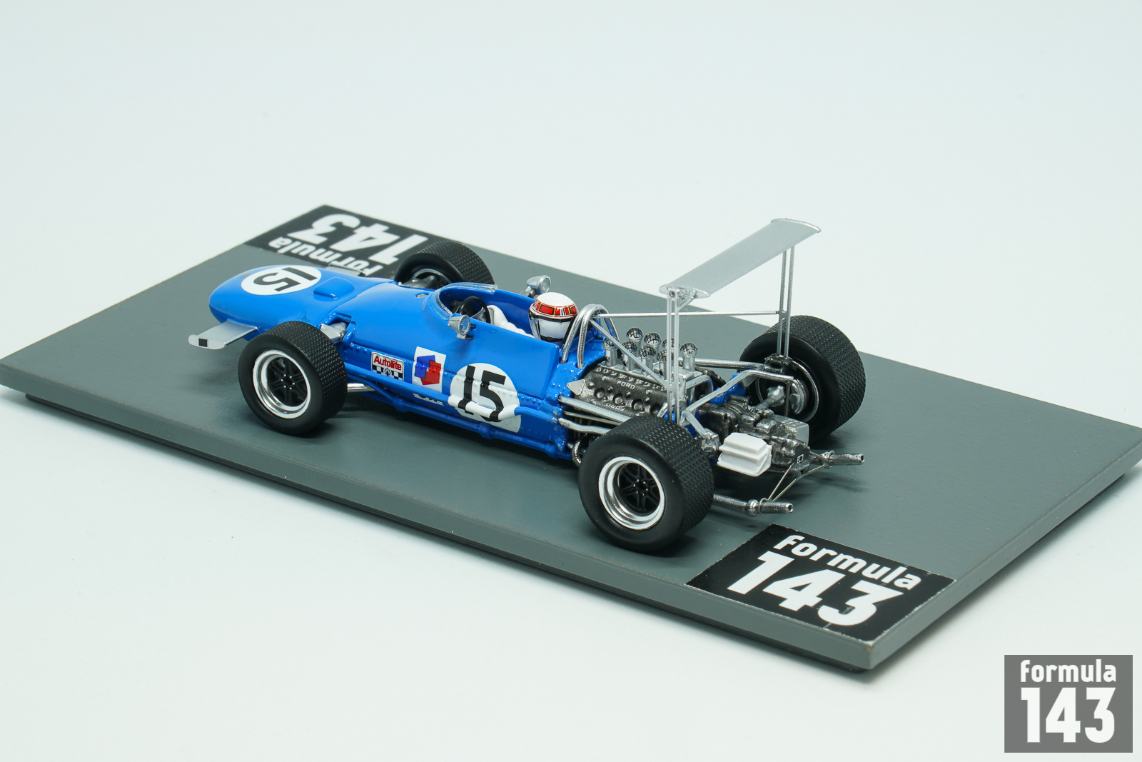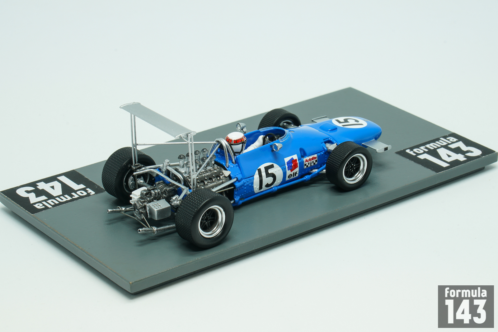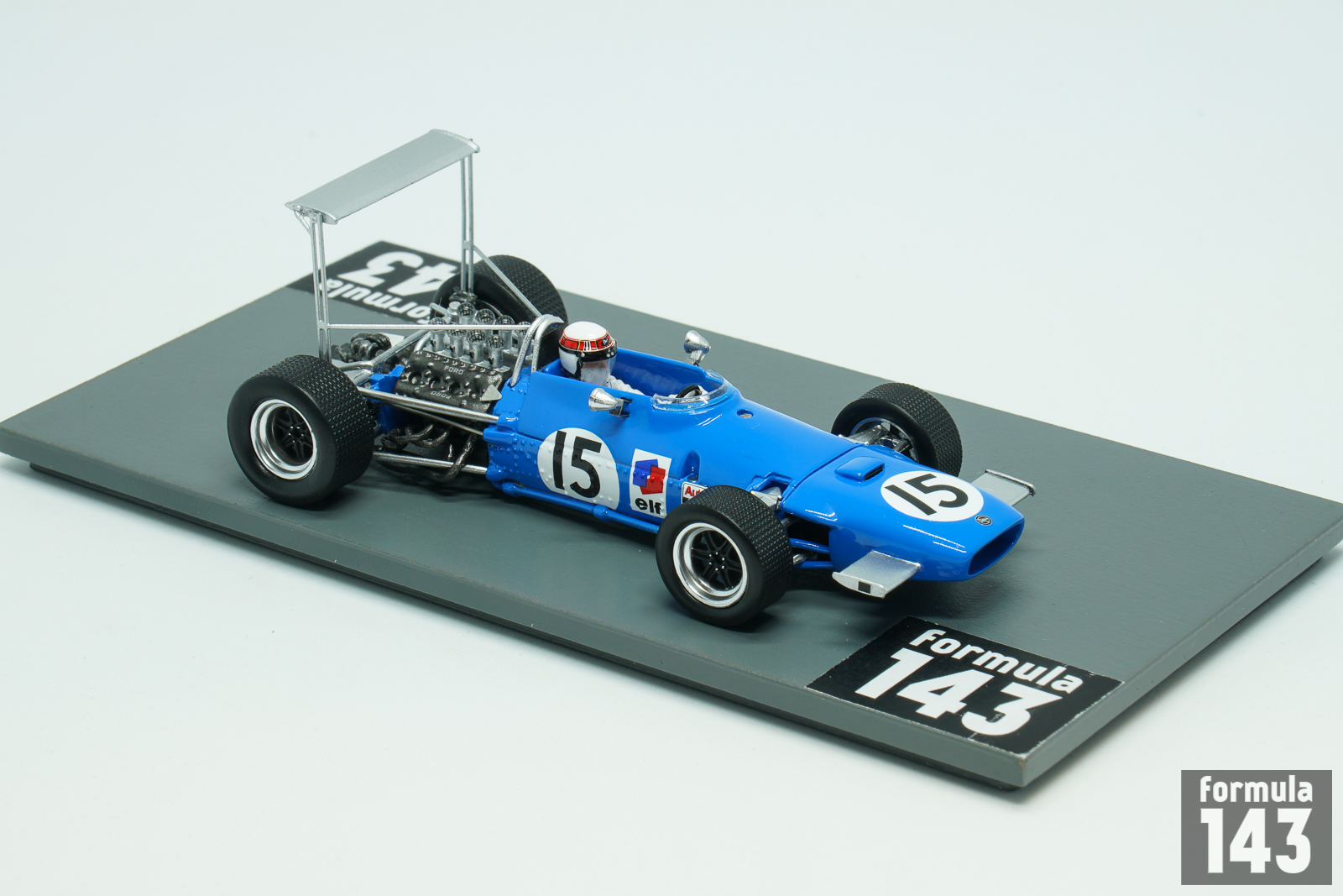 The MS10 was the first Formula 1 purpose-built car by Matra. At the insistence of Ken Tyrrell, who was running Matra F2 cars in 1967, the car was powered by V8 Ford Cosworth DFV engine, while the car with original Matra V12 motor was indexed as MS11. In 1968 Matra International, a new joint venture established between Tyrrell’s own privateer team and the Matra, used MS10, and Matra Sports, the works team, raced MS11. Tyrrrel’s squad lead by Jackie Stewart was much more successful. The Scotsman took the 2nd place in the Drivers’ Championship winning 3 Grand Prix races, including USA GP at Watkins Glen which is represented by this scale model.