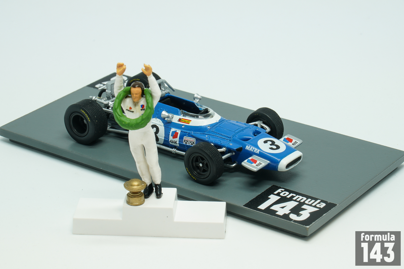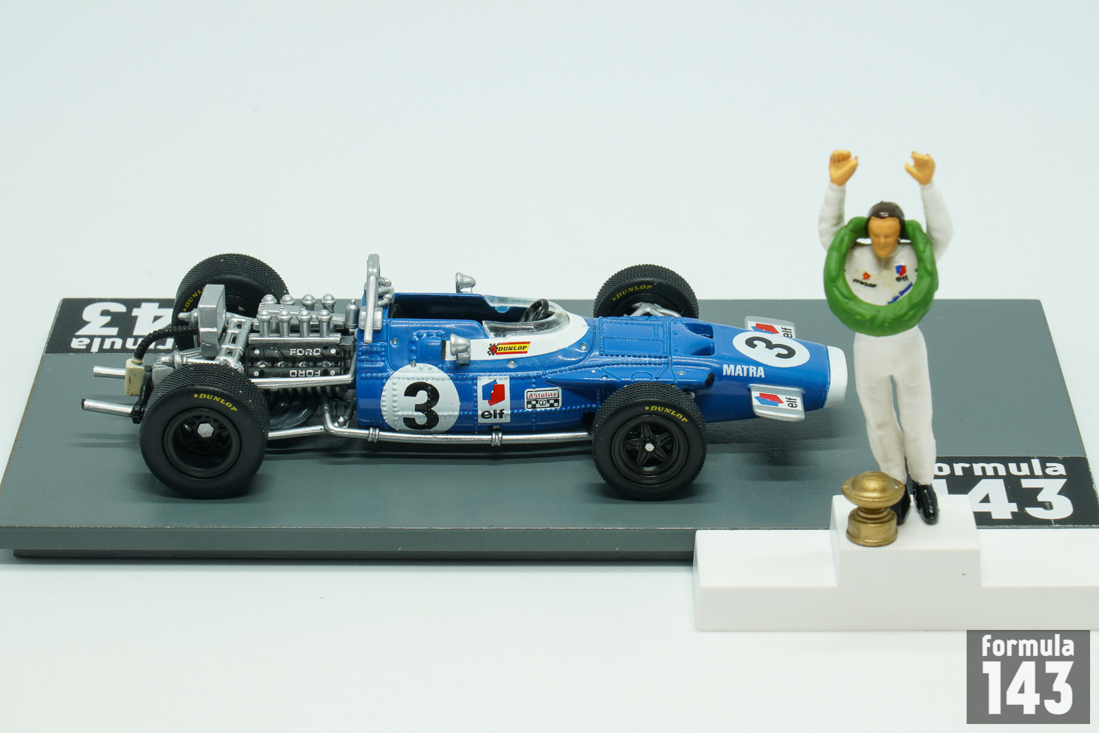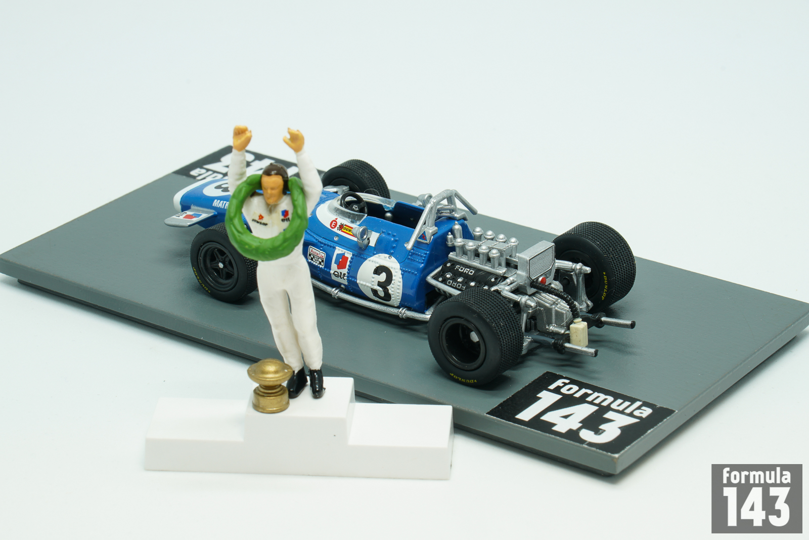 Matra MS80 was the fourth car produced by French team since it entered F1 scene in the previous season. The car was powered by Ford Cosworth DFV 3000 cc engine capable of around 420 bhp. A major change from the MS10 was the location of the fuel cell, which was moved from behind the driver and placed in sidepods by the driver’s hips. Drivers of Matra International in the 1969 season were Jacky Stewart and Jean-Pierre Beltoise who teamed up for the second consecutive year. Stewart drove the car to victories in 6 out of 11 Championship rounds and took his first Driver’s title. Beltoise achieved two podium finishes at Spain and Italy which was enough to secure the Constructors Championships for the Matra team. This model is Stewart’s Matra from the practice of British Grand Prix where MS80 run without rear wing to test extra downforce. The model with the driver on podium was issued by Quartzo in a World Champions Series limited edition. See also the same model from RBA Collection.
