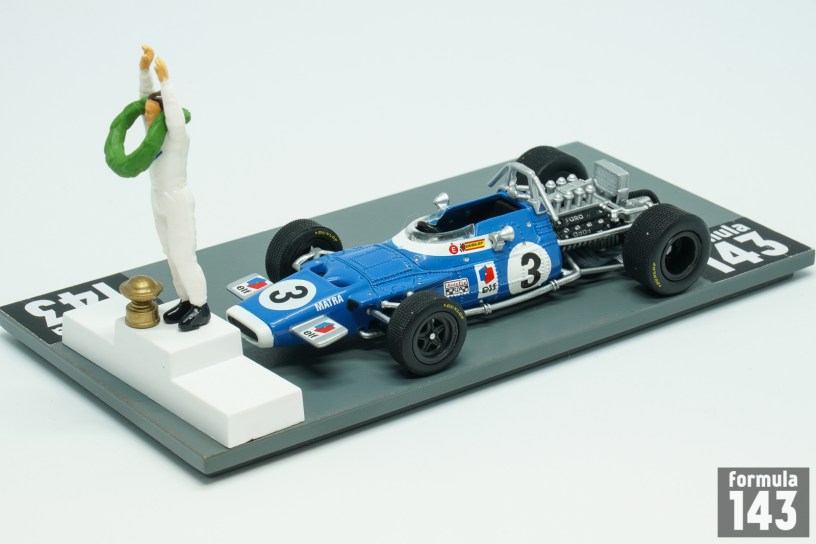 Matra MS80 was the fourth car produced by French team since it entered F1 scene in the previous season. The car was powered by Ford Cosworth DFV 3000 cc engine capable of around 420 bhp. A major change from the MS10 was the location of the fuel cell, which was moved from behind the driver and placed in sidepods by the driver’s hips. Drivers of Matra International in the 1969 season were Jacky Stewart and Jean-Pierre Beltoise who teamed up for the second consecutive year. Stewart drove the car to victories in 6 out of 11 Championship rounds and took his first Driver’s title. Beltoise achieved two podium finishes at Spain and Italy which was enough to secure the Constructors Championships for the Matra team. This model is Stewart’s Matra from the practice of British Grand Prix where MS80 run without rear wing to test extra downforce. The model with the driver on podium was issued by Quartzo in a World Champions Series limited edition. See also the same model from RBA Collection.