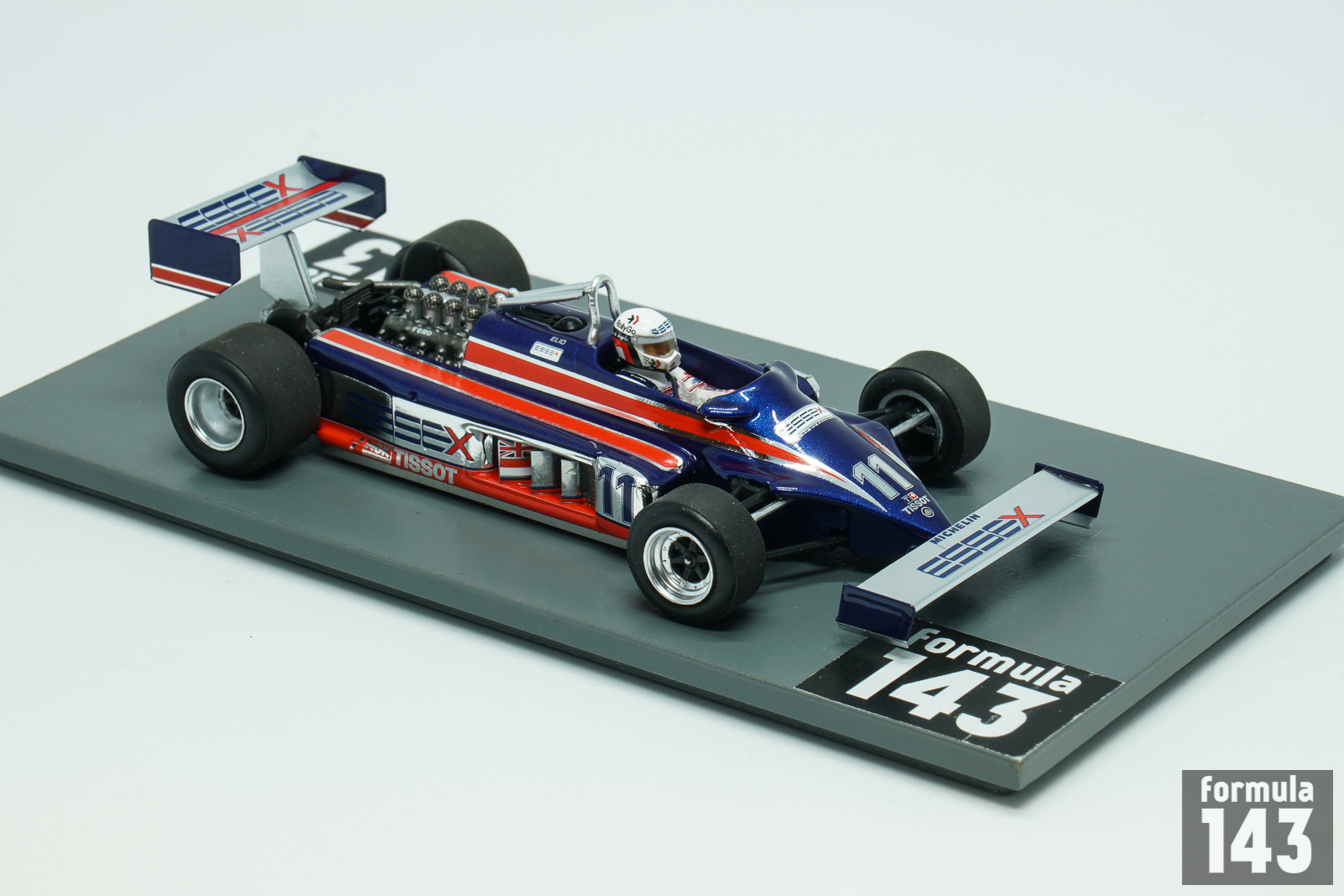 The Lotus team originally planned to use Chapman’s ambitious twin-chassis Lotus 88 in the 1981 F1 season, but after the car was outlawed, it was rebuilt to become the more conservative 87. Designed by Martin Ogilvie (Chief Designer) and Peter Wright (Aerodynamics) under supervision of Colin Chapman as technical director, the 87 was the first Lotus chassis used carbon fibre and kevlar monocoque. The power was provided by ubiquitous Ford Cosworth DFV. The car was not able to fight for victories, but Lotus drivers Elio de Angelis and Nigel Mansell were regular point scorers. De Angelis had gathered 14 points which placed him on 8th position in the final Drivers’ Championship standings. Mansell was 14th with 8 points.