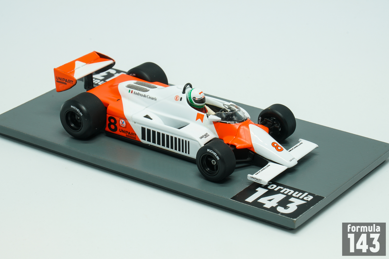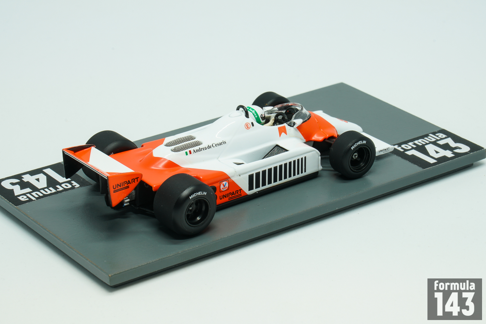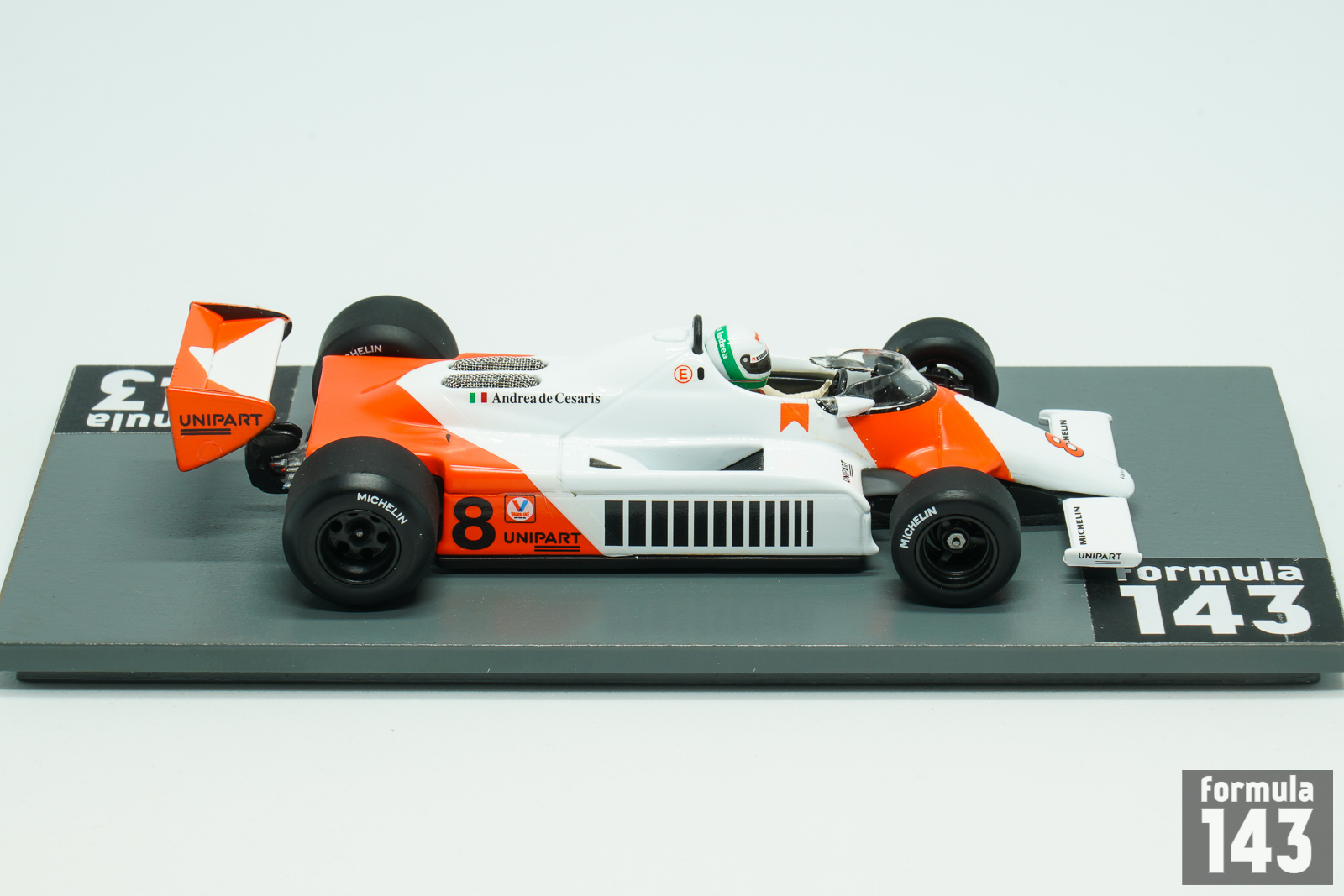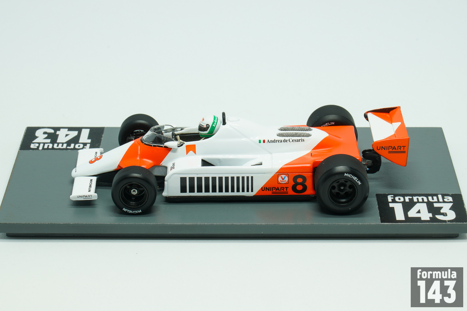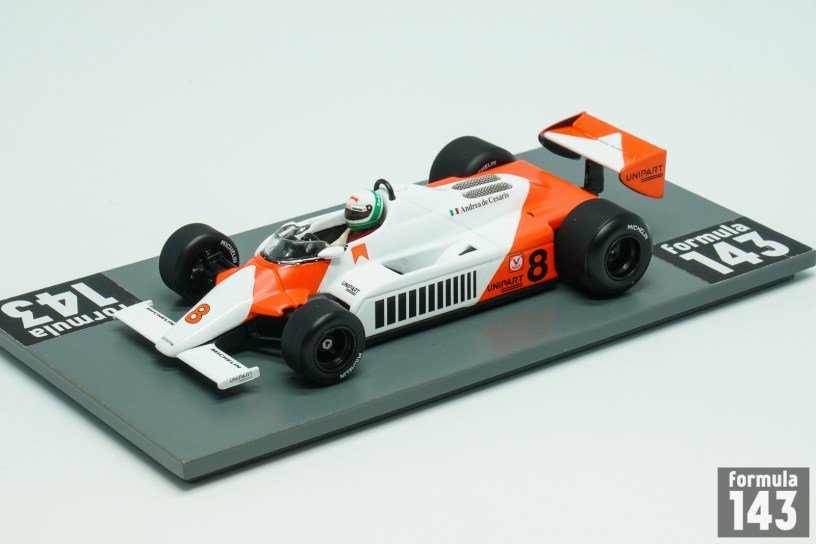 The MP4 was the first Formula 1 car o use a monocoque chassis wholly manufactured from carbon fibre composite. John Barnard’s design has been made to life following the merger of the McLaren team and Ron Dennis’ Project 4 Formula 2 team. The model designation was short for “Marlboro Project 4”. McLaren drivers John Watson and Andrea de Cesaris drove the MP4/1 for most of the 1981 season. Watson was able to bring a single victory to the team in 1981 winning the British GP. His partner, young Italian Andrea de Cesaris, who was in his first full season in Formula 1, usually retired or finished outside first 6. His only point in that season was for 6th place in San Marino GP when he drove M29F, the predecessor of MP4.
