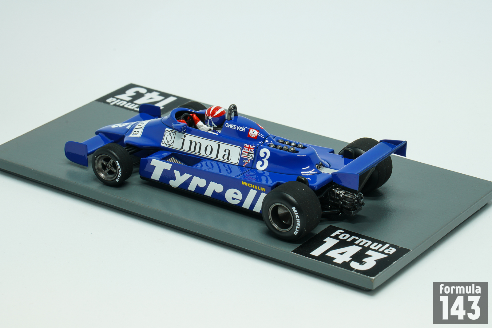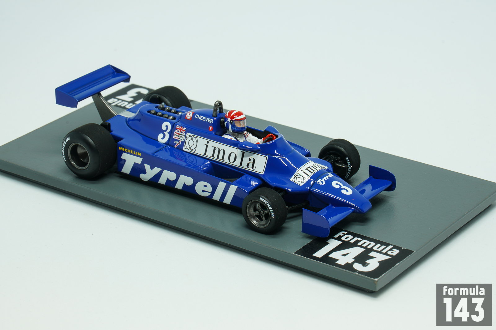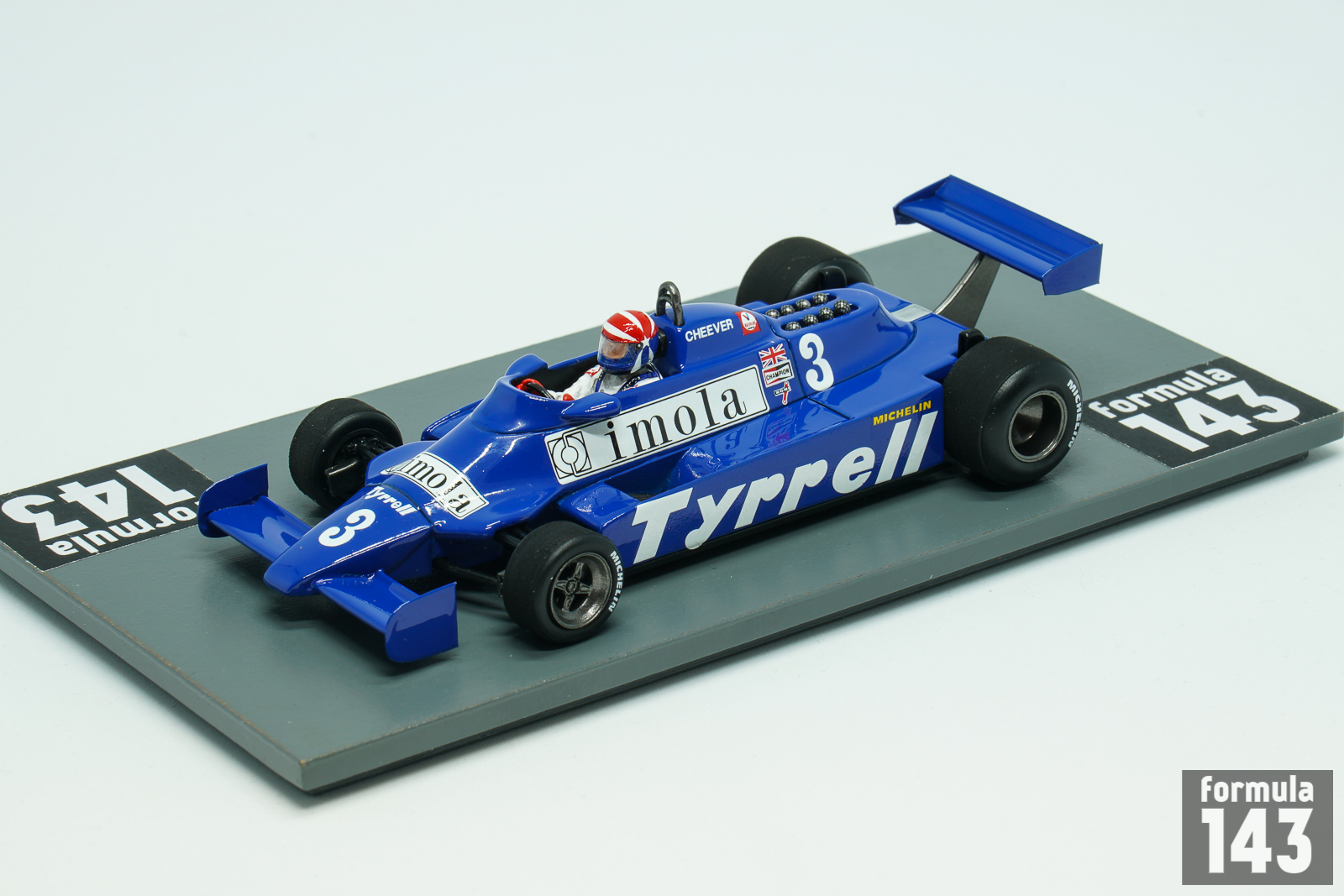 Tyrrell 010 designed by Maurice Philippe was run by team Tyrrell in 1980 and in first half of the 1981 Formula One season. The carbon fibre monococque chassis and Ford-Cosworth DFV engine were conventional car features. Team Tyrrell in 1981 was significantly underfunded through withdrawal of Candy sponsorship. The drivers’ roster was also changed – 1980 drivers Jean-Pierre Jarier and Derek Daly left, and young American Eddie Cheever was hired from Osella. Second car was driven by Kevin Cogan and Riccardo Zununo in first three races until Italian F1 debutant and European F3 champion Michele Alboreto joined the team starting from San Marino Grand Prix. Alboreto did not score points in 1981 while Cheever has gathered few points regularly. His best finish was 4th place at the British Grand Prix. The scale model represents Cheveer’s 010 from Monaco Grand Prix where American was 5th.