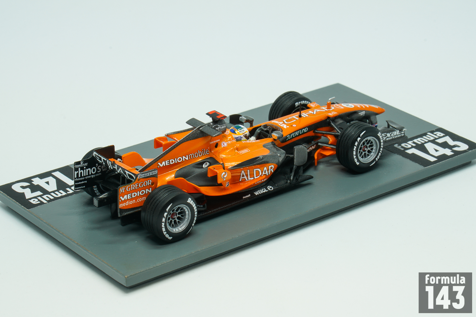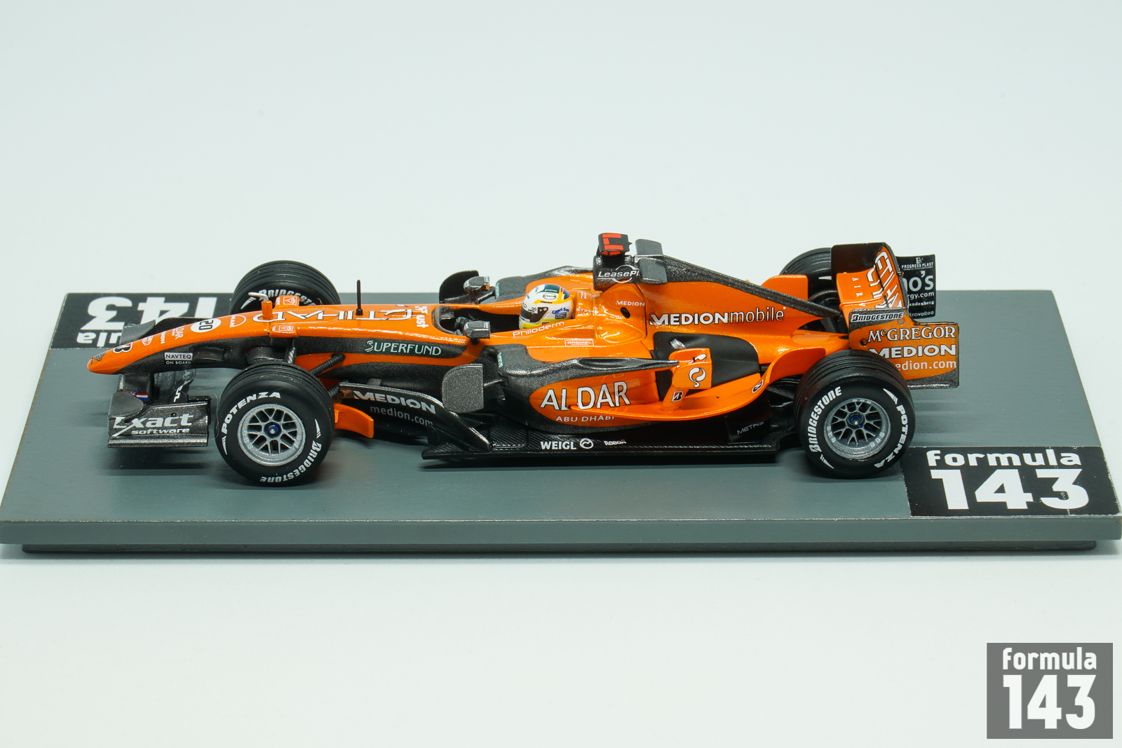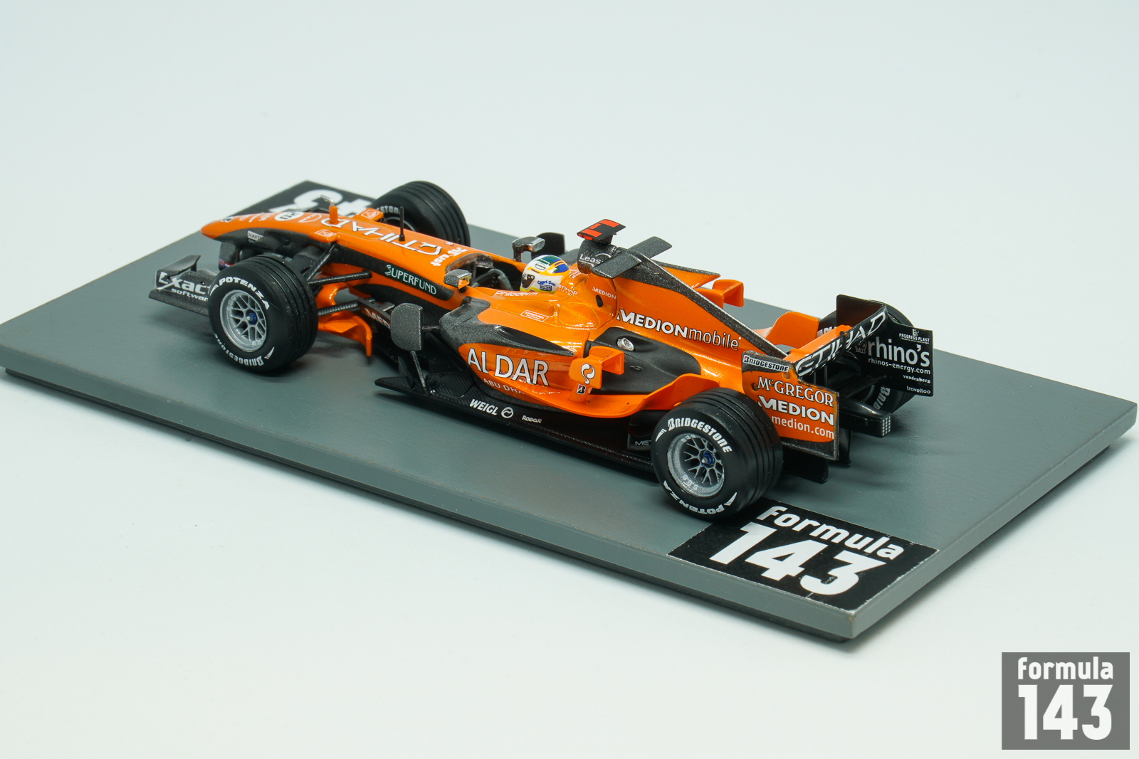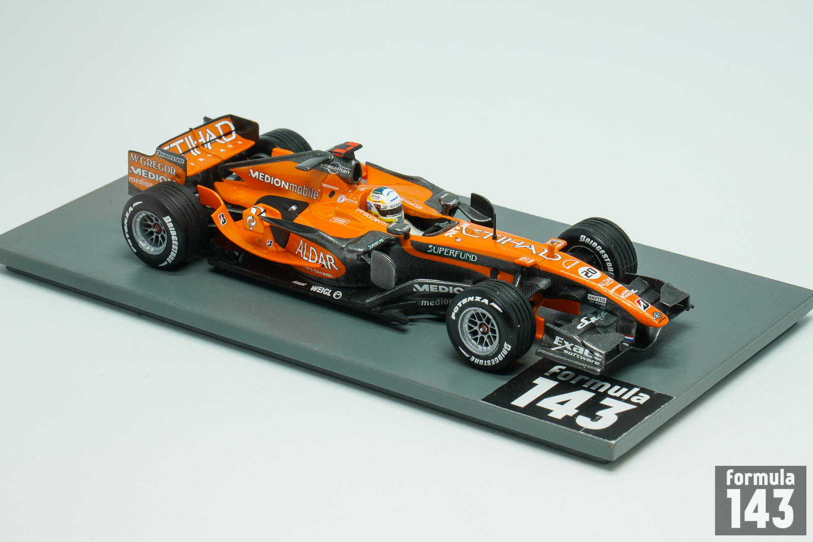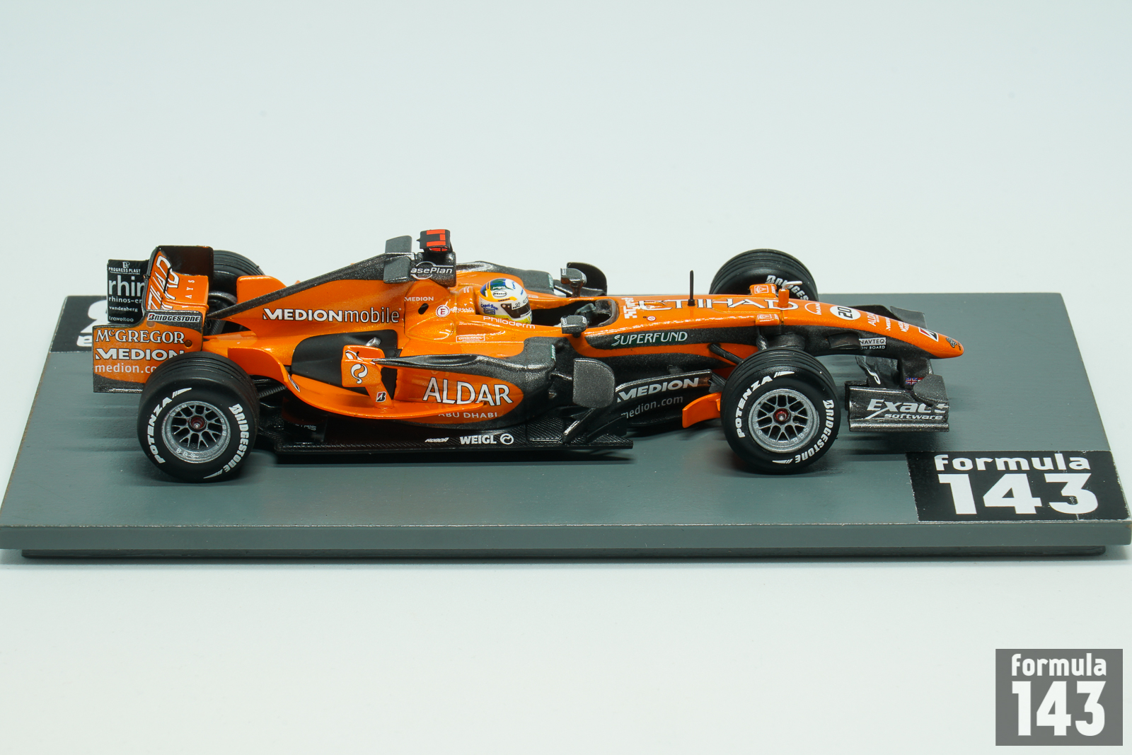 Spyker F1 Team was formed by Dutch sports car manufacturer Spyker Cars in September 2007 by buyout of Midland F1, which, it its turn, was created in 2006 by purchasing Jordan Grand Prix. The 2007 was the first (and last) full F1 season for the team. So, the F8-VII was the only car constructed by Spyker F1 in their own right. The car was powered by Ferrari V8 naturally aspirated engine and was painted in Dutch orange-and-silver livery. The drivers were Christijan Albers, who drove in 2006 for Midland, and German Adrian Sutil, F1 debutant and Midland test driver in 2006. Albers was out-performed by Sutil and after British GP was released from his Spyker contract, due to a lack of sponsorship money. His place was taken by Markus Winkelchock for one-off drive, and then Sakon Yamamoto filled the seat. Midway of the 2007 season the “B” specification of F8-VII was launched, and Sutil scored Spyker’s one and only point in the Japanese Grand Prix at the wheel of F8-VIIB.