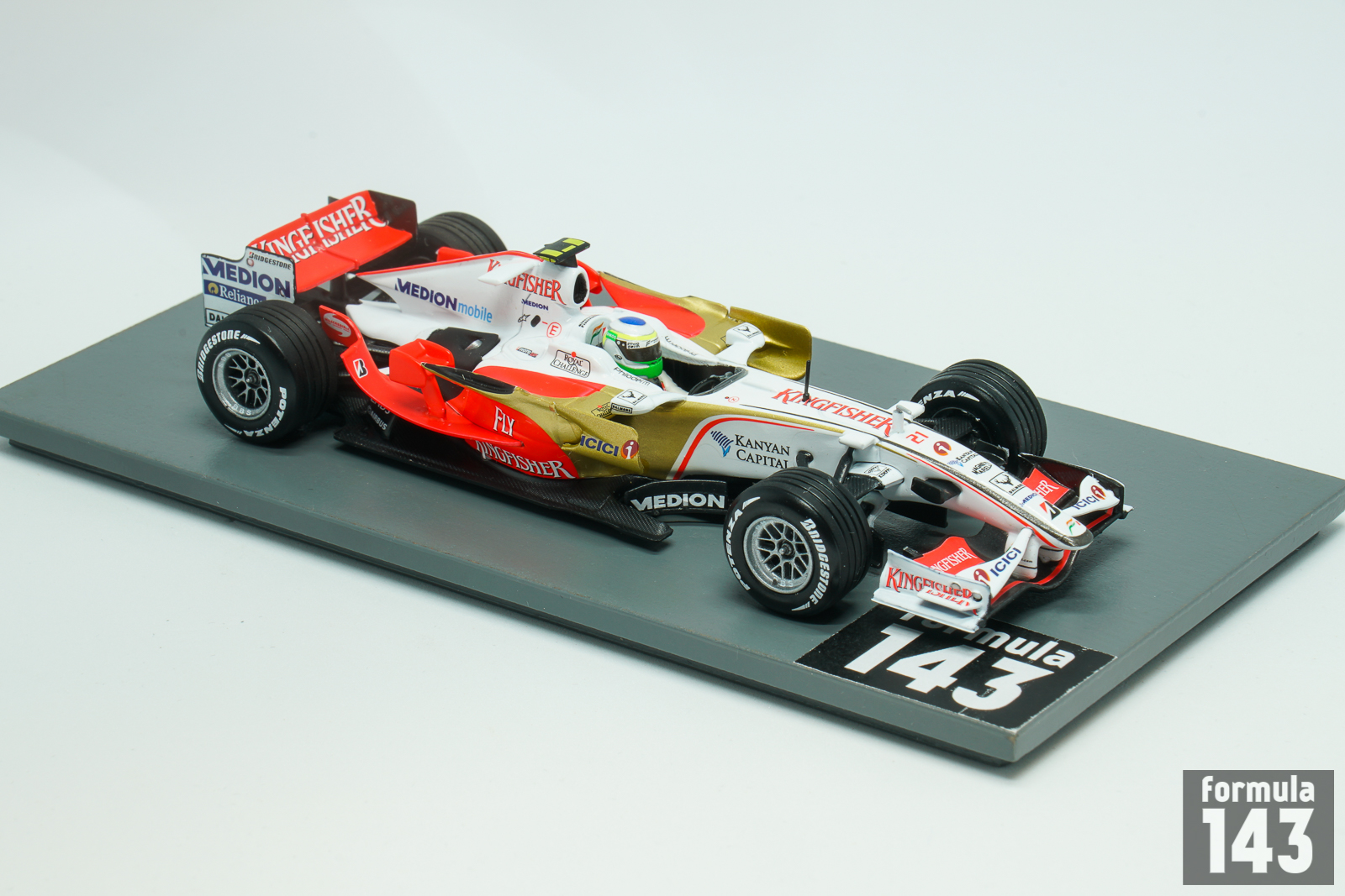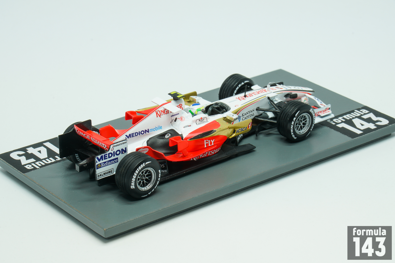 In October 2007 Indian businessman Vijay Mallya bought the Spyker F1 team (ex-Midland, ex-Jordan) and formed new Force India Formula One Team, which raced under Indian license and was based in Silverstone. The first Force India car, named VJM01 after initials of team principal, was slightly modified 2007 Spyker V8-VIIB. It was powered by Ferrari 056 engine developed 750 hp, but used 2007-spec engines instead of 2008-specification. The sponsorship came from Mallya owned Kingfisher Airlines (now defunct). In the driver line-up Adrian Sutil, who drove for Spyker, was joined by experienced Italian Giancarlo Fisichella. The first season for the Indian team was disappointing. Both drivers failed to score a single point. Fisichella achieved the best finish of tenth at the Spanish Grand Prix, and Sutil’s best was 13th place in Belgium.