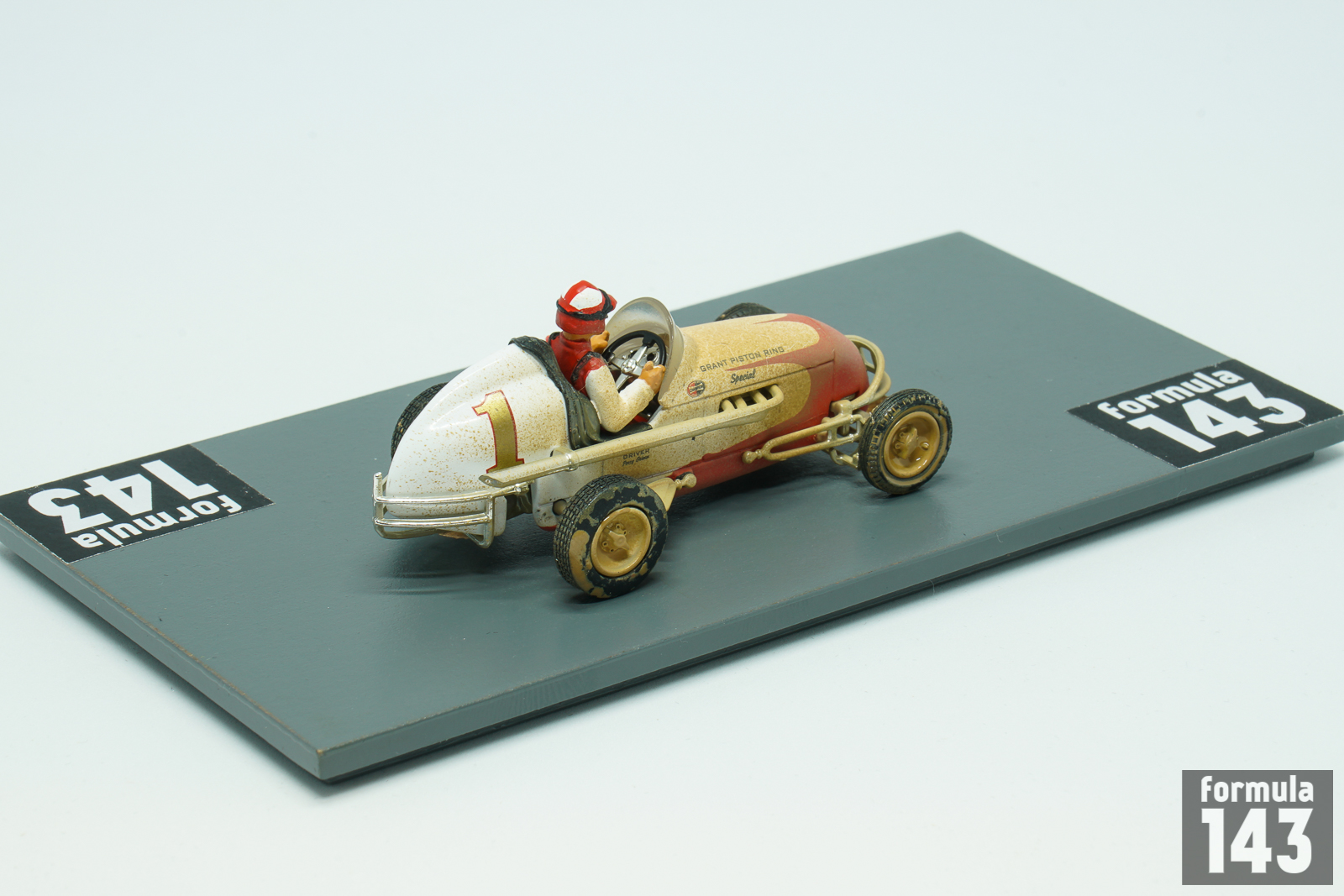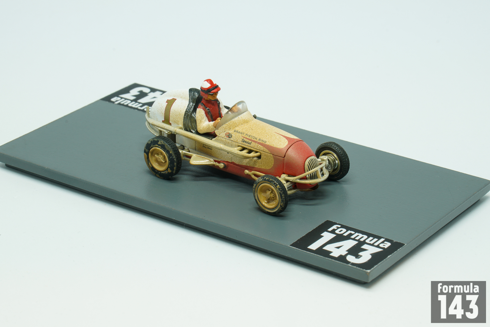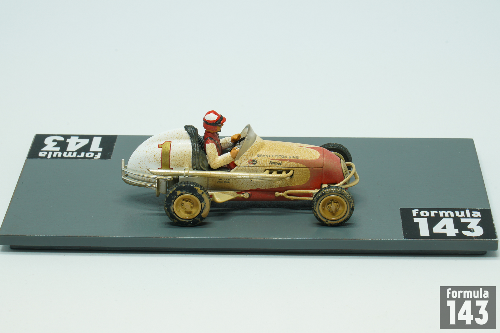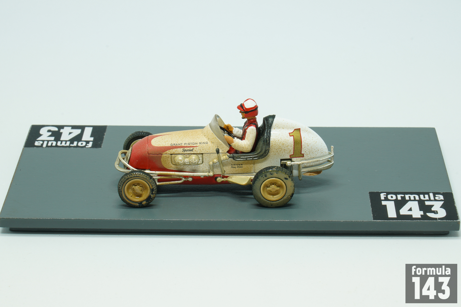 Perry Grimm’s Offy midget is 3rd model car of GMP “Gilmore Stadium Midget Series” issued in the beginning of 2000s to commemorate the 50th anniversary of the Stadium demolishing. Grimm was one of the best midget drivers of the 1940s. Resided in Los Angeles, he raced on the West Coast of the United States in the UMA (United Midget Association) series, but appeared in events all over the country. In 1941 and 1945 he won the Fort Miami Speedway Track Championship in Toledo, Ohio. One of his most spectacular performance was his third-place finish at York’s Roosevelt Raceway open competition show in 1939 when he drove the last 55 miles of the 150-miler with a flat tire. In the late 40s Grimm drove for the Vic Edelbrock’ team. In 1946 he won the Turkey Night Grand Prix at Gilmore Stadium. Grimm repeated as the winner of the Turkey Night classic in 1949 and won the Pacific Coast Midget title as well. The 1950 Turkey Night Grand Prix was won by Bill Zaring, while Grimm, who raced 1950 season in car #1, finished 3rd. Grimm’s 1950 car modeled by GMP is the typical Kurtis Kraft chassis powered by V8 Offy. While for many drivers midget racing was just a step of their careers to promote to higher levels of open-wheel racing, Grimm, like Danny Oakes, raced mostly in midgets and did not achieve any success in bigger cars. Grimm’s only appearance in the big car National Championship was 1952 Indy-500 when he passed rookie test in the #55 Ansted Rotary Engine Special Stevens – Offy, but did not qualify.