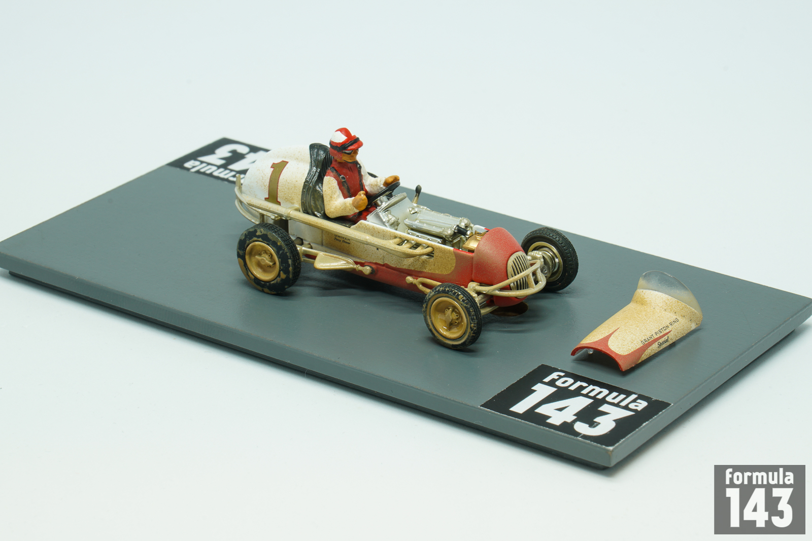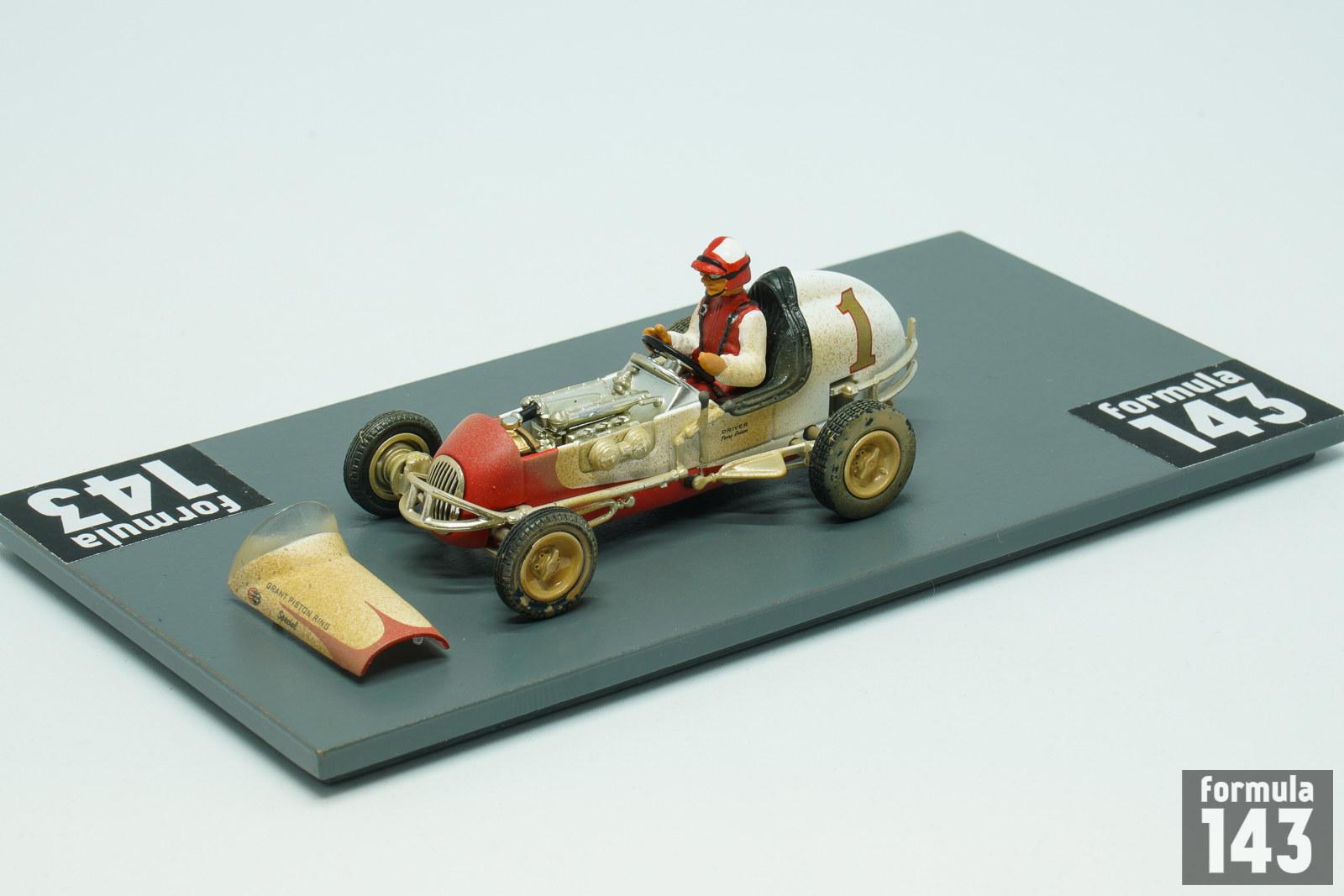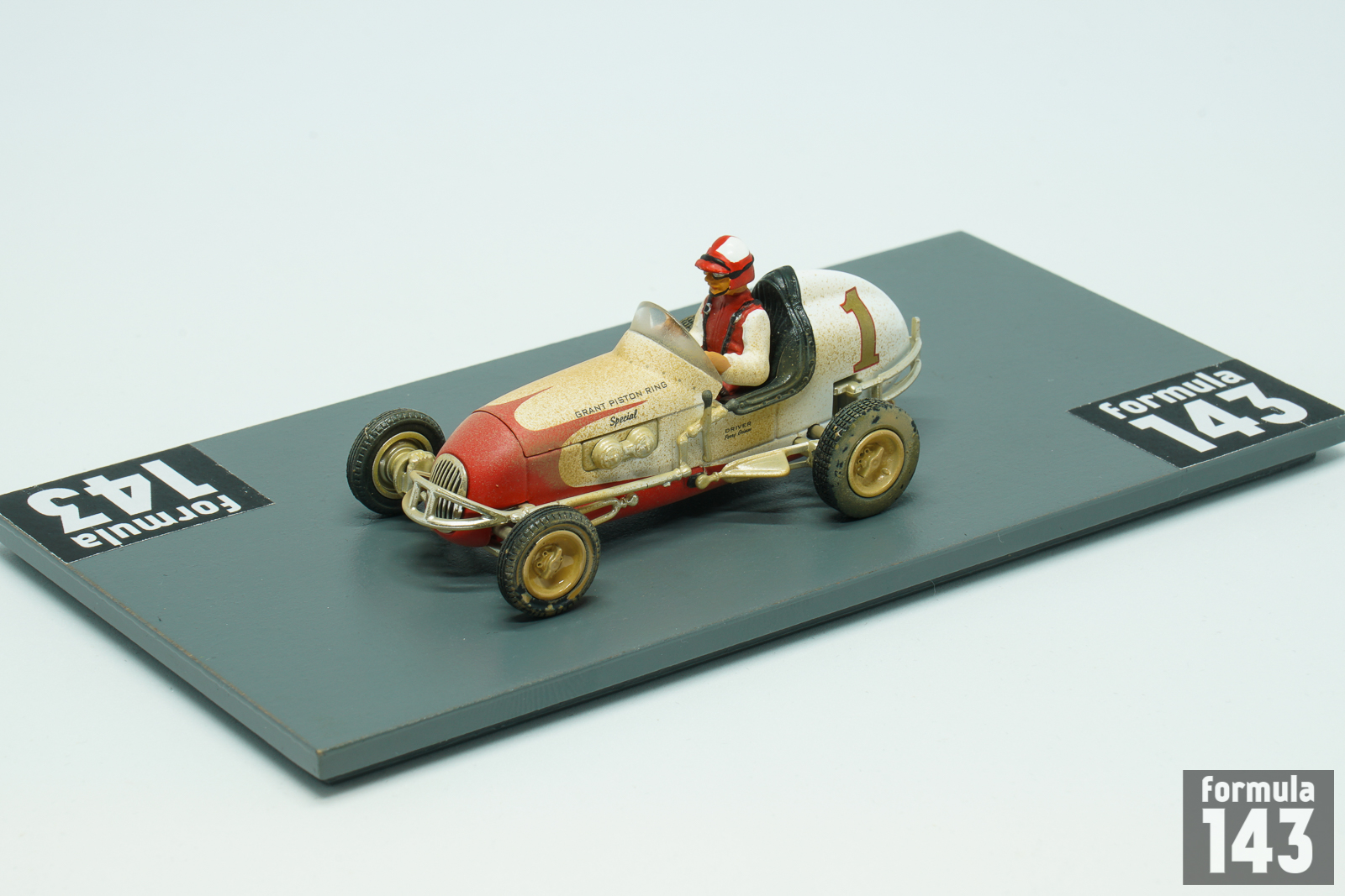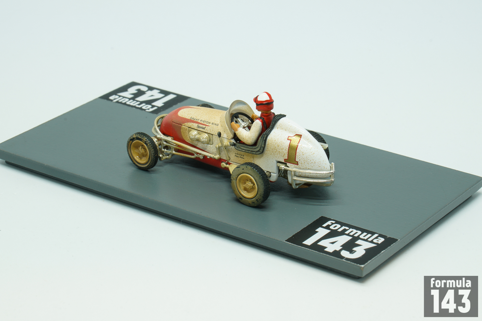 Perry Grimm’s Offy midget is 3rd model car of GMP “Gilmore Stadium Midget Series” issued in the beginning of 2000s to commemorate the 50th anniversary of the Stadium demolishing. Grimm was one of the best midget drivers of the 1940s. Resided in Los Angeles, he raced on the West Coast of the United States in the UMA (United Midget Association) series, but appeared in events all over the country. In 1941 and 1945 he won the Fort Miami Speedway Track Championship in Toledo, Ohio. One of his most spectacular performance was his third-place finish at York’s Roosevelt Raceway open competition show in 1939 when he drove the last 55 miles of the 150-miler with a flat tire. In the late 40s Grimm drove for the Vic Edelbrock’ team. In 1946 he won the Turkey Night Grand Prix at Gilmore Stadium. Grimm repeated as the winner of the Turkey Night classic in 1949 and won the Pacific Coast Midget title as well. The 1950 Turkey Night Grand Prix was won by Bill Zaring, while Grimm, who raced 1950 season in car #1, finished 3rd. Grimm’s 1950 car modeled by GMP is the typical Kurtis Kraft chassis powered by V8 Offy. While for many drivers midget racing was just a step of their careers to promote to higher levels of open-wheel racing, Grimm, like Danny Oakes, raced mostly in midgets and did not achieve any success in bigger cars. Grimm’s only appearance in the big car National Championship was 1952 Indy-500 when he passed rookie test in the #55 Ansted Rotary Engine Special Stevens – Offy, but did not qualify.