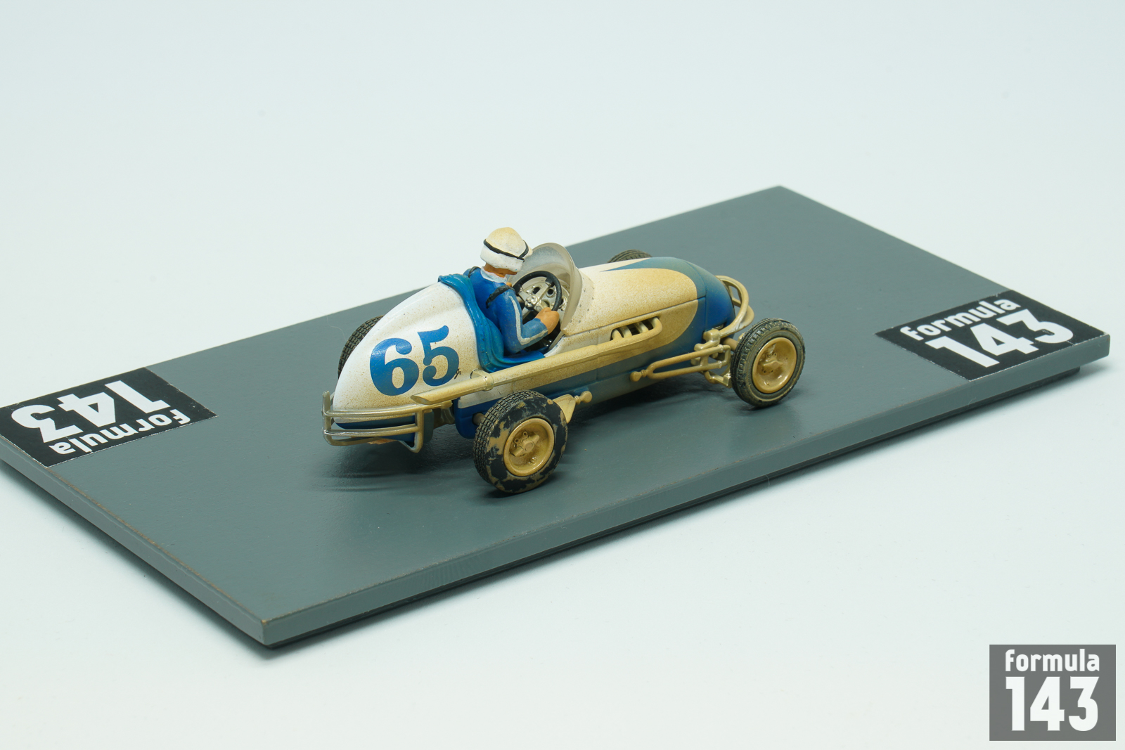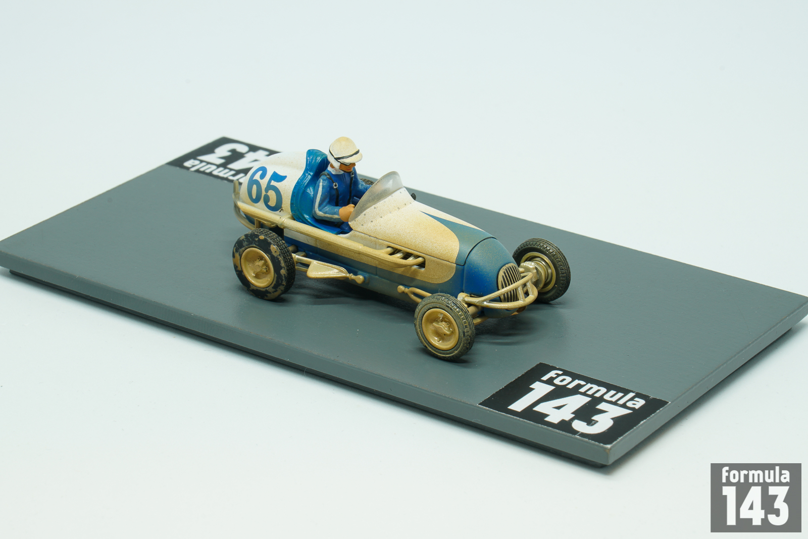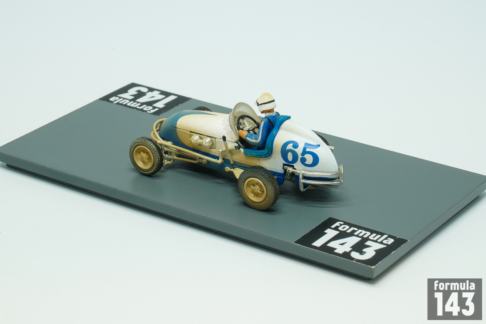 Danny Oakes was born in 1911 in Santa Barbara, California. He began racing in stock cars in 1932, switching to midgets in 1936. Oakes won first post-war Turkey Night Grand Prix at Gilmore Stadium in 1945. In 1947 he won the AAA Pacific Coast Midget Championship and twelve years later repeated the feat under the banner of USAC 1959 Pacific Coast Midget Championship. In the 1950 Turkey Night Grand Prix in his Kurtis Kraft – Offy midget #65 entered by Fullerton Racing Team, Oaks retired in the 25-miles semifinal. However, he was 3rd at Gilmore midget race of January 1st. Oaks continued racing midgets for 25 years until the 60s. After the sanction of the National Midget Championship went from AAA to USAC in 1956, Oaks won three midget events in the USAC National Midget Championship (Detroit and Gailsburg in 1956 and Gardena in 1957). In the 1950s Oaks tried his skills and luck in the big cars as well. He has 6 starts in the AAA National Championship in 1952-1954 with 11th at Springfield in 1954 as his best finish. Oakes failed to qualify for Indy-500 in his three attempts in 1952-54. In 1952 Oakes was entered in Indy-500 with Meyer – Offy and also he stood by as a relief driver for Alberto Ascari in Ferrari. Oaks recalled in one of his late interview in Speedsport Magazine: “I bet I drove 1,300 laps at Indianapolis, but never made the race. One year I was get $500 for being Ascari’s co-driver. I showed up, they disappeared and Ferrari still owes me 500 bucks”. Oakes usually drove in his blue and white jacket, as GMP reproduced it in the scale model.